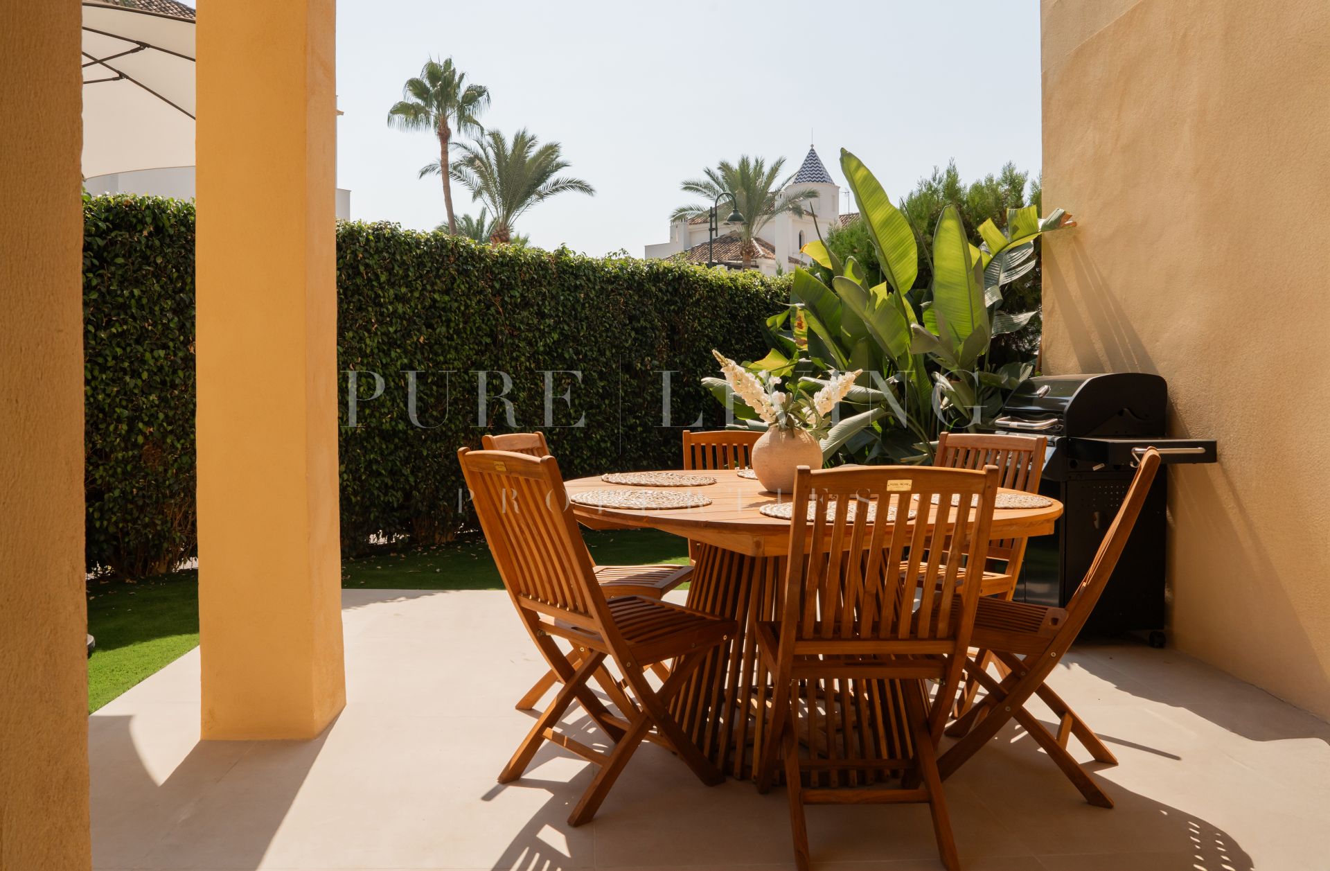 The outdoor areas elevate the lifestyle further: a private pool, lush garden, and both covered and open terraces with a dedicated barbecue space create the perfect setting for relaxation or entertaining in total privacy. An automatic irrigation system keeps the garden flourishing year-round, and the gated community ensures both security and tranquillity.