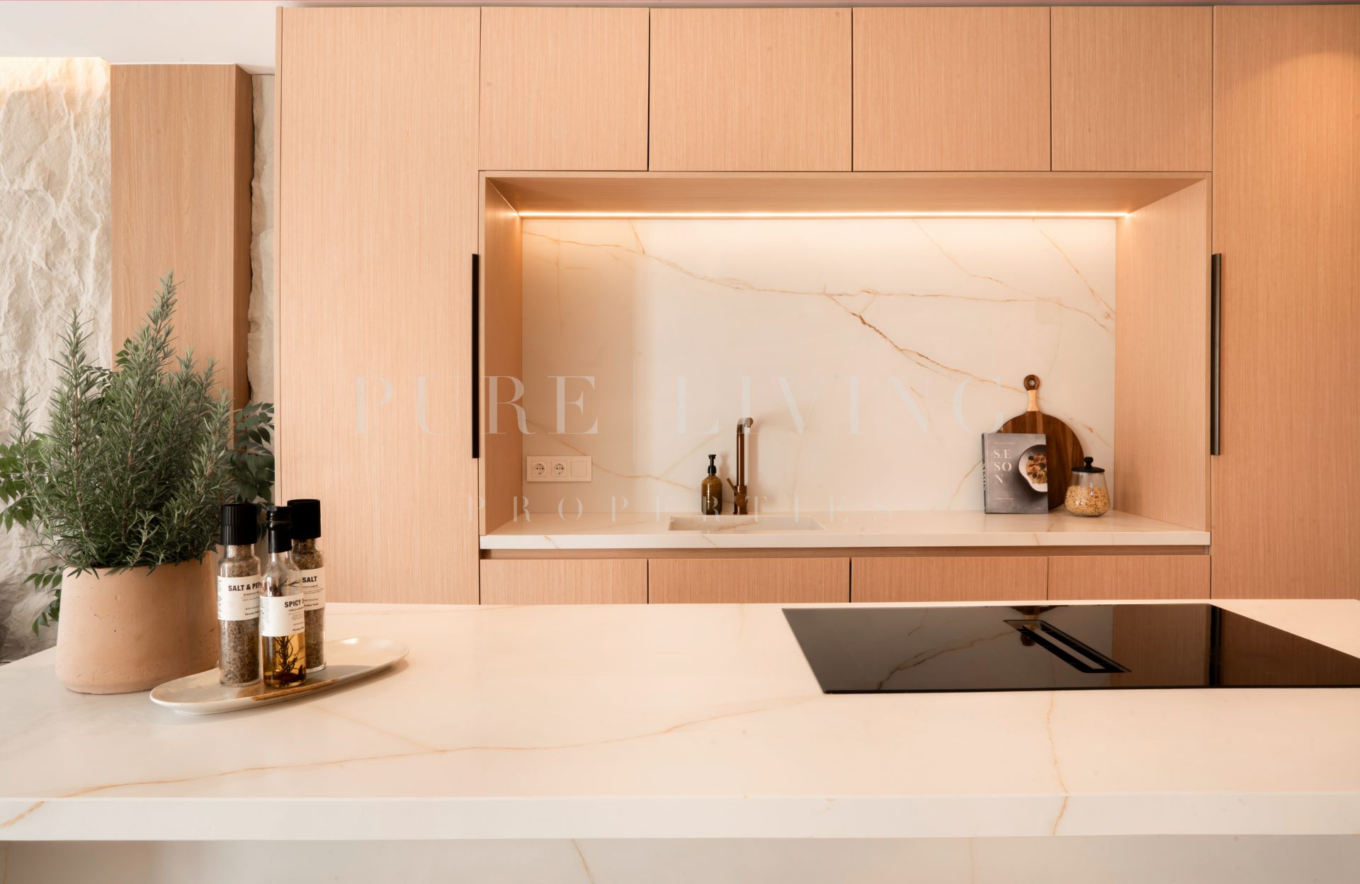 The open-plan kitchen is fully equipped and flows seamlessly into the living and dining areas. Natural stone flooring, expansive glass doors, and generous light create a bright and airy ambiance, while a central air conditioning system with Airzone technology ensures precise climate control in every room. The bathrooms feature underfloor heating for an added touch of comfort.