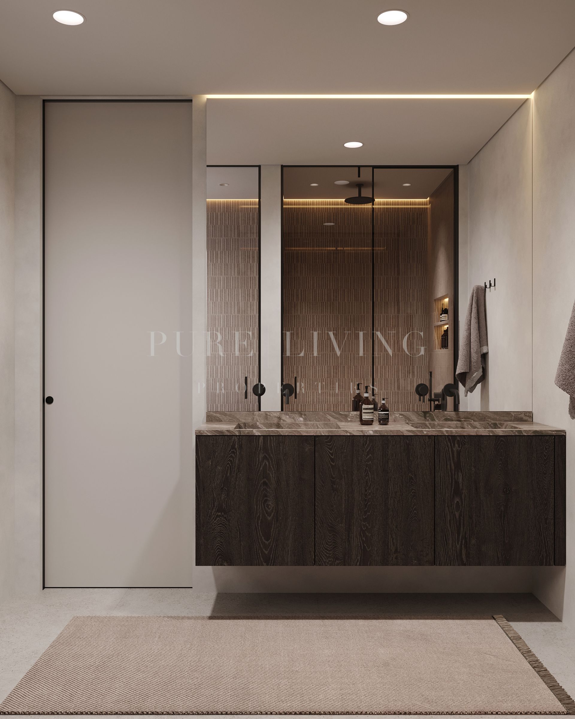 The villa comprises four beautifully appointed en-suite bedrooms. One is conveniently located on the ground floor, while the remaining three—including the spacious master suite with its own private terrace—are situated on the first floor. Floor-to-ceiling windows, a neutral colour palette, and natural materials enhance the sense of light and space across every level.
