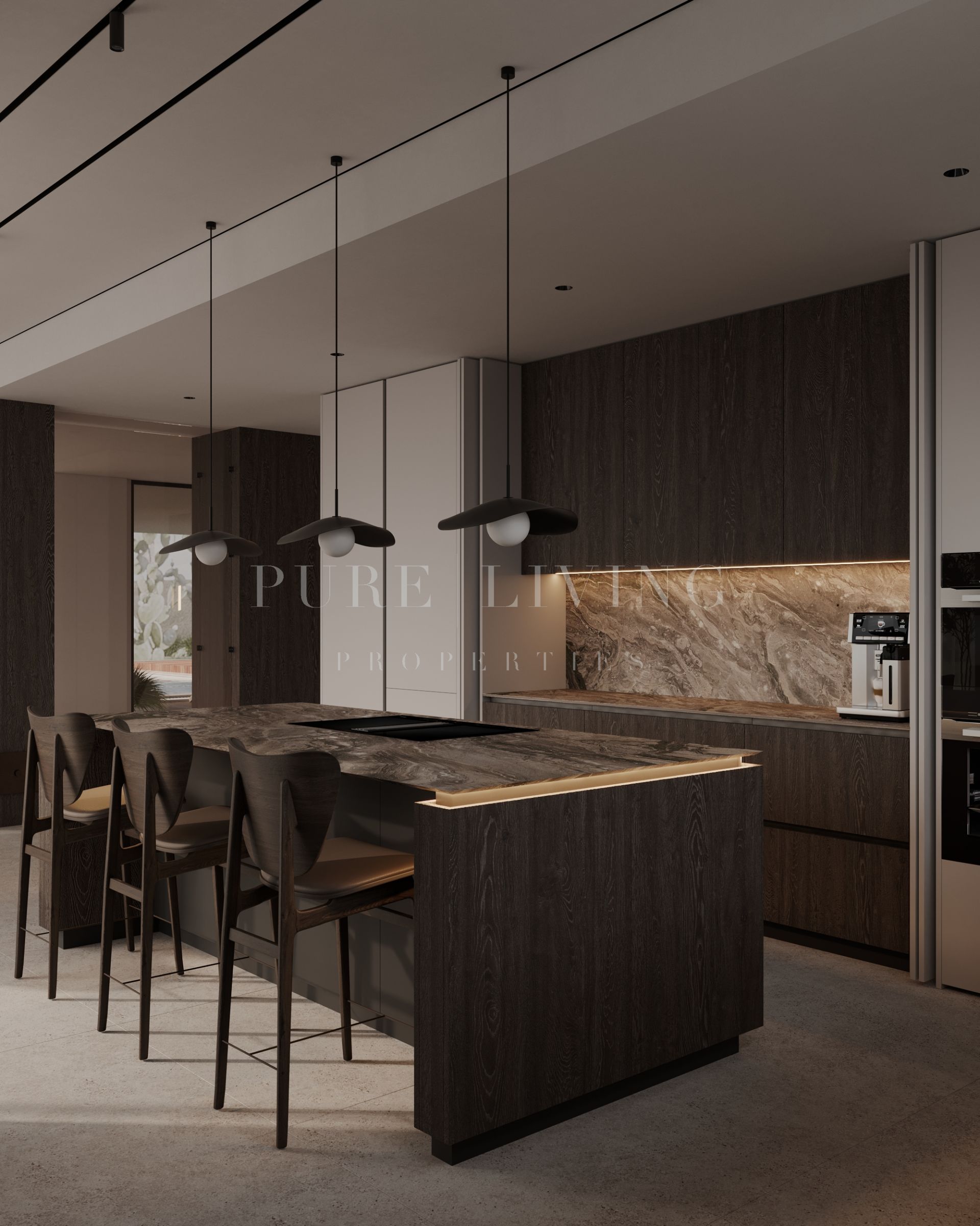 The open-concept kitchen, dining, and living areas are designed for contemporary living, combining functionality with understated elegance. Expansive sliding doors lead to several terraces, a landscaped garden, and a private swimming pool—ideal for year-round enjoyment.