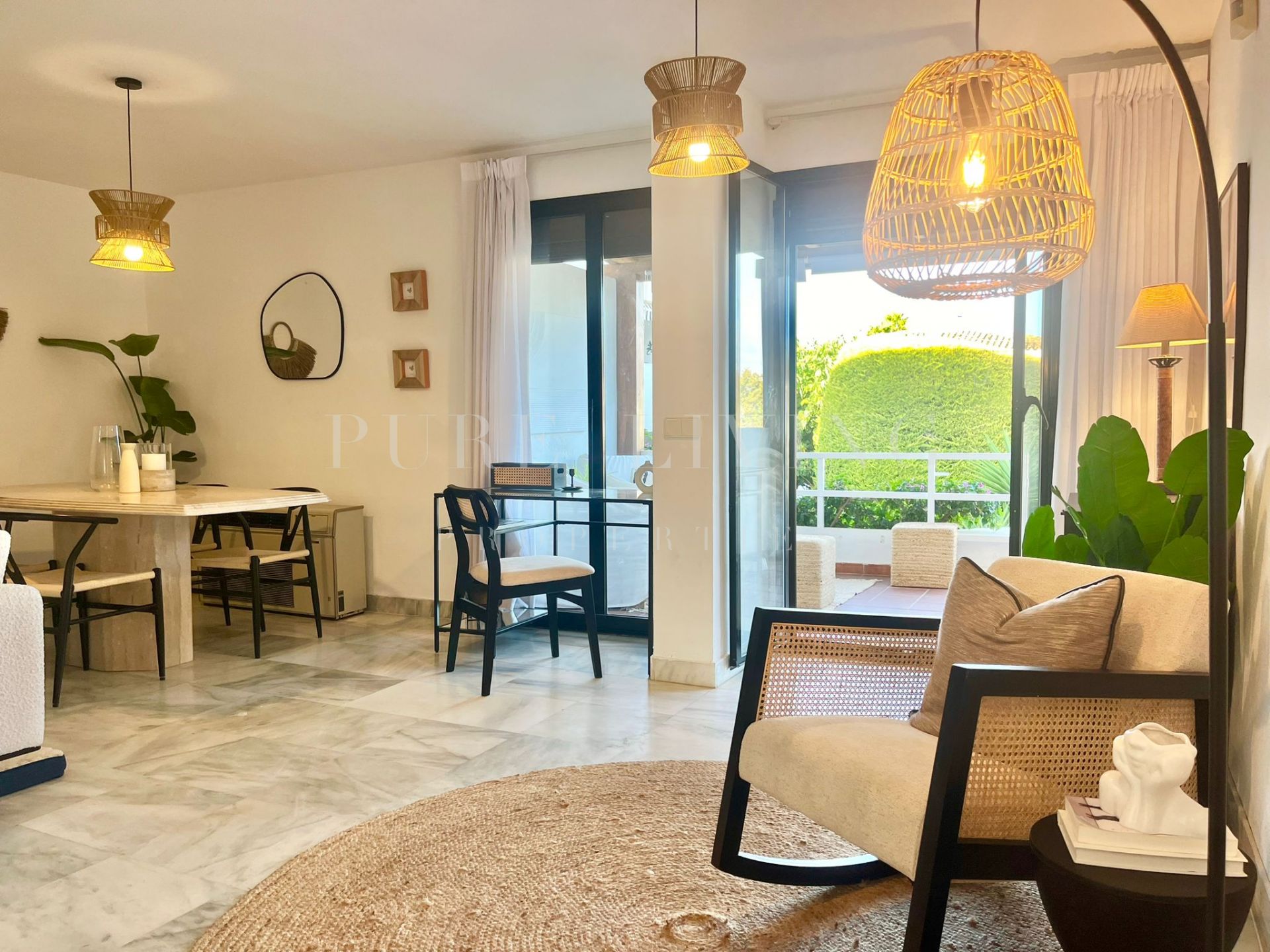 Private terrace, Beach Side, Living room, Amenities near, Transport near, Close to shops, Air conditioning, Close to town, Close to schools, Fully fitted kitchen, Close to children playground, Fireplace, Marble floors, Close to sea / beach, Close to golf, Glass Doors, Guest room, Covered terrace, Optional furniture, Partial sea views, Excellent condition, Dining room, Garden view, Pool view.