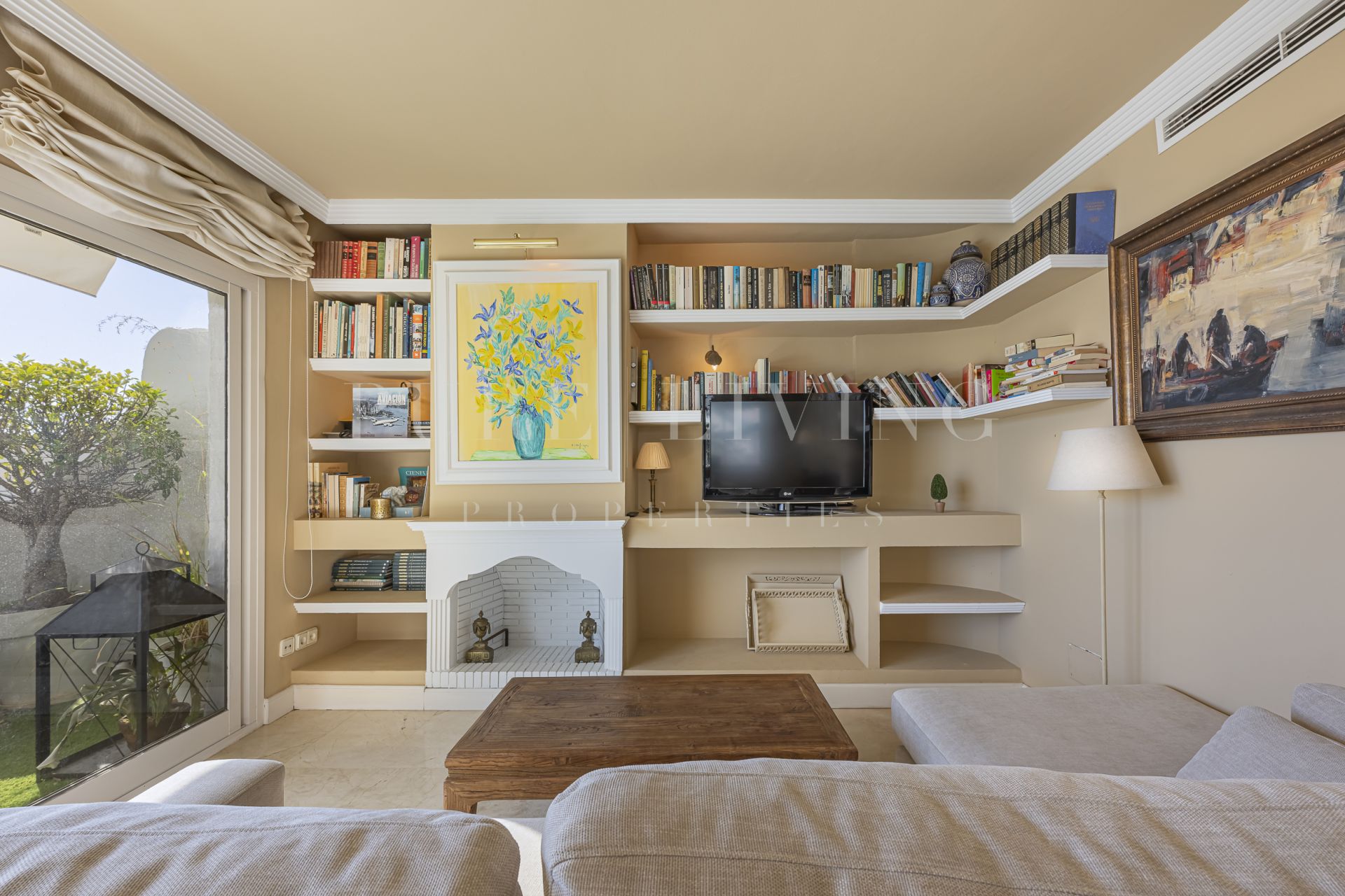 The apartment presents itself with a small entrance hall leading to a spacious and bright living room with fireplace, sitting and dining area. Facing south, the living room offers direct access to a covered terrace, ideal for al fresco dining, and to an uncovered terrace with open views over the communal gardens. The traditional style kitchen is fully equipped and separate from the living room.The large master bedroom is en suite with dressing room and has direct access to the covered terrace. Furthermore, there are two guest bedrooms, one of them en suite, and an additional bathroom for extra comfort.