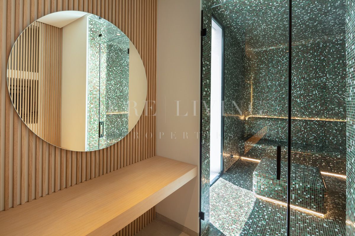 Close to shops, Close to town, Close to schools, Sea view, Surveillance cameras, Underfloor heating (throughout), Automatic irrigation system, Gated community, Garden view, Cinema room, Amenities near, Transport near, Air conditioning, Wine Cellar, Utility room, Fireplace, Close to sea / beach, Sauna, Close to golf, Satellite TV, Glass Doors, Guest room, Open plan kitchen, Double glazing, Brand new.