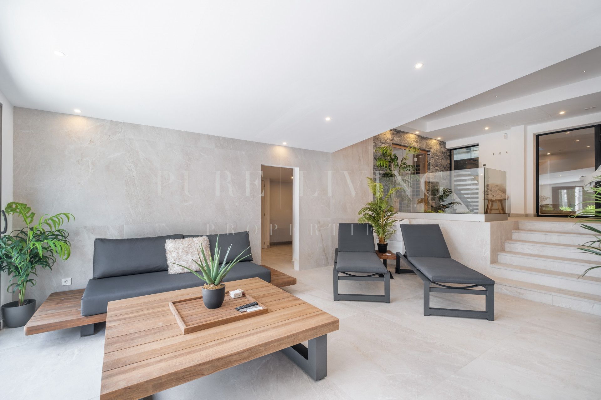 The lower level, finished to the same exceptional standard and benefiting from natural light, features two further guest bedrooms with bathrooms, a comfortable lounge area, a fully equipped laundry room, and a private wellness area complete with sauna and jacuzzi—offering a true spa-like experience at home.