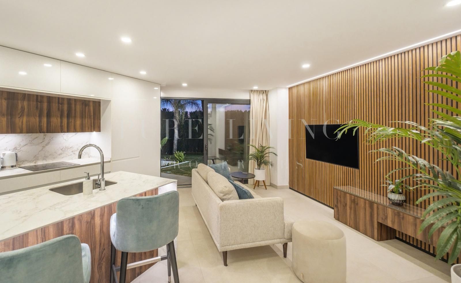 An impressive entrance hall welcomes you into the expansive open-plan living and dining area, where a stylish fireplace creates a warm and sophisticated ambiance. The designer kitchen is beautifully appointed with bespoke cabinetry, high-end Neff appliances, and sleek Silestone countertops. Floor-to-ceiling access from the living area leads to a generous terrace, landscaped private garden, and a stunning heated swimming pool finished with striking emerald-green gresite tiles—creating a serene outdoor oasis ideal for both relaxation and entertaining.