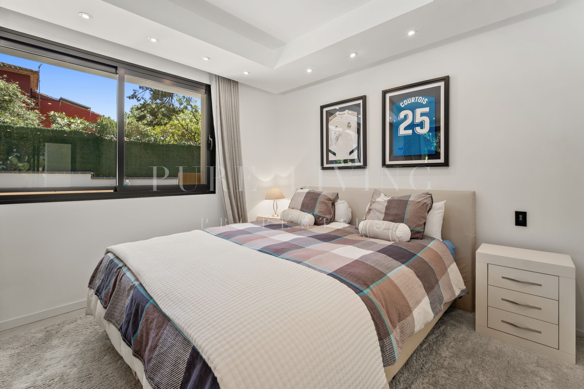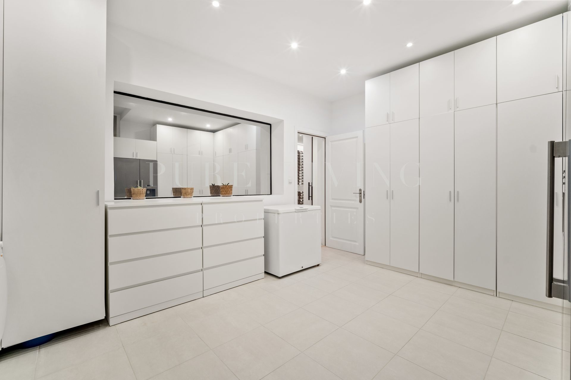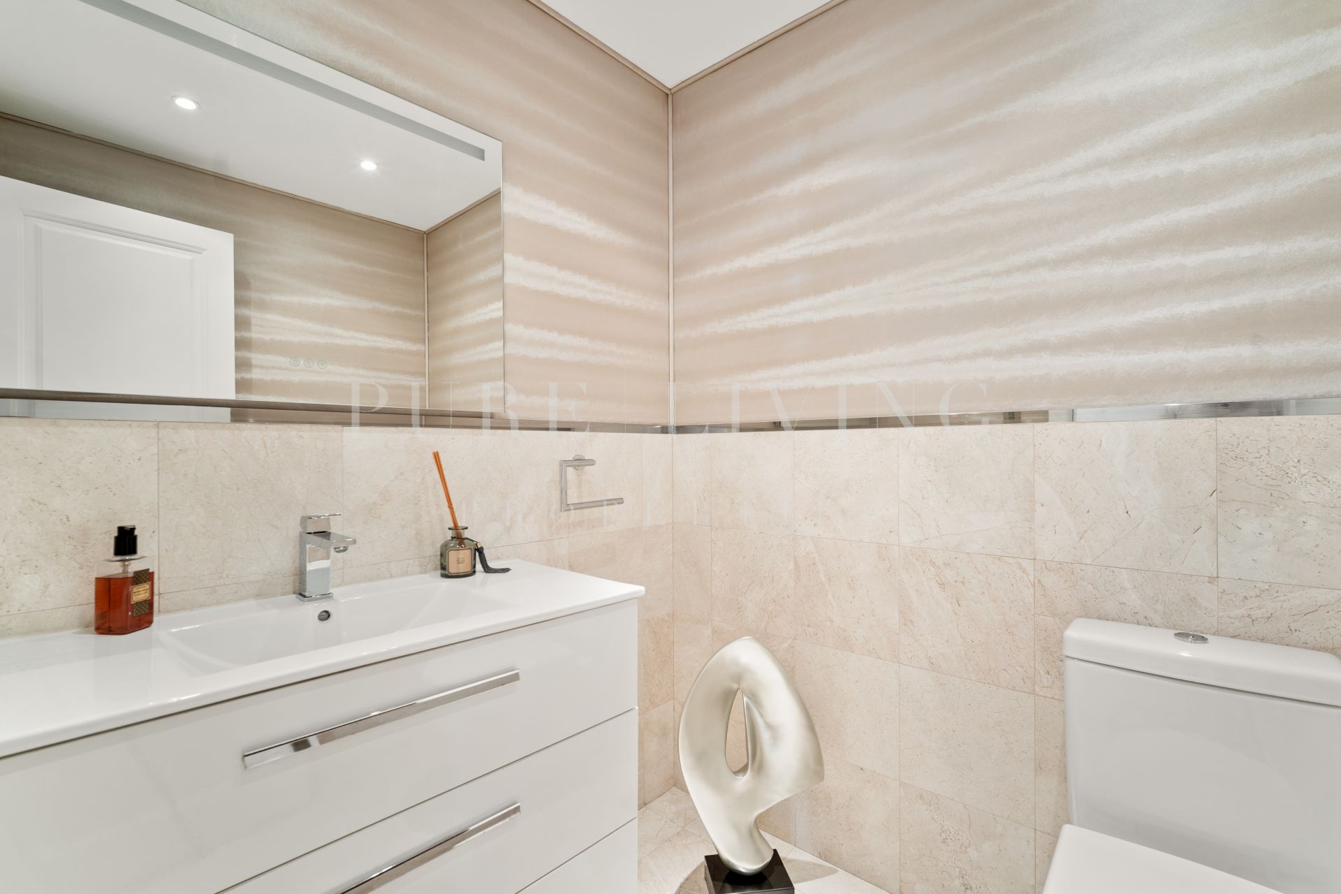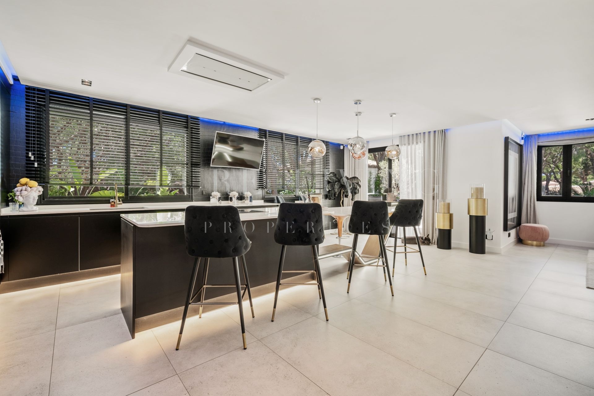 The entrance level features a very spacious open plan living area, with direct access to the terrace, garden and swimming pool, including a spectacular modern kitchen with central island, a bedroom with an ensuite bathroom and a guests cloakroom.