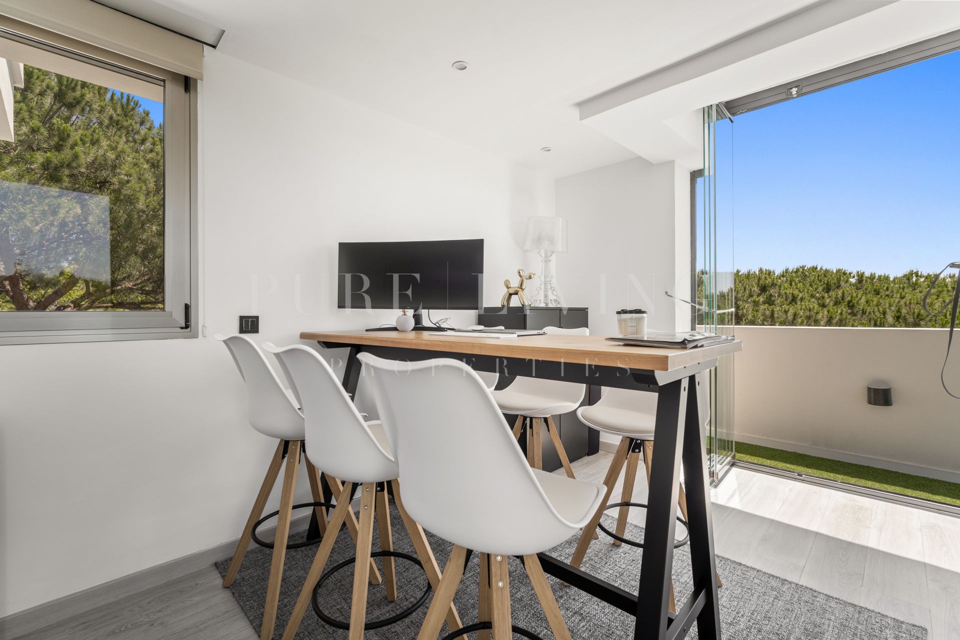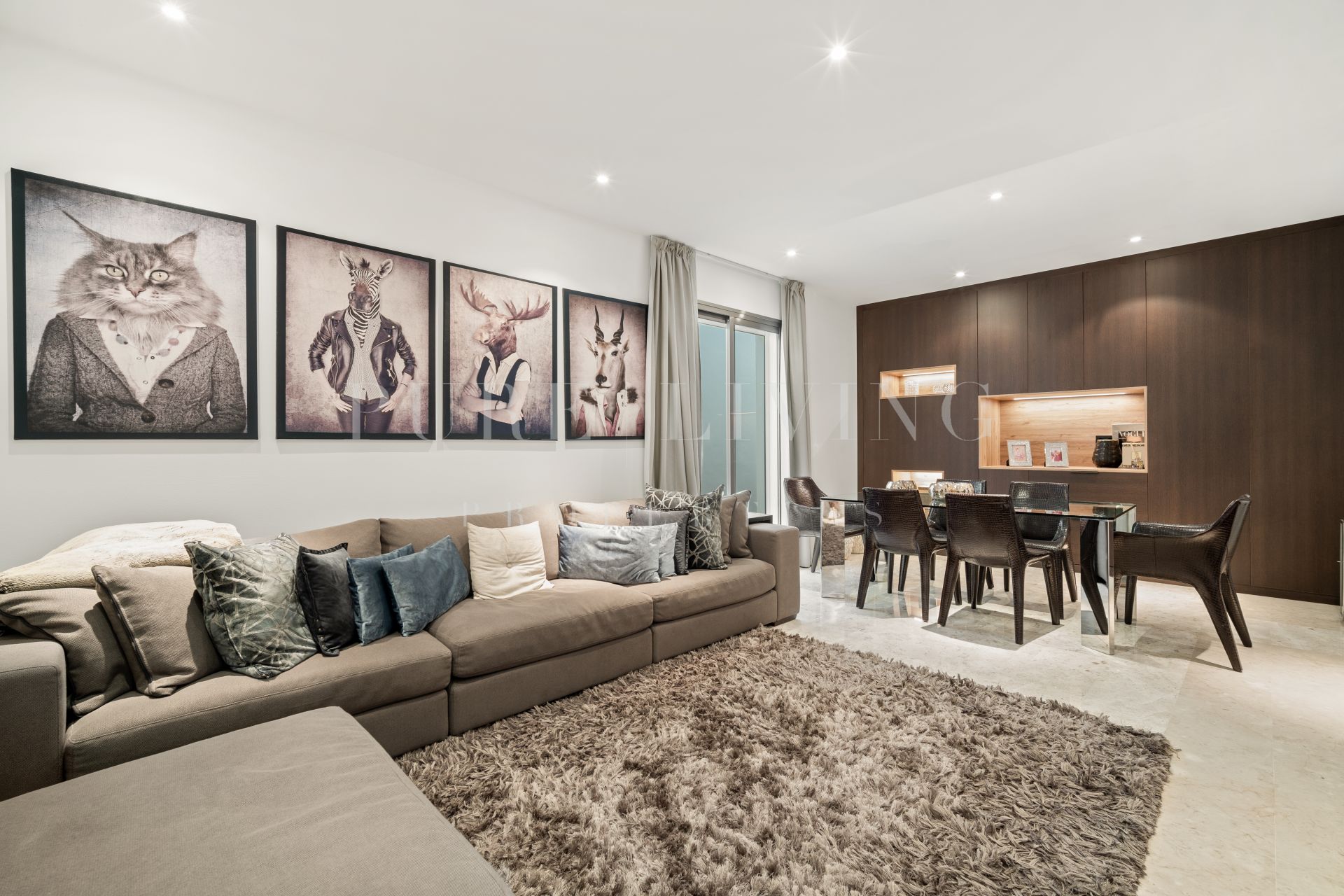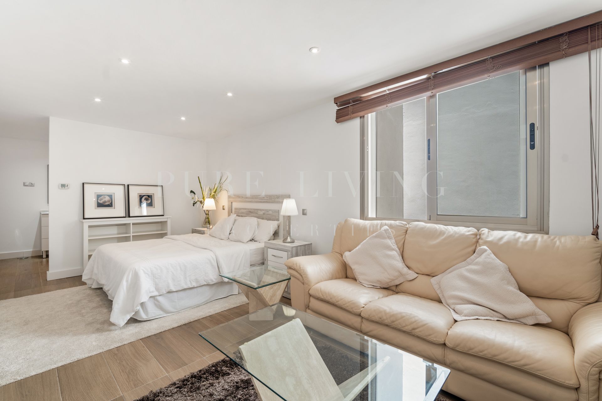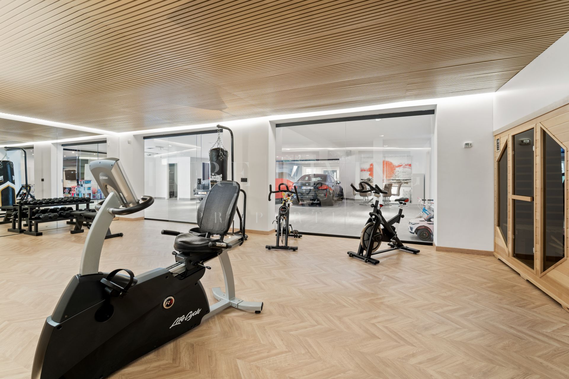 The entrance level features a very spacious open plan living area, with direct access to the terrace, garden and swimming pool, including a spectacular modern kitchen with central island, a bedroom with an ensuite bathroom and a guests cloakroom.