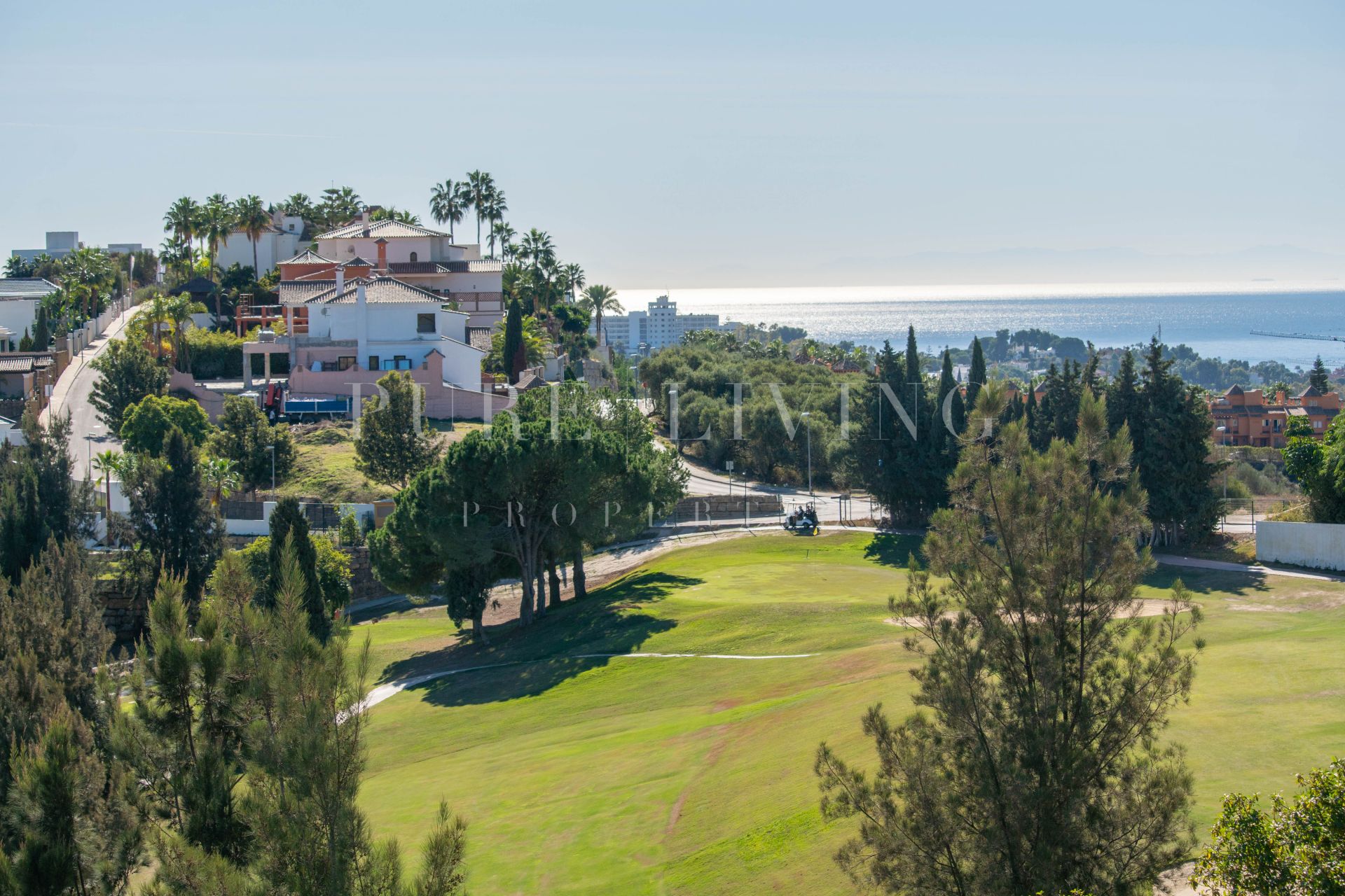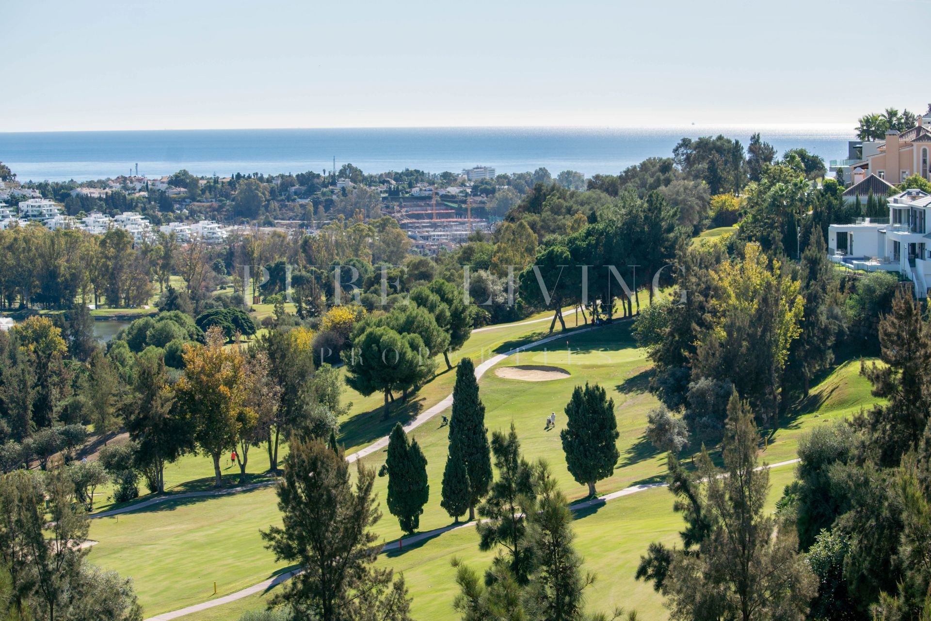 The property offers five spacious bedrooms and six bathrooms, along with open-plan living spaces that flow seamlessly onto the terraces, pool, and beautifully landscaped gardens. Large glass doors flood the interior with natural light and frame spectacular views of the sea, mountains, and golf course.