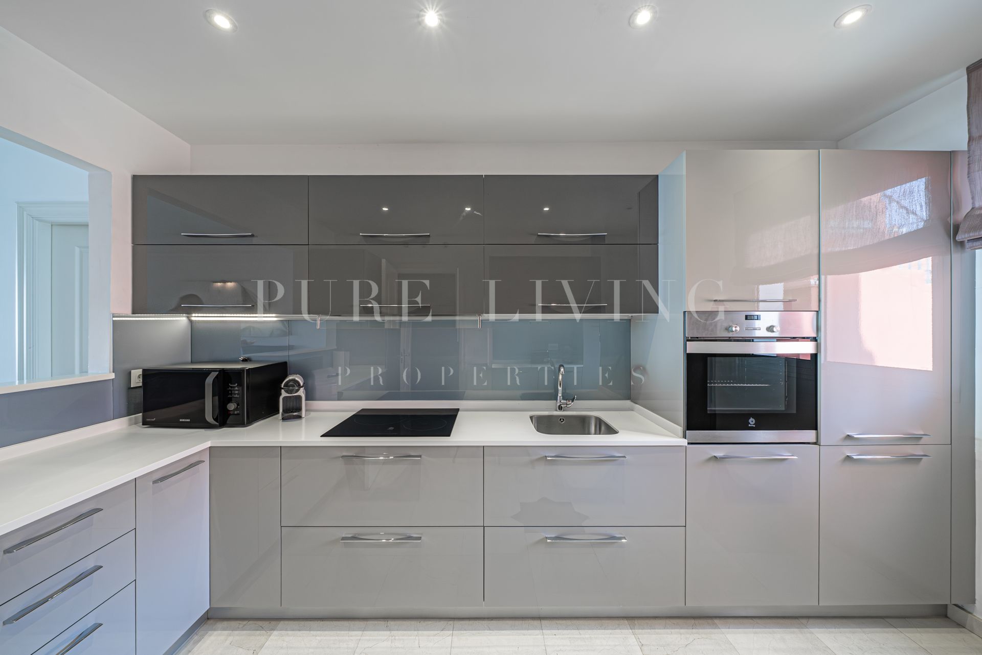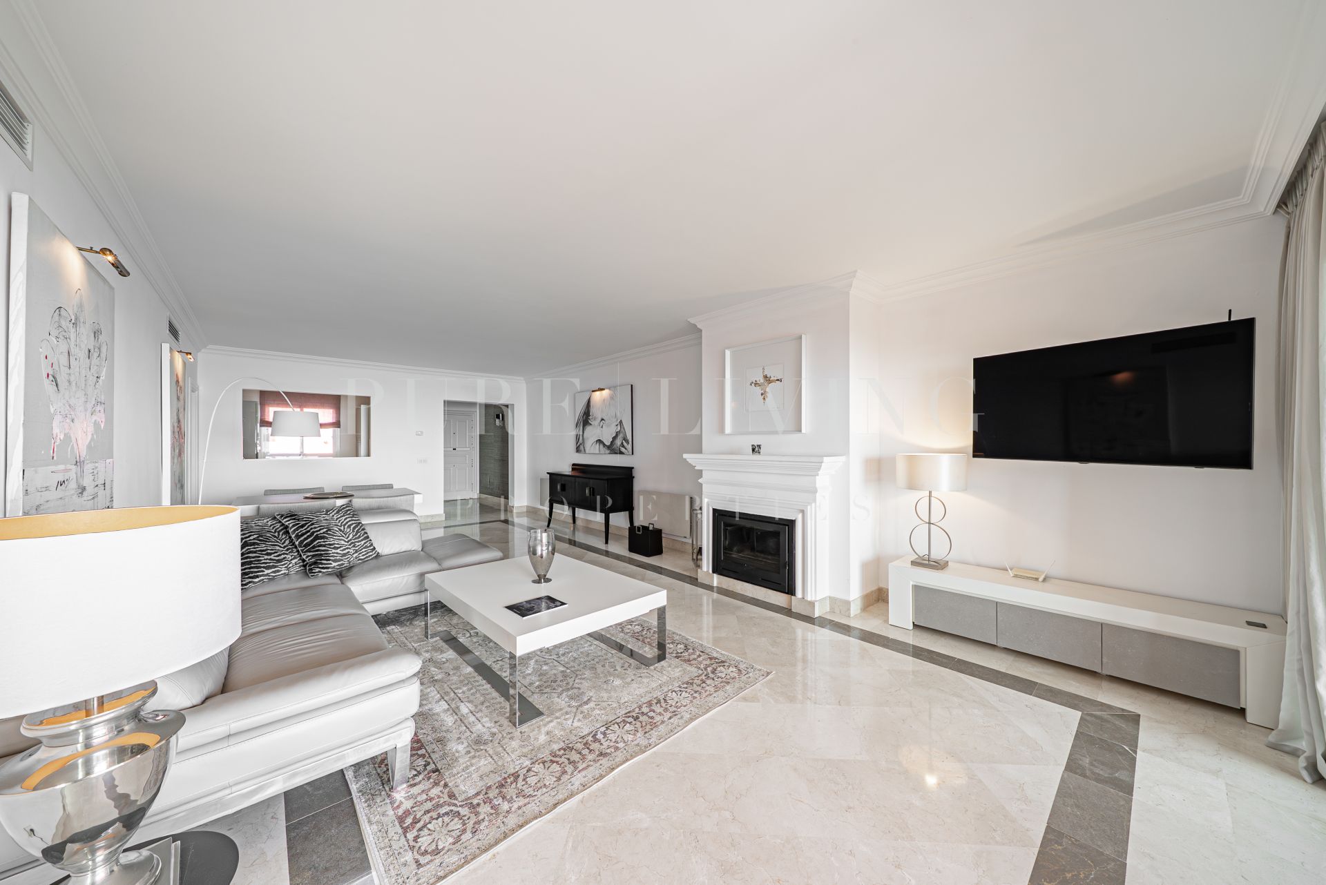 The apartment is tastefully decorated with high-end German-brand furnishings and features an elegant, open-plan living space. A modern, fully renovated kitchen comes fully equipped with quality appliances, seamlessly connecting to a bright and inviting lounge and dining area with a fireplace.