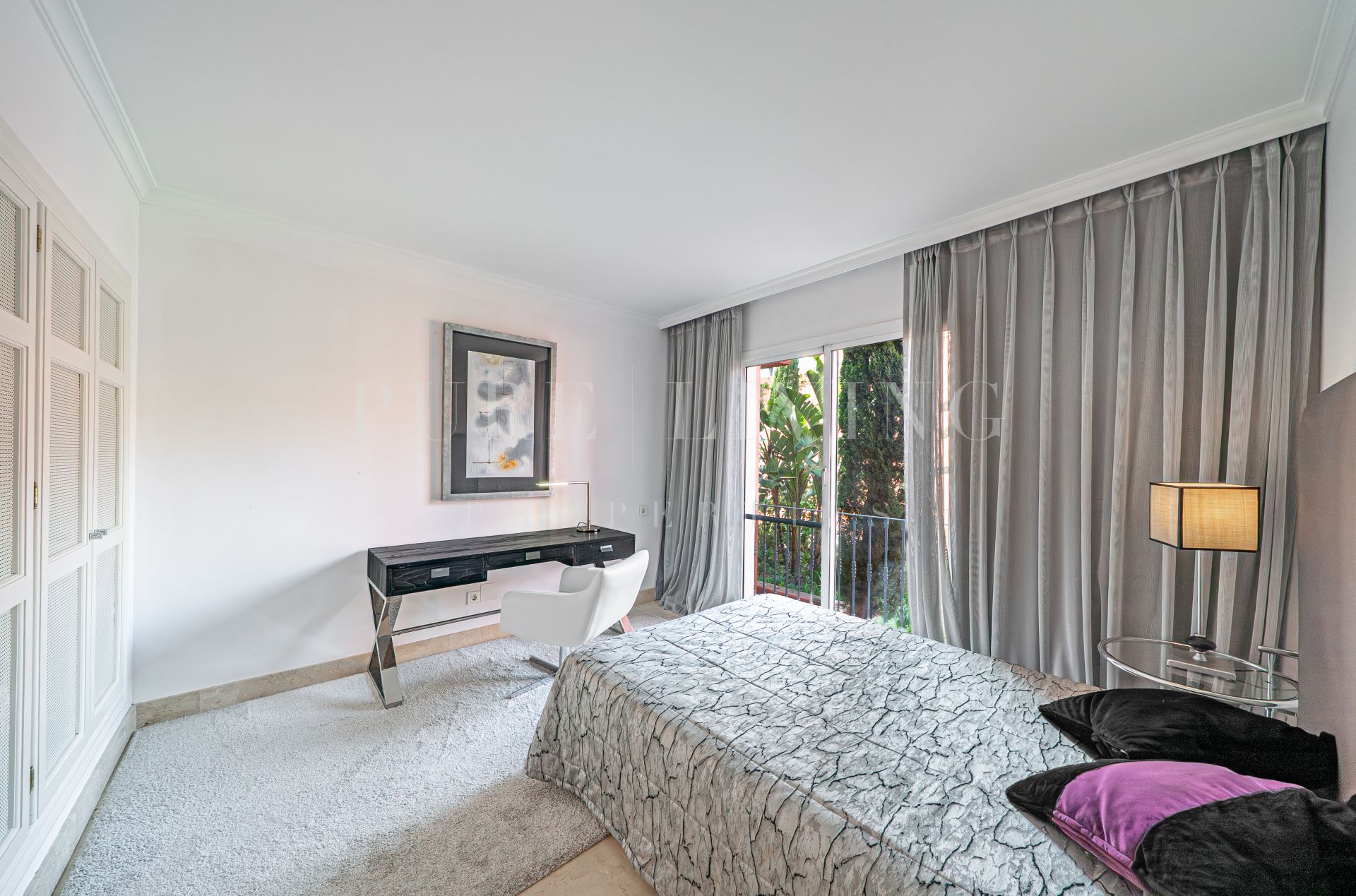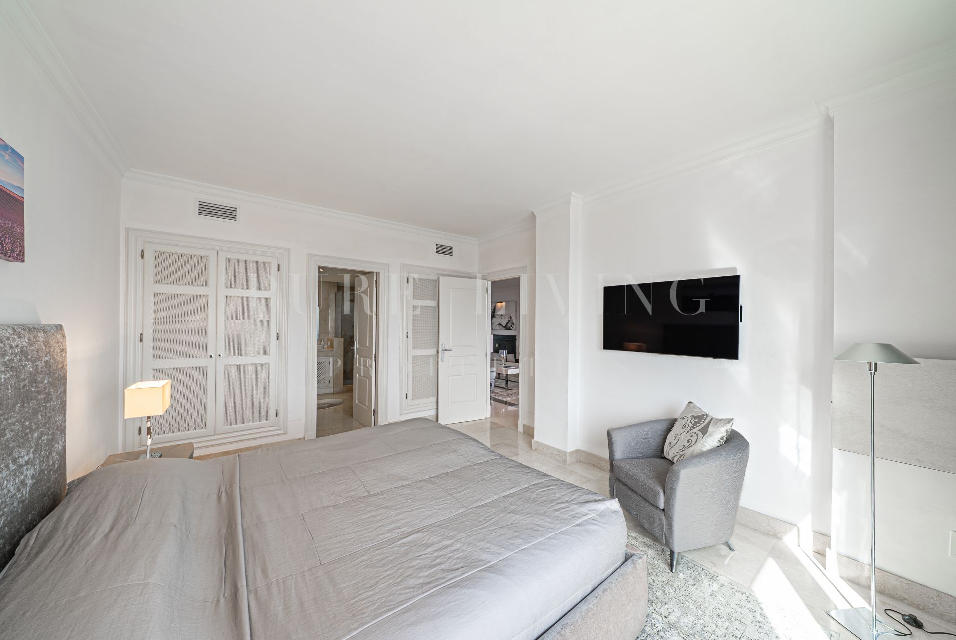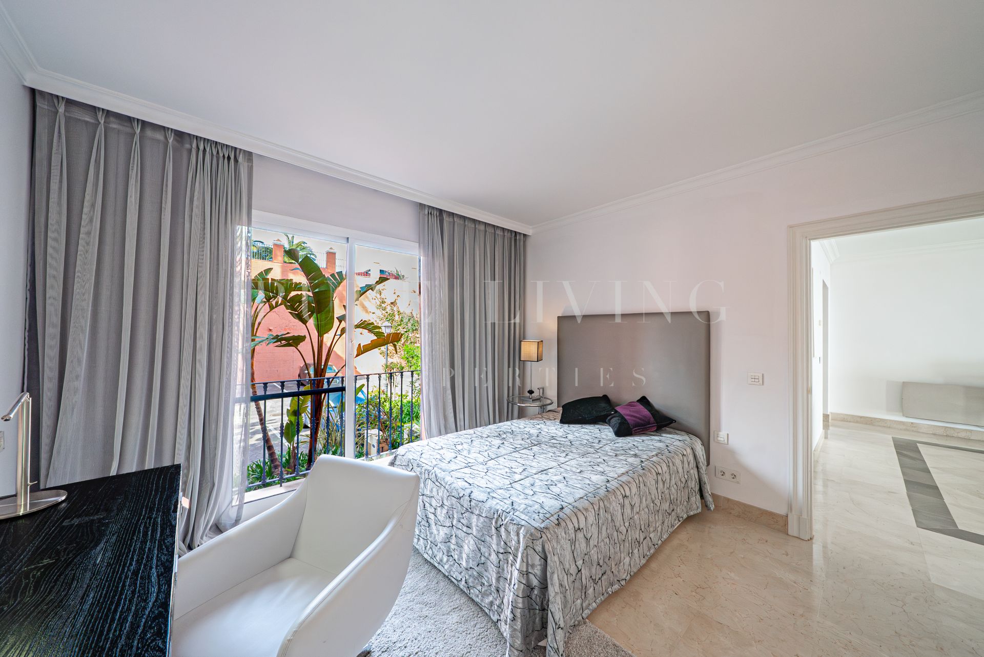 The layout ensures privacy, with both bedrooms and bathrooms situated in a separate wing of the apartment. The master bedroom enjoys stunning sea views, while the second bedroom includes a dedicated workspace—ideal for use as a home office or study.
