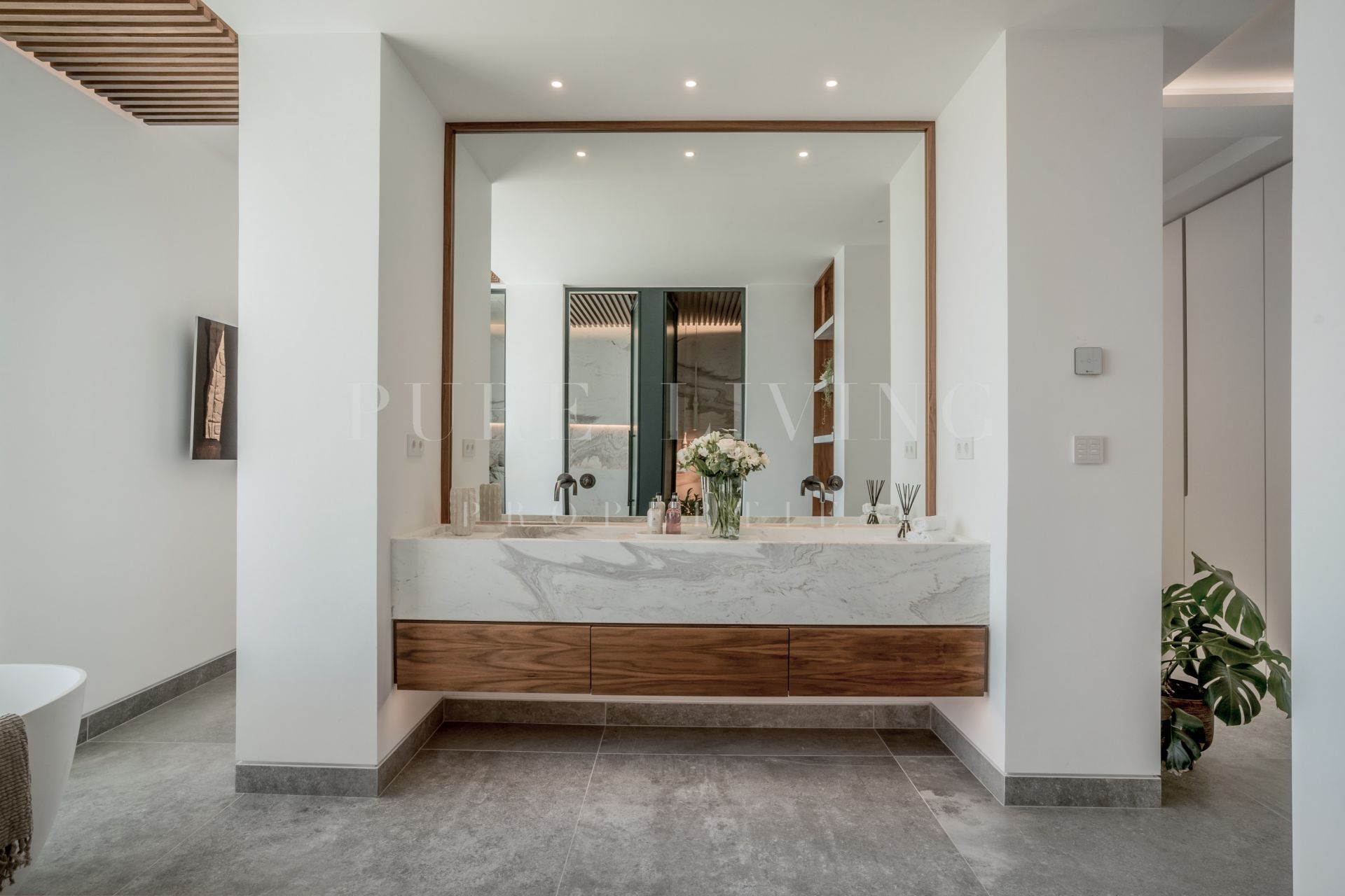 The master suite is truly exceptional. Perfectly positioned to capture stunning sea views, it features a bespoke walk-in closet and a luxurious en-suite bathroom with high-end fittings and a tranquil, spa-like atmosphere—creating a private sanctuary within the home.