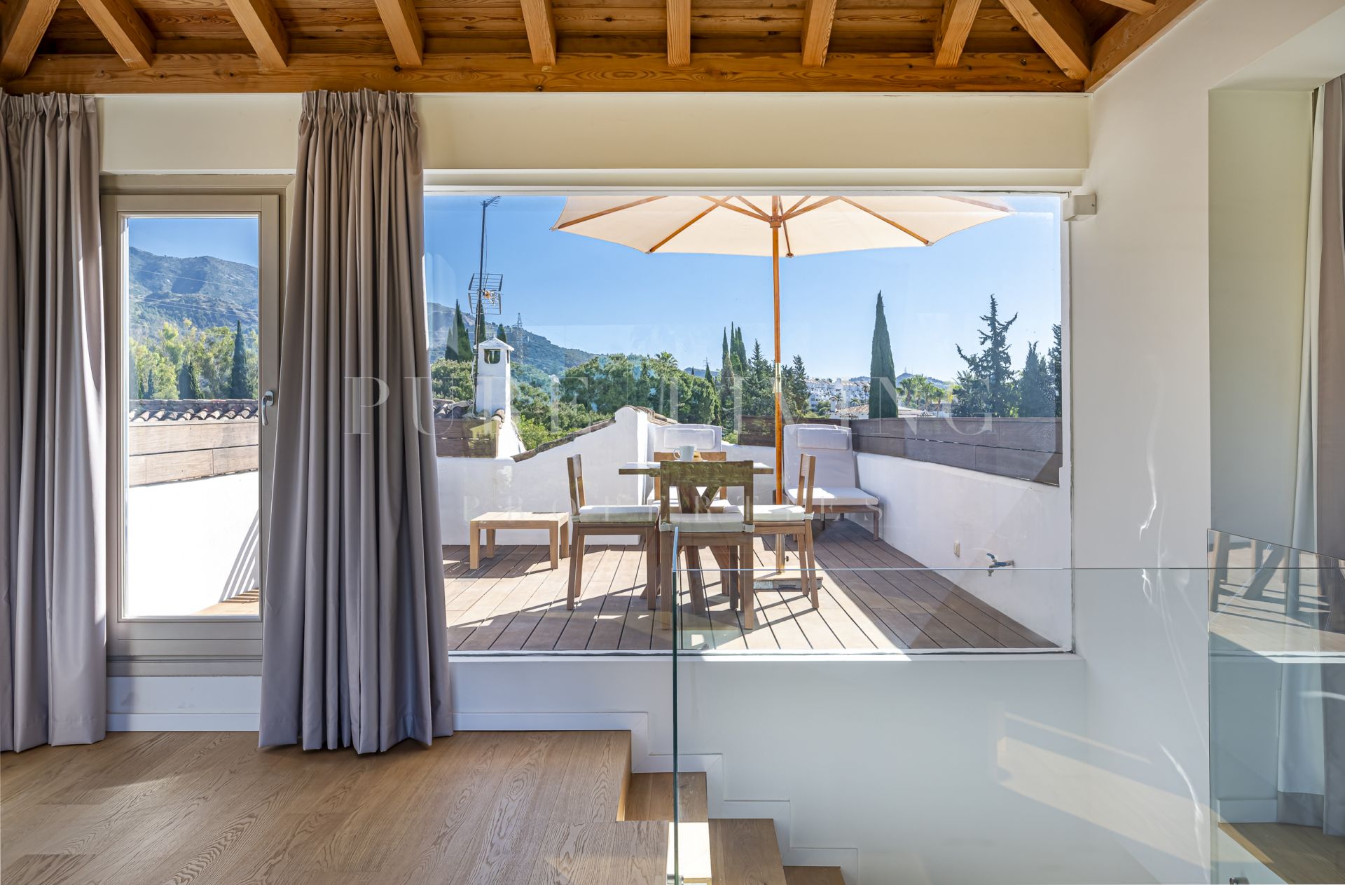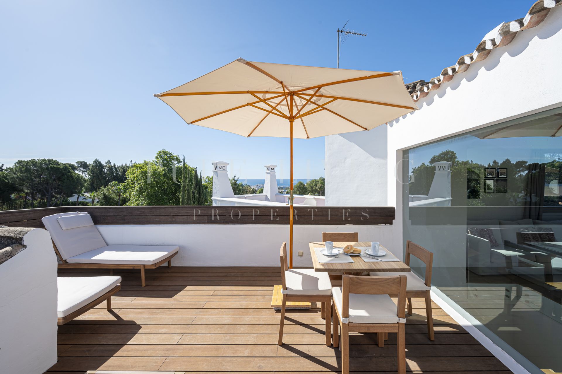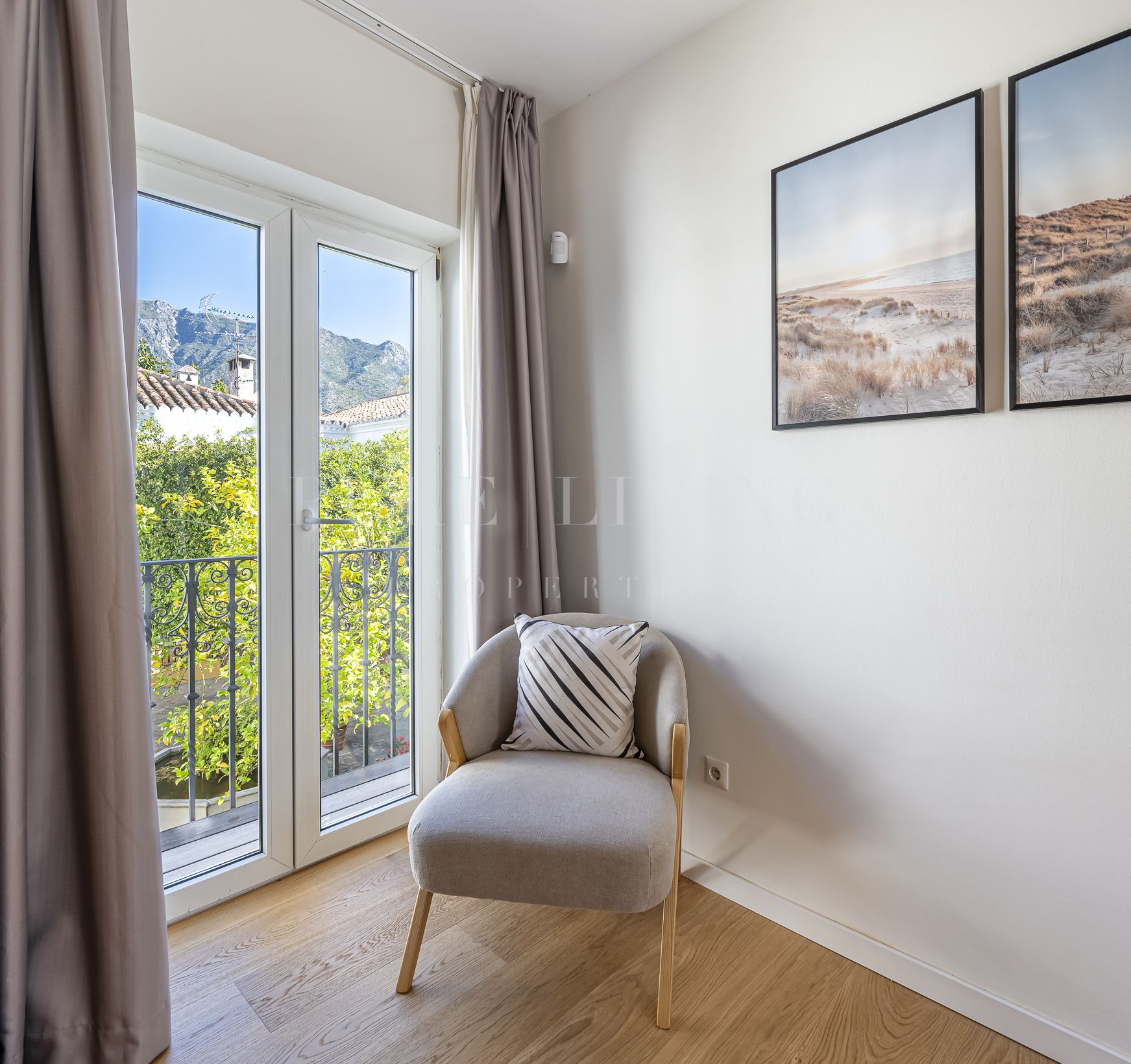 The top floor of this charming townhouse features a second living room, providing additional space for relaxation or entertainment. From here, guests can access the spacious solarium, fitted with several sun loungers. This is the perfect spot to soak in the sun and enjoy breathtaking views of La Concha Mountain and the Mediterranean coastline.
