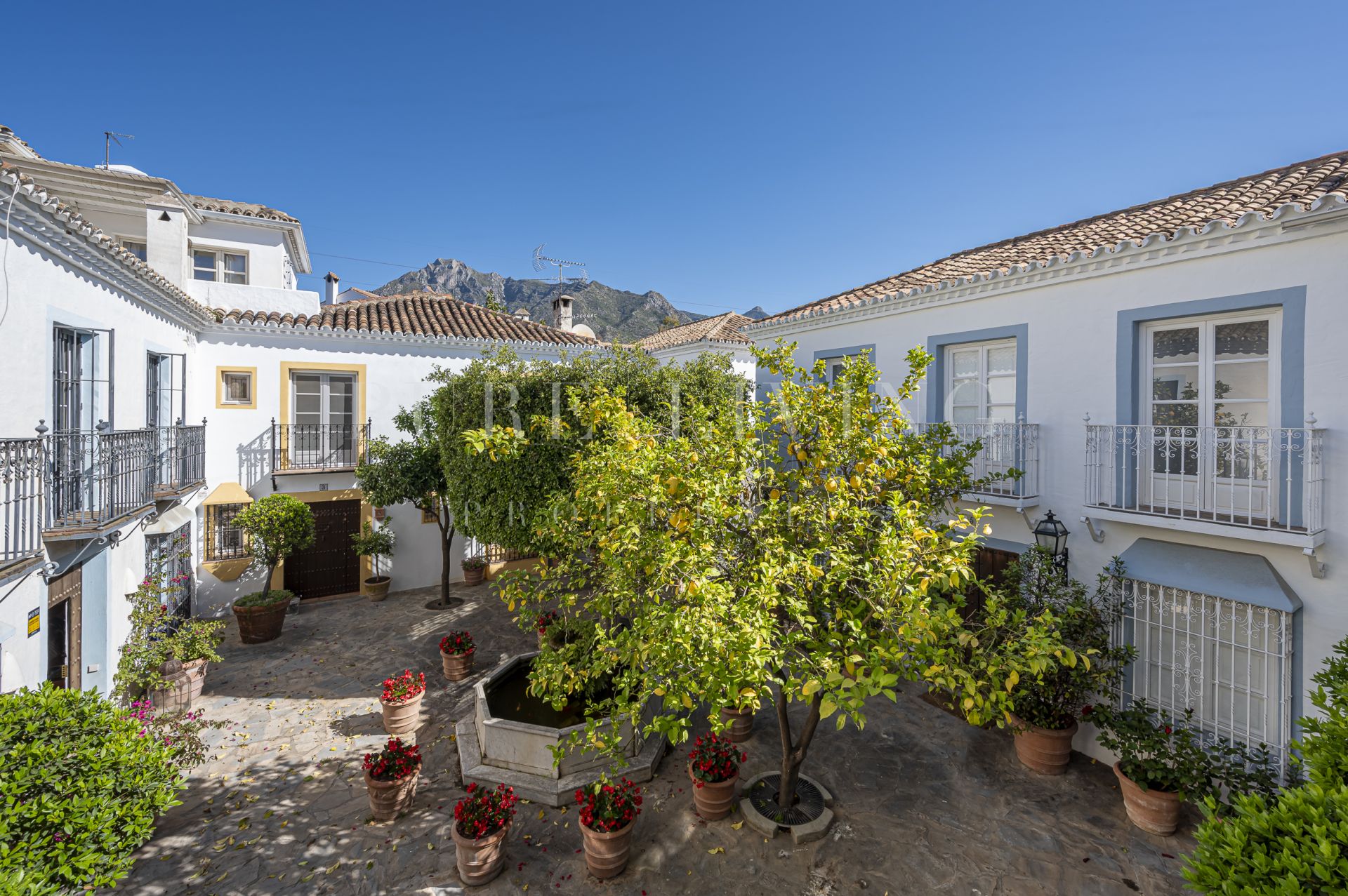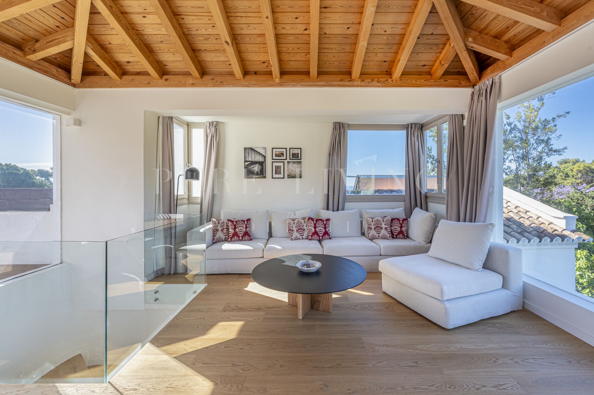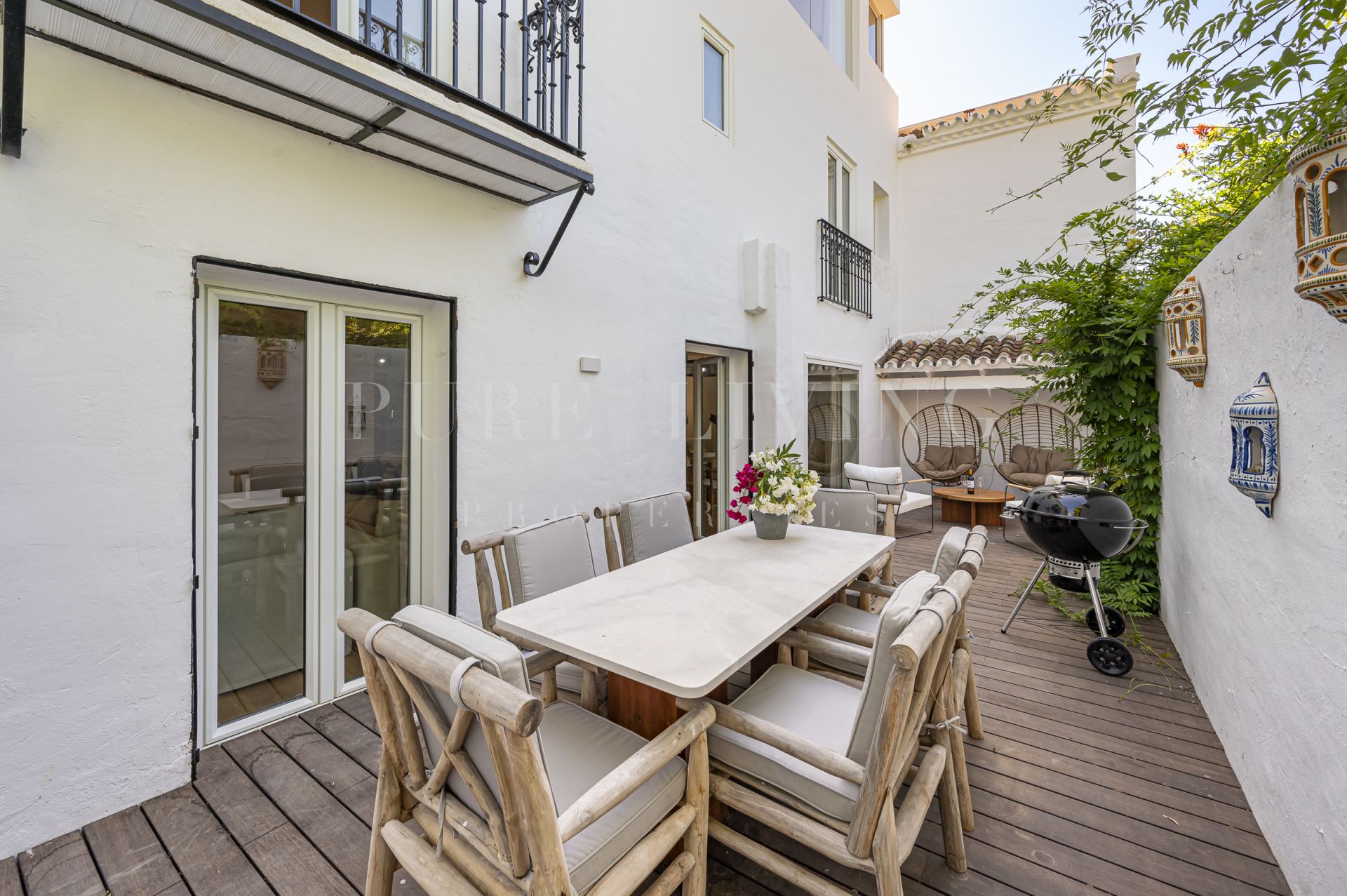 The top floor of this charming townhouse features a second living room, providing additional space for relaxation or entertainment. From here, guests can access the spacious solarium, fitted with several sun loungers. This is the perfect spot to soak in the sun and enjoy breathtaking views of La Concha Mountain and the Mediterranean coastline.