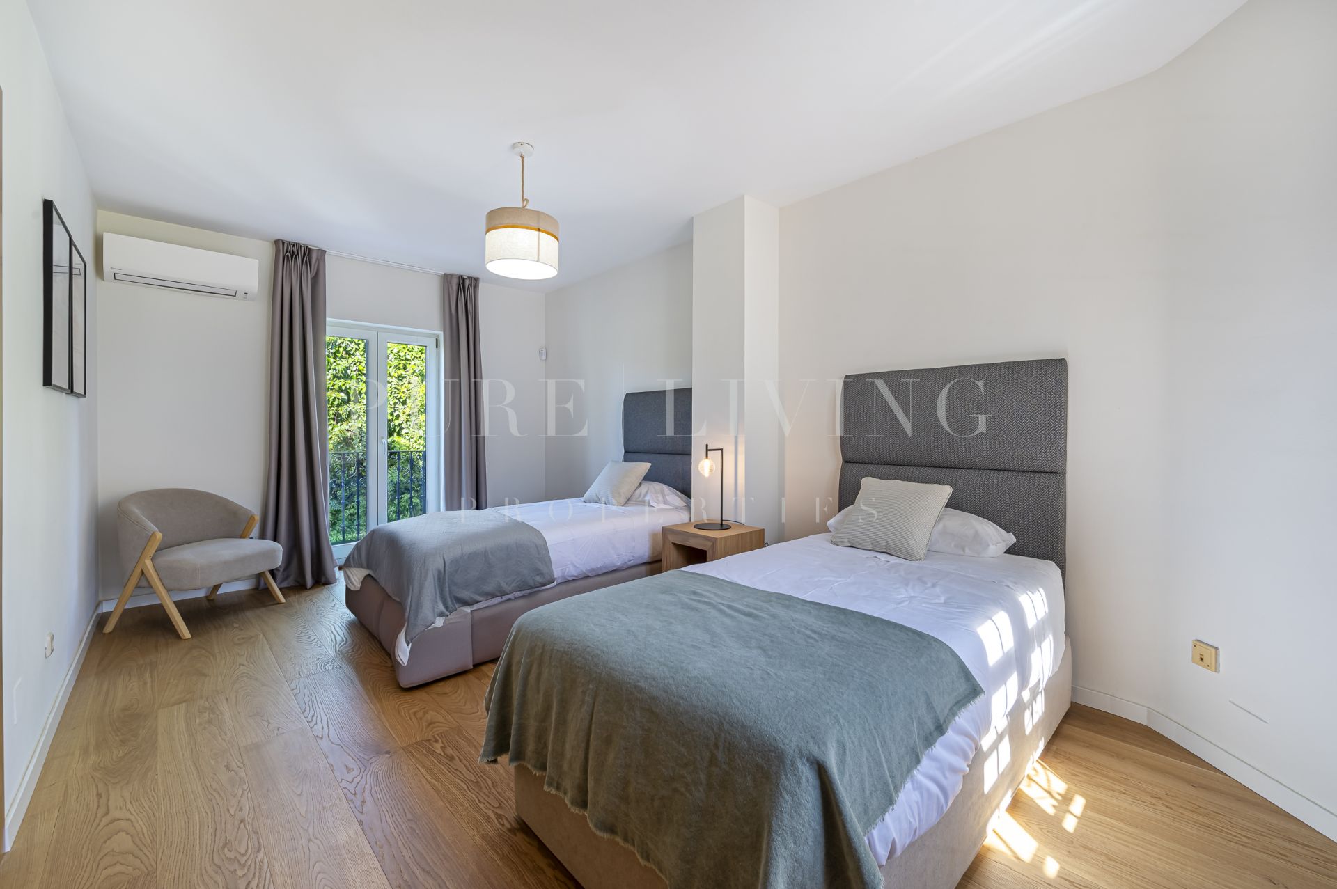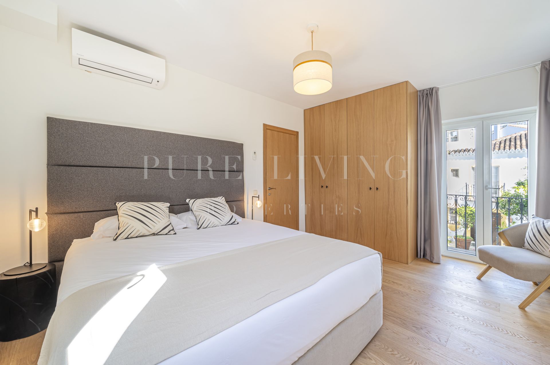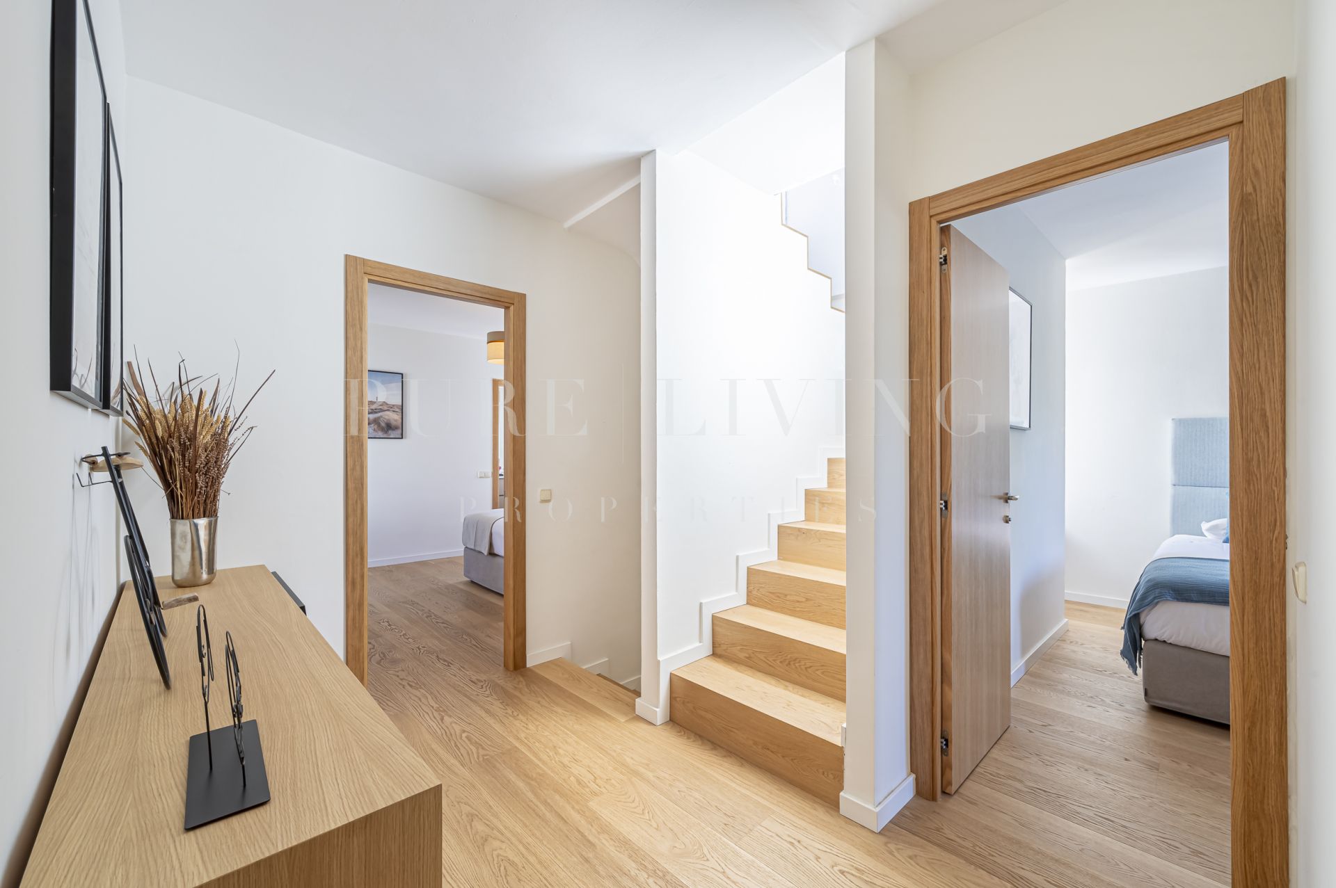 The second floor houses all the bedrooms, ensuring a peaceful and private retreat. The master bedroom boasts its own en-suite bathroom and offers lovely views of the urbanization’s Spanish-style courtyard. The two additional bedrooms are fitted with two single beds each and share a well-appointed bathroom featuring a rainfall shower and his-and-hers sinks. Each bedroom is equipped with built-in wardrobes and independent air conditioning units, ensuring personalized comfort.