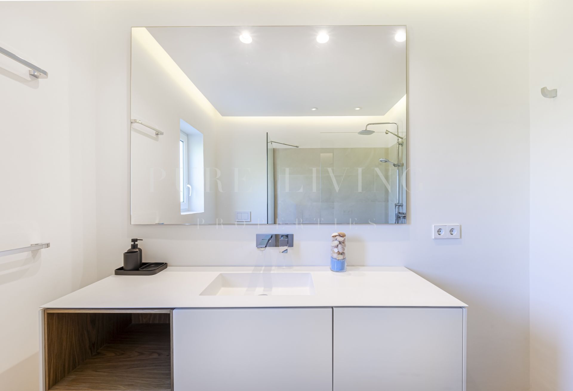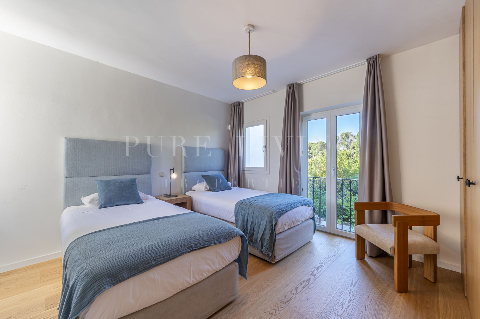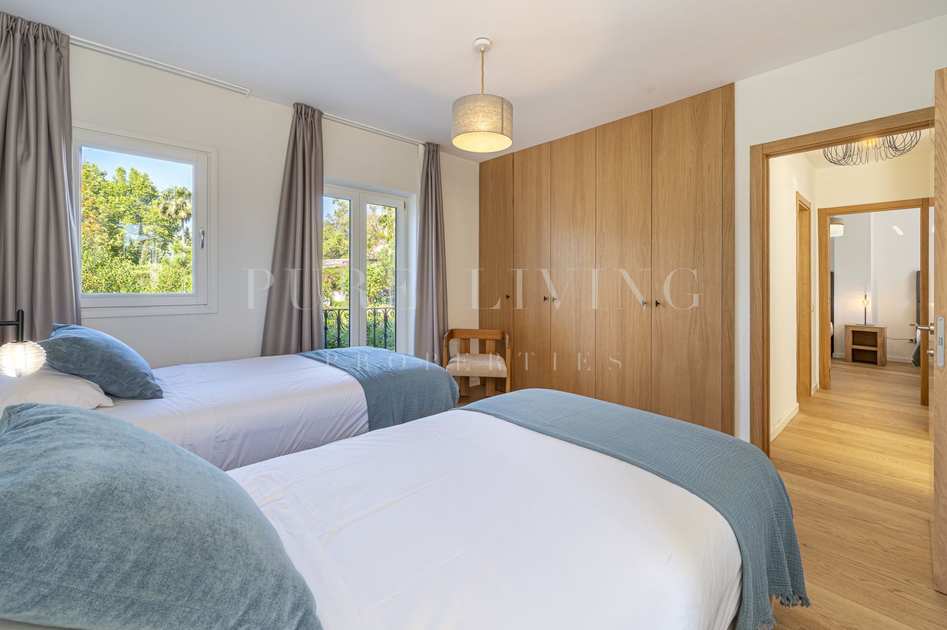 The second floor houses all the bedrooms, ensuring a peaceful and private retreat. The master bedroom boasts its own en-suite bathroom and offers lovely views of the urbanization’s Spanish-style courtyard. The two additional bedrooms are fitted with two single beds each and share a well-appointed bathroom featuring a rainfall shower and his-and-hers sinks. Each bedroom is equipped with built-in wardrobes and independent air conditioning units, ensuring personalized comfort.