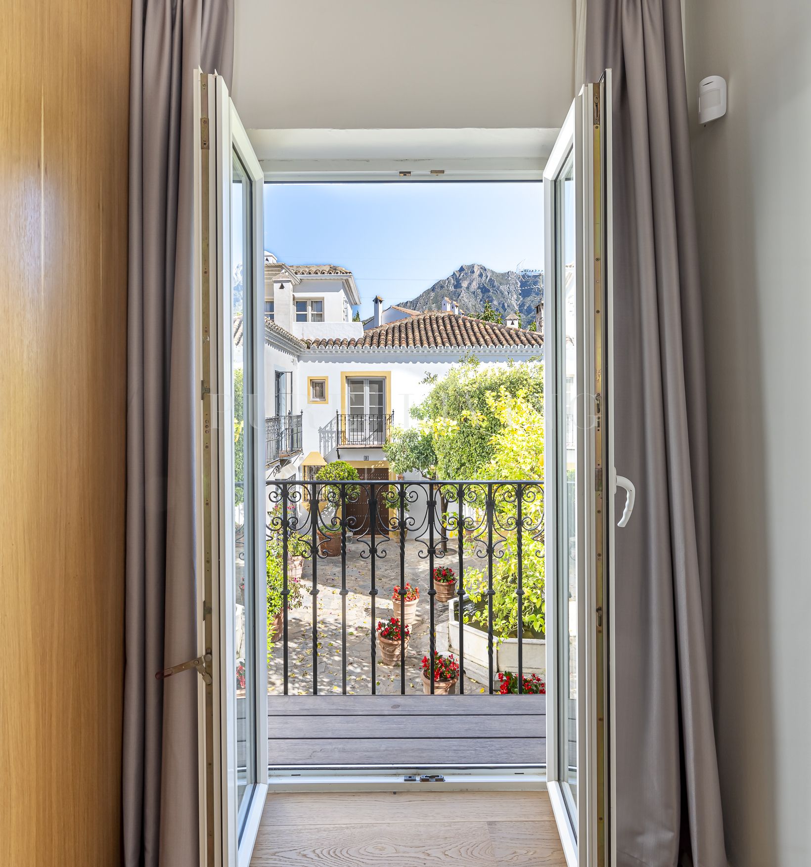 As you enter the main floor, you are greeted by a functional and well-equipped kitchen, perfect for preparing your favourite meals with ease and efficiency. The indoor living room, featuring a functioning fireplace, provides a warm and inviting atmosphere for relaxing evenings. Adjacent to the living room is the dining area, ideal for family meals or entertaining guests. Large floor-to-ceiling windows divide the dining room from the spacious outdoor patio, allowing natural light to flood the space. The patio itself is perfect for outdoor living, offering a cozy sitting area, a barbecue, and an outdoor dining space—ideal for al fresco dining and making the most of Marbella’s unique climate.