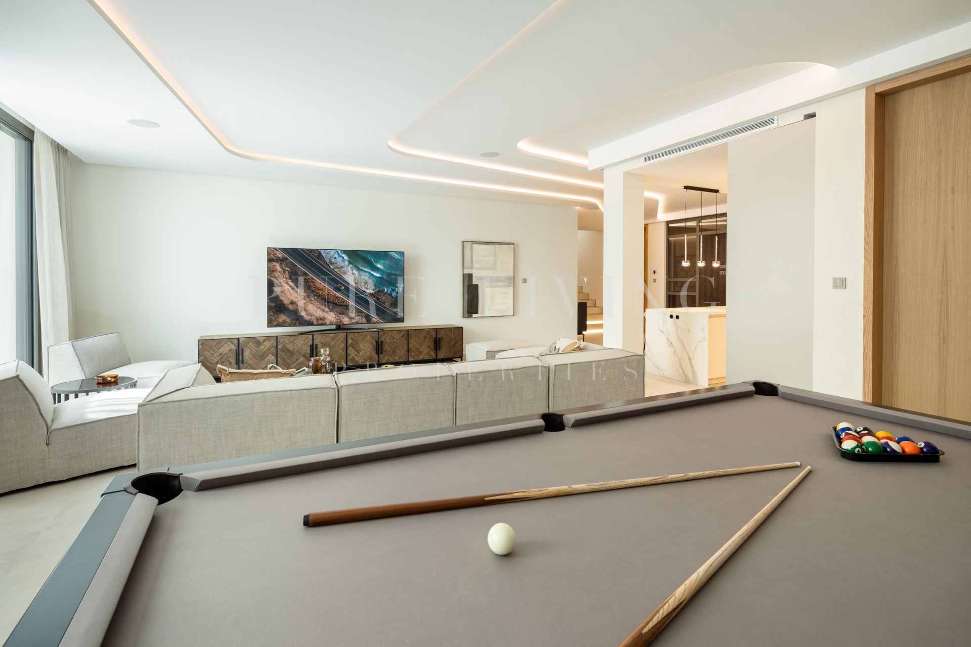 Set on a generous 1,454-square-metre plot, the villa spans 710 square metres across three levels. It features five spacious en-suite bedrooms and an additional guest toilet, ensuring ample space and privacy. The villa’s design impresses with high ceilings, expansive windows, and premium materials, creating an elegant yet inviting ambiance. Warm tones, wooden doors, and hidden LED lighting enhance the stylish interior, while large archways contribute to the sense of grandeur. The open-plan living area is both functional and aesthetically stunning, framing breathtaking views of La Concha mountain, the golf course, and a serene lake with a fountain.