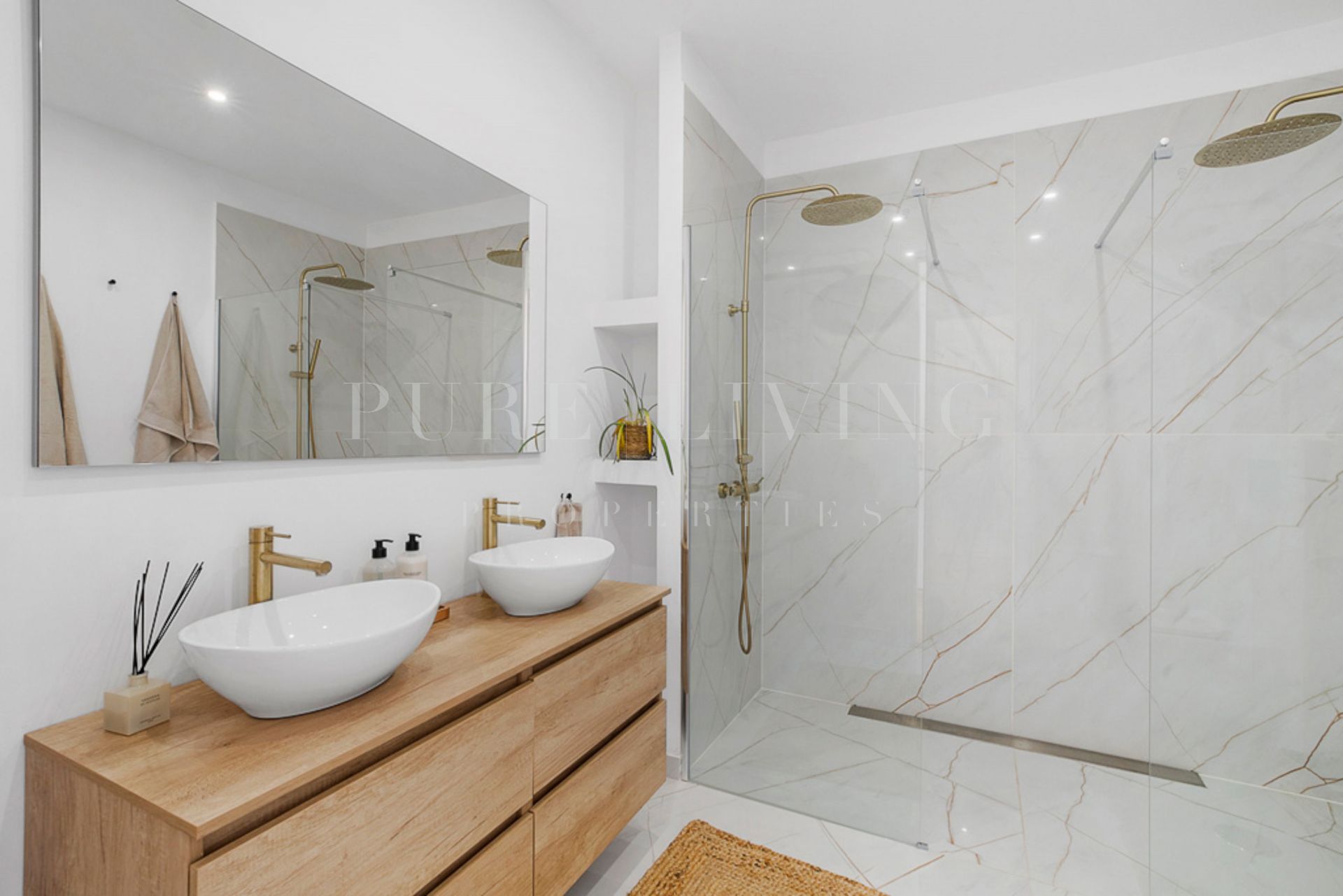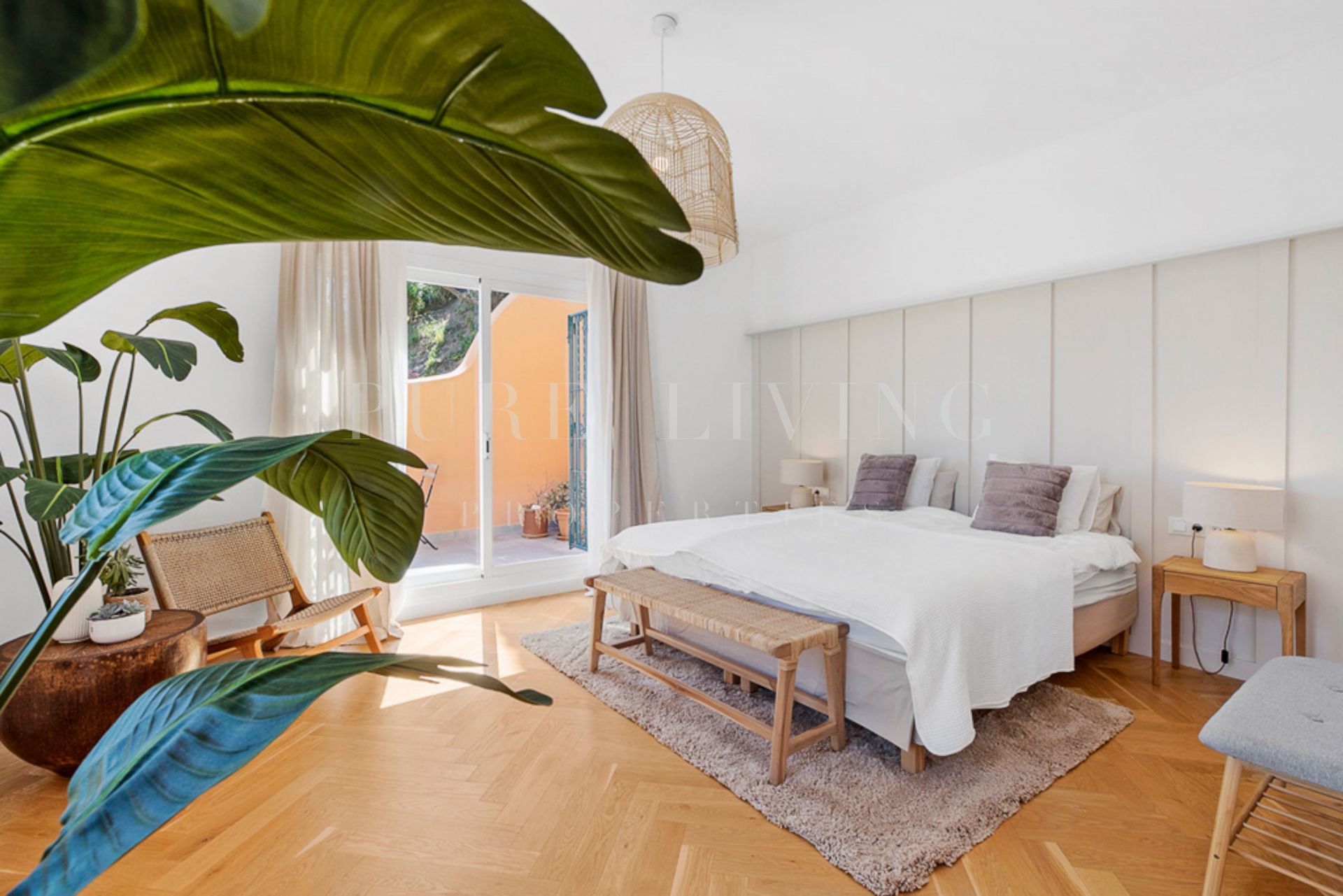 The property boasts multiple terraces, including a private and covered terrace, ideal for enjoying the stunning vistas and the southern orientation which ensures abundant natural light. The communal pool and garden are perfect for leisure, while the indoor pool offers year-round enjoyment.