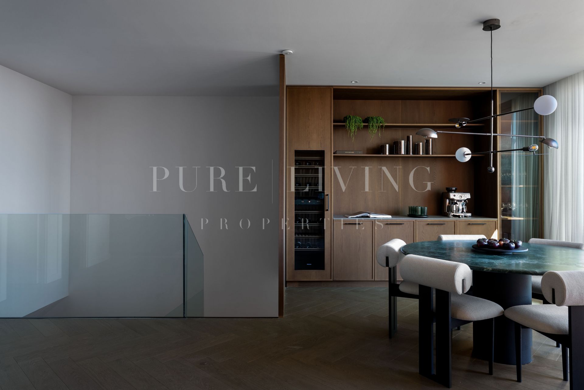 The property showcases a refined mix of mid-century and modern aesthetics, featuring premium materials such as rich dark oak, elegant parquet flooring, bespoke small-format tiling, and high-quality finishes throughout. Spread across two expansive levels, the penthouse offers four spacious bedrooms, all with en-suite bathrooms, along with an additional guest toilet. One of the bedrooms also benefits from a generous walk-in wardrobe, enhancing both comfort and functionality.