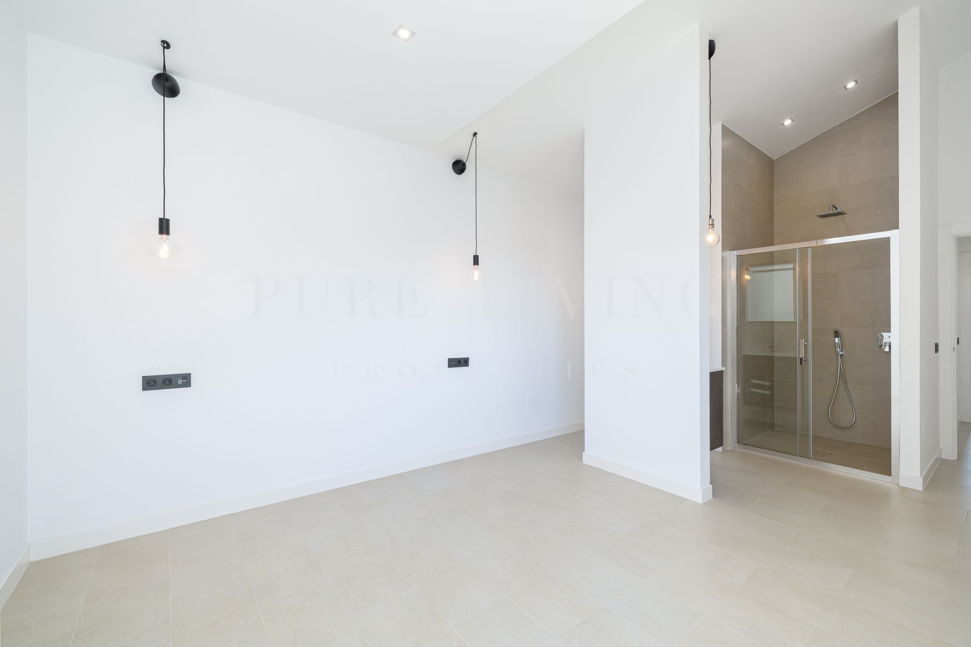 The residence comprises four generously proportioned bedrooms, each accompanied by a private en-suite bathroom, alongside an open-plan office space, guest powder room, and a spacious, state-of-the-art kitchen. Boasting 53m² of terraces, the home provides ample outdoor areas to embrace the quintessential Mediterranean lifestyle. Additional features include convenient parking for multiple vehicles, a utility room, and expansive landscaped grounds.