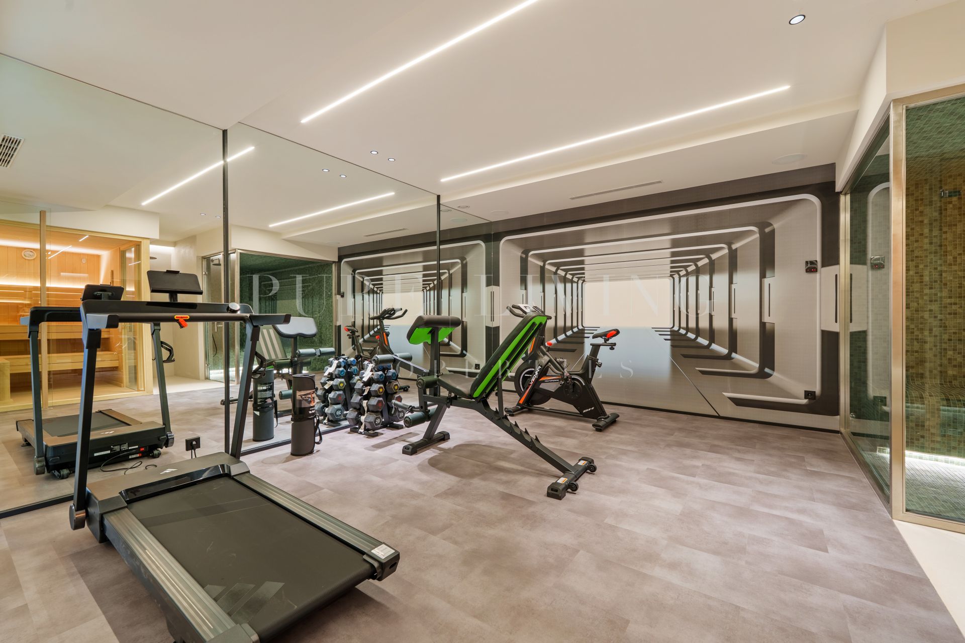 Designed with wellness and leisure in mind, the villa includes a complete wellness area with a gym, sauna, and steam room, alongside spaces dedicated to relaxation and entertainment. Outdoors, the landscaped private garden, swimming pool, expansive covered and uncovered terraces, and a rooftop solarium provide the perfect setting for both unwinding and hosting guests.
