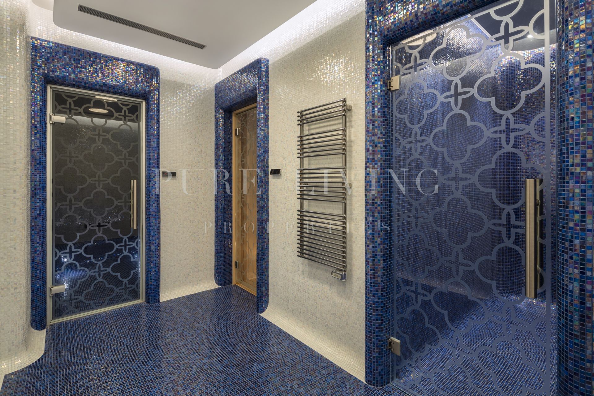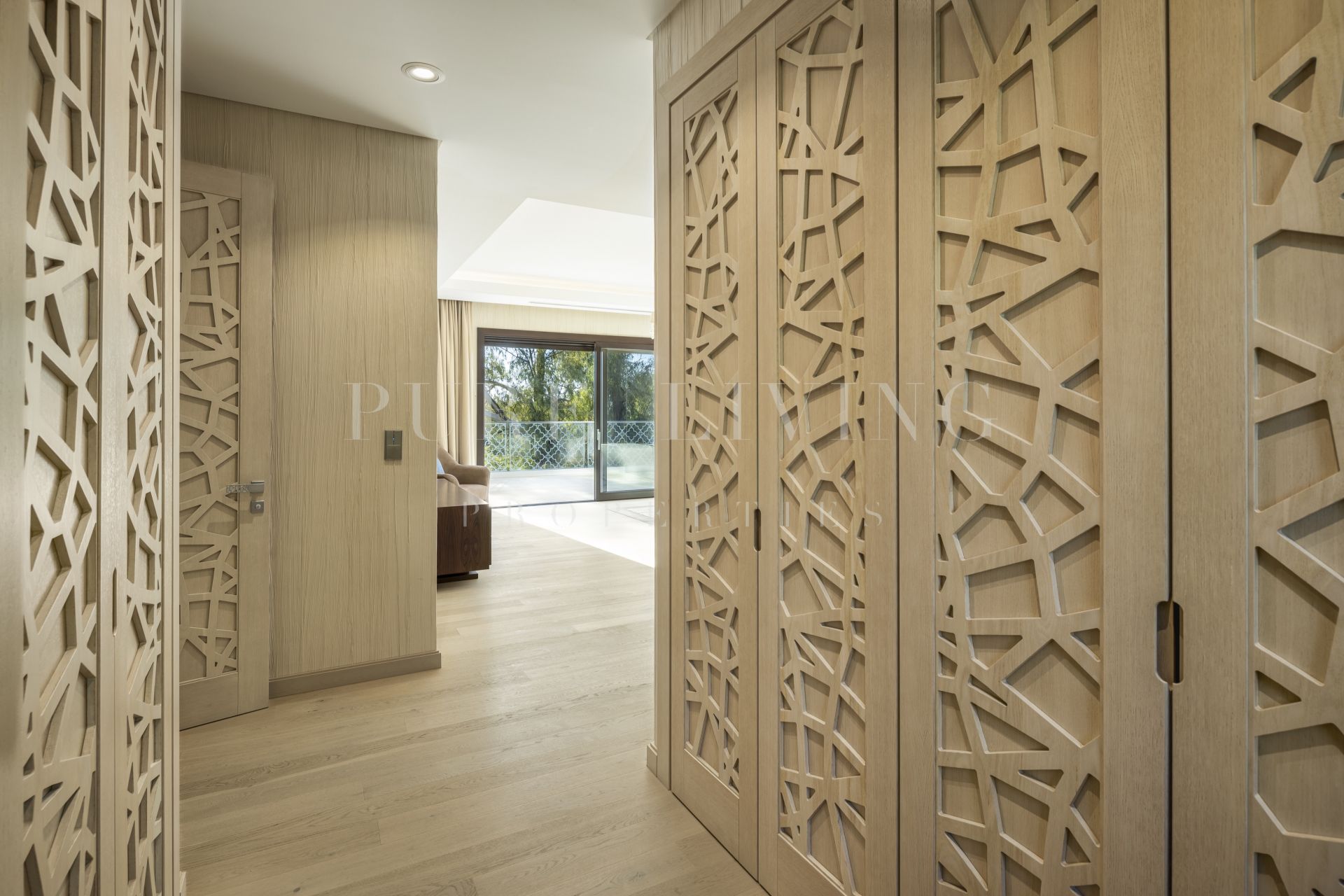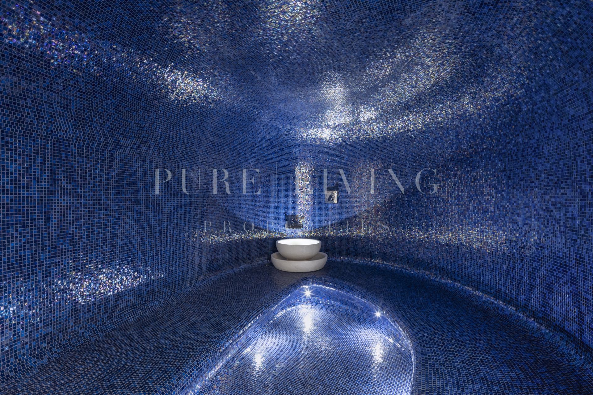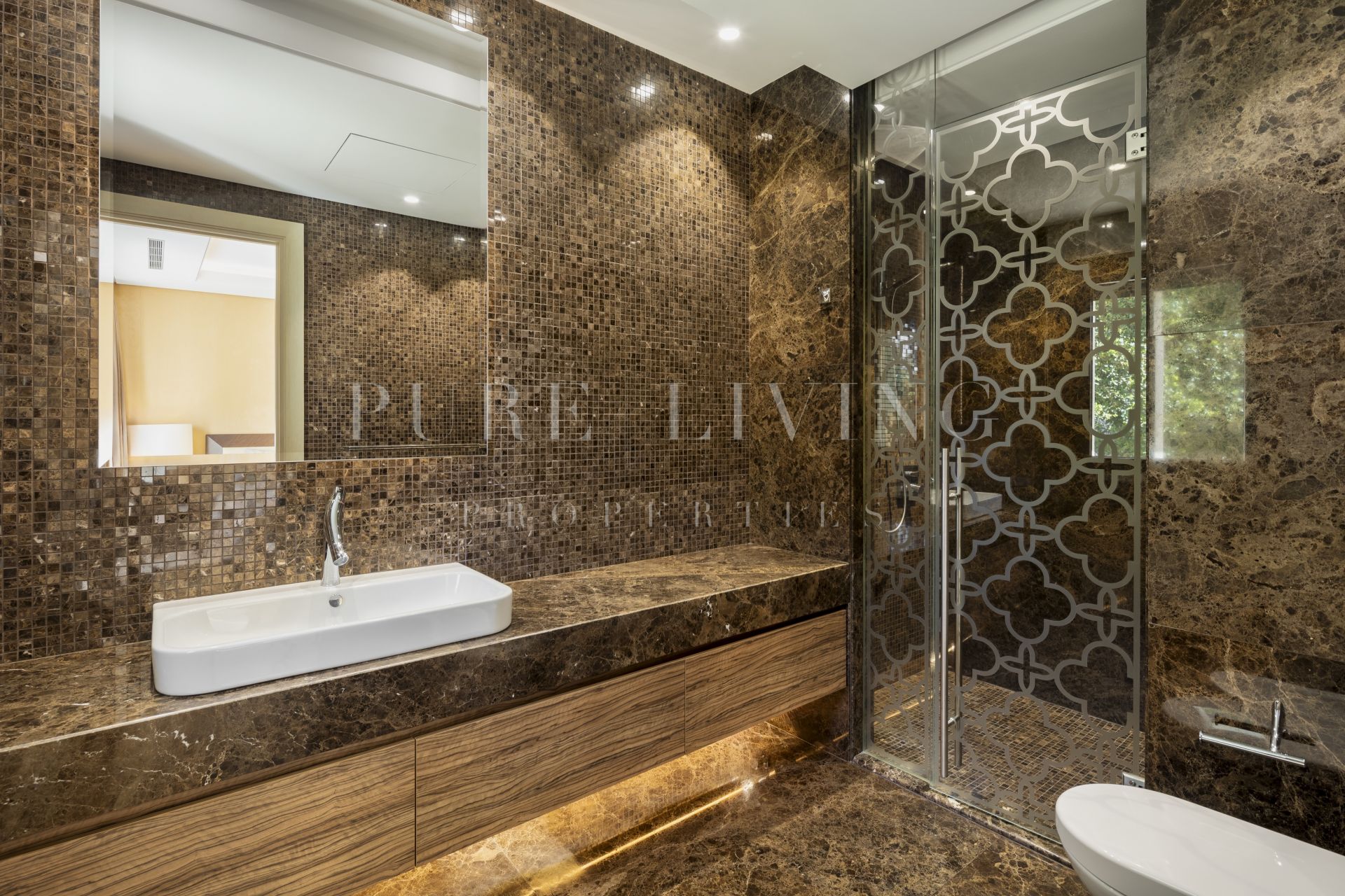 The grand entrance and landscaping create an impressive introduction. The property includes a private driveway leading to a large garage that can accommodate up to ten cars. The outdoor spaces are designed for relaxation and entertainment, featuring chill-out areas, alfresco dining spaces, and a two-tiered garden with LED-lit stairs. A private infinity pool, with deep blue tiles, adds a luxurious touch to the outdoor space. The interior is marked by a seamless transition between indoor and outdoor spaces, thanks to glass sliding doors. The living area is furnished with fine furniture and wooden accents, creating a warm, earthy ambiance.The open-plan dining and kitchen area boasts high ceilings with wooden beams, providing a spacious and functional cooking and dining environment. The kitchen is well-equipped with modern appliances, ample counter space, and a central island. The villa’s floors are connected via a lift, ensuring easy movement throughout the property. Each bedroom, including the extravagant master bedroom with terrace access and panoramic views, exudes elegance and comfort. The master bathroom is a luxurious space with a standalone tub, double vanity, and a spacious shower. The property features a sumptuous spa area, complete with a Hammam and Turkish bath, adorned with deep blue tiles.