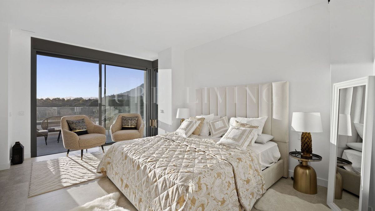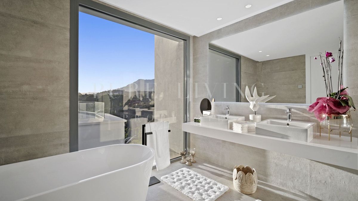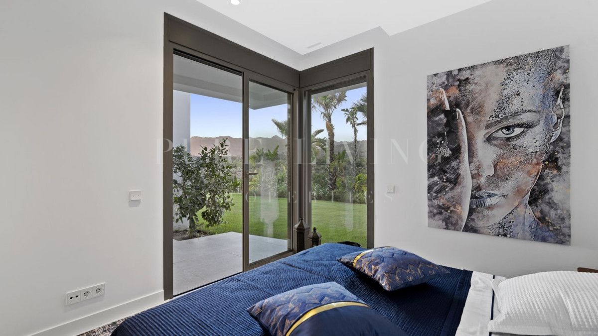 Upon entering the villa on the first floor, you’ll find three south-west facing bedrooms, each offering breathtaking views of the golf course, sea, and mountains. The master bedroom is generously sized, featuring a luxurious en-suite bathroom with a walk-in shower, modern bathtub, double sink, toilet, and bidet. The property boasts ample fitted wardrobes and individually controlled underfloor heating throughout.