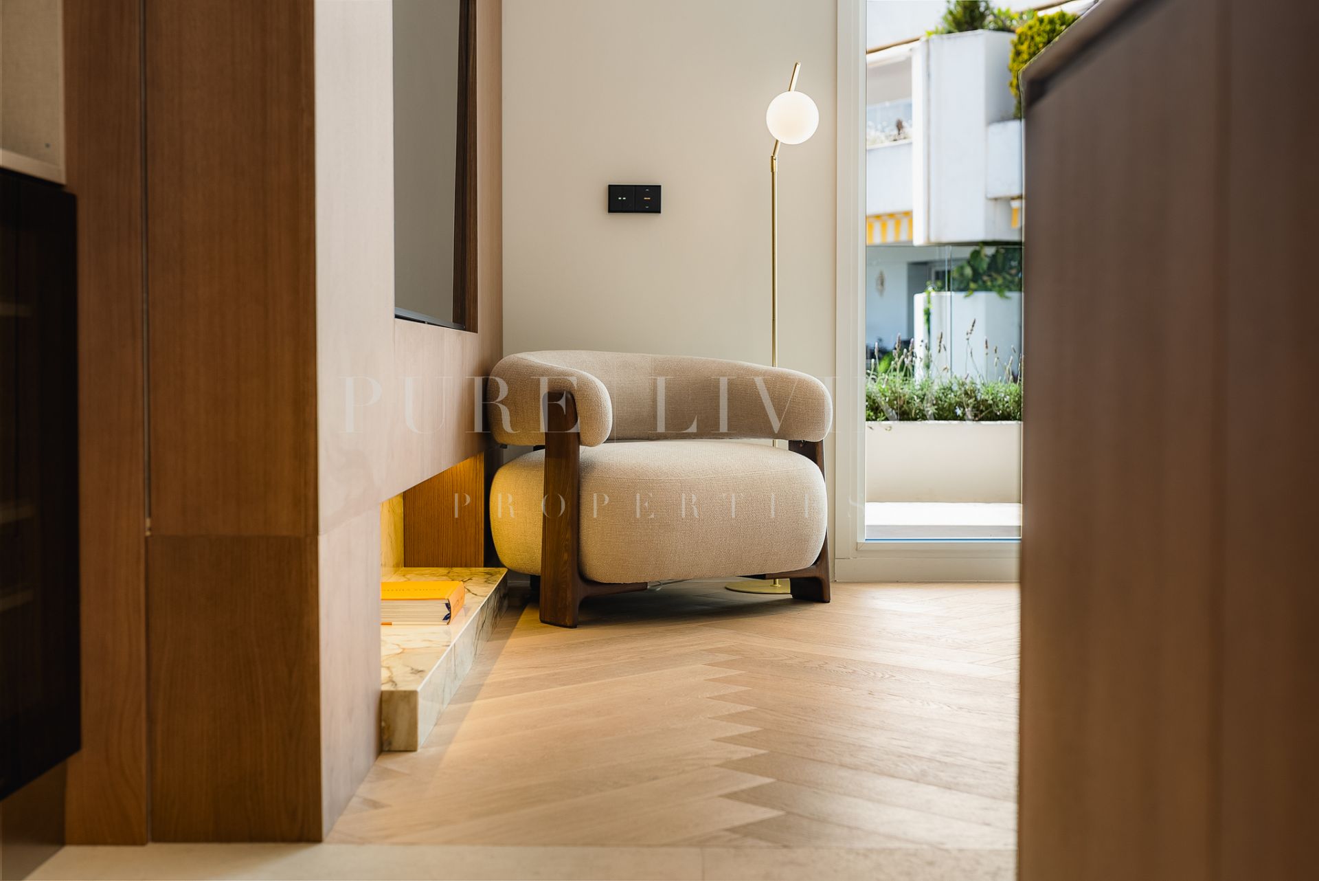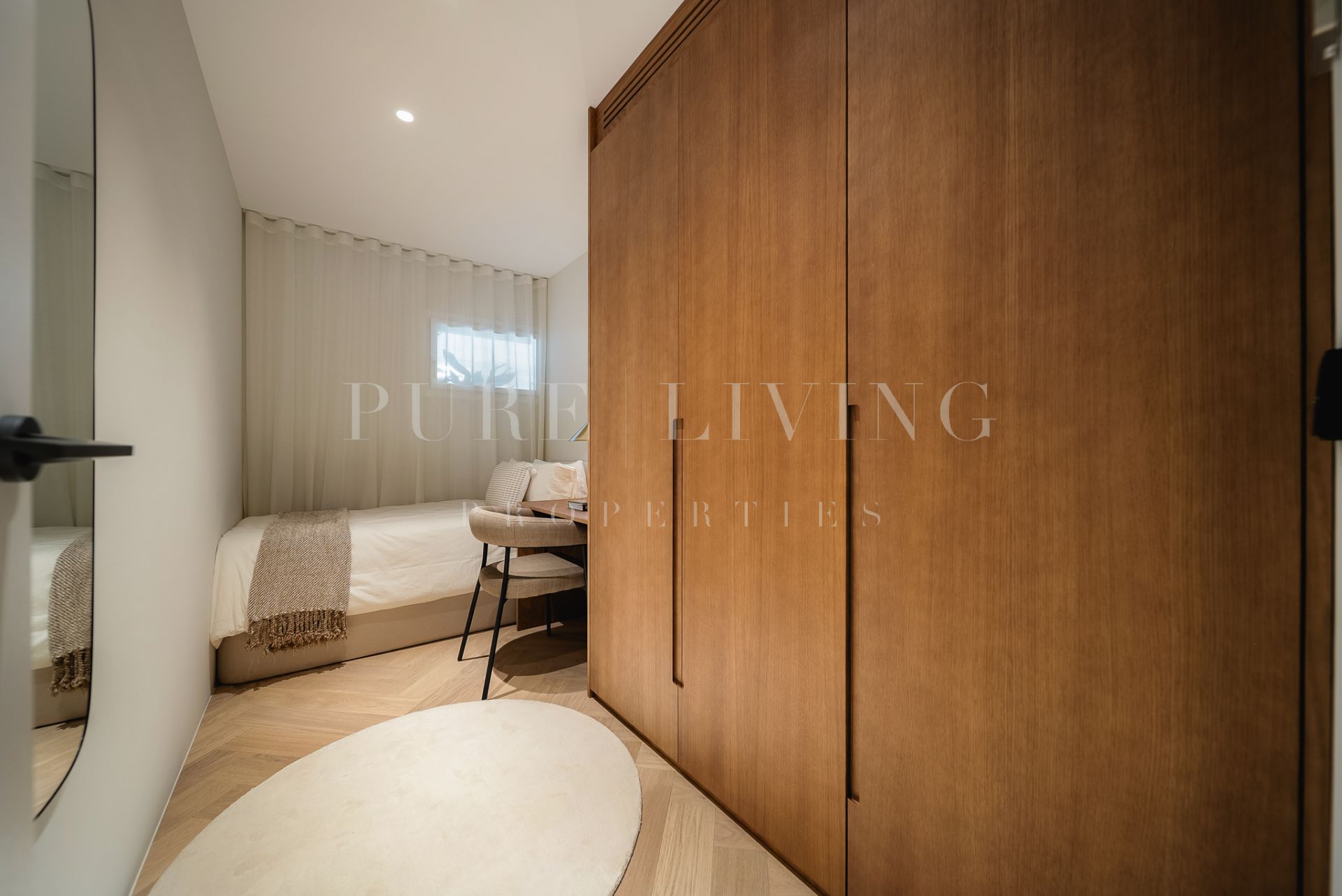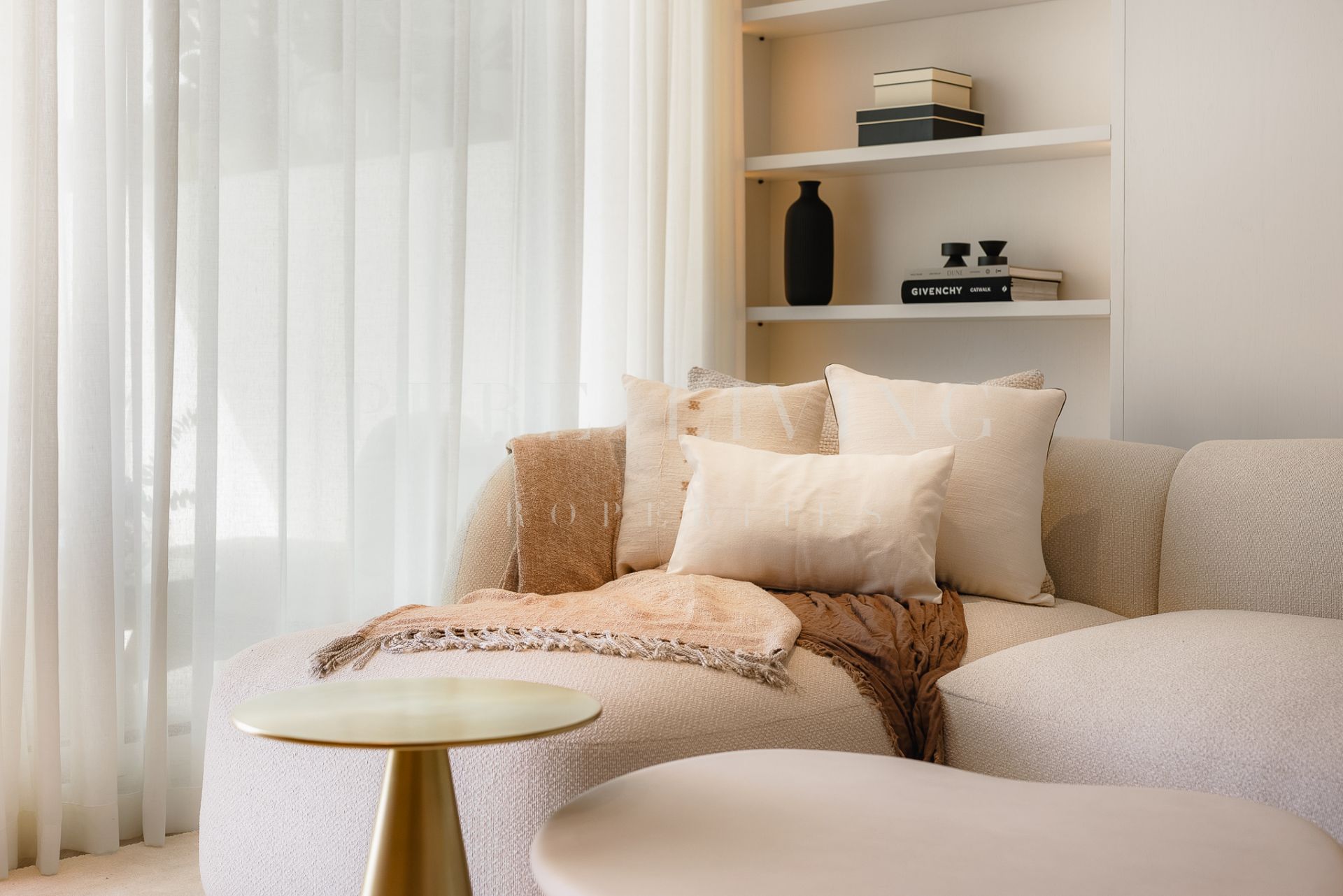 Bespoke carpentry subtly reflects the building’s signature curved architecture, creating a harmonious and fluid layout throughout. Soft neutral tones and natural materials evoke a timeless Mediterranean sophistication, seamlessly combined with modern functionality.