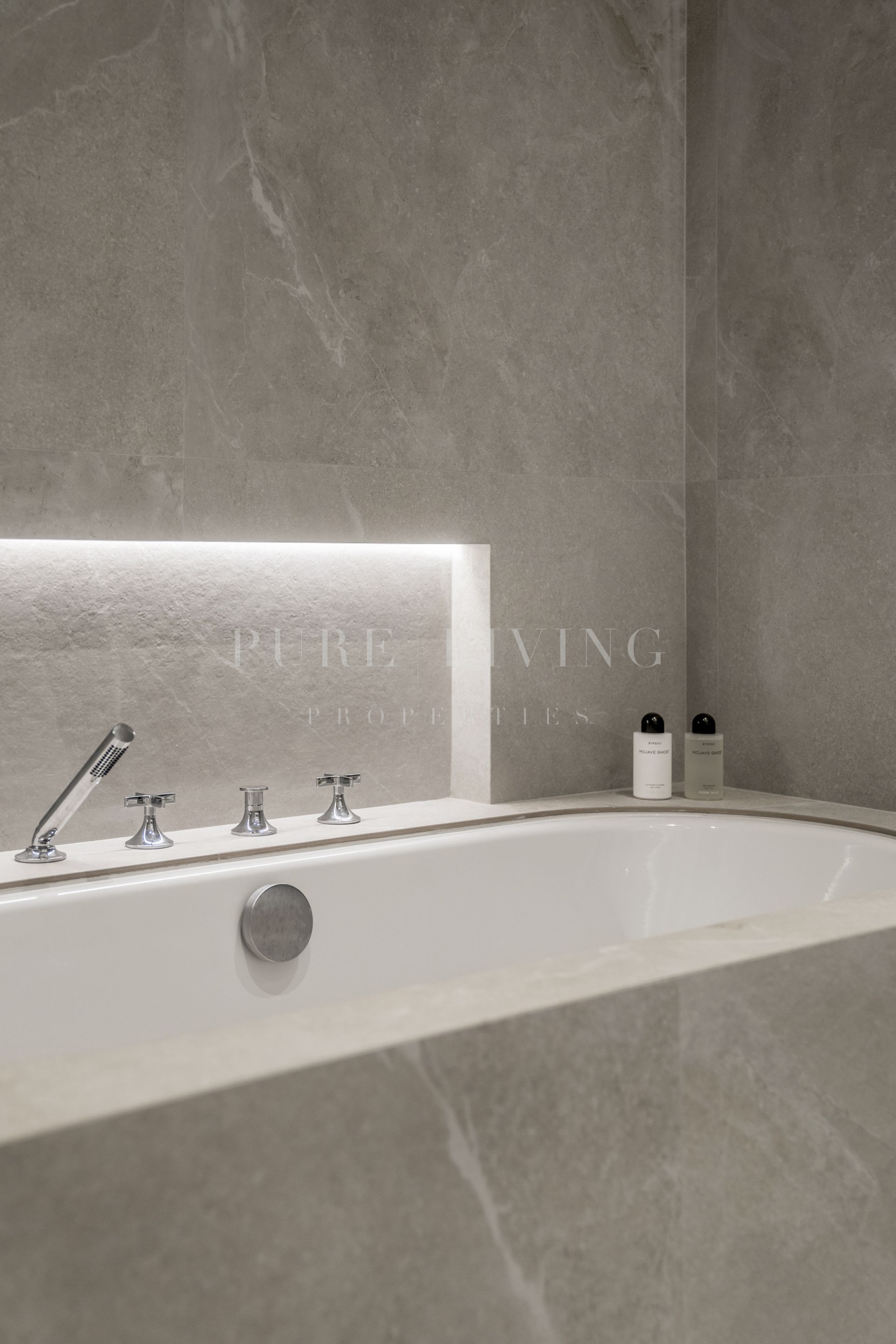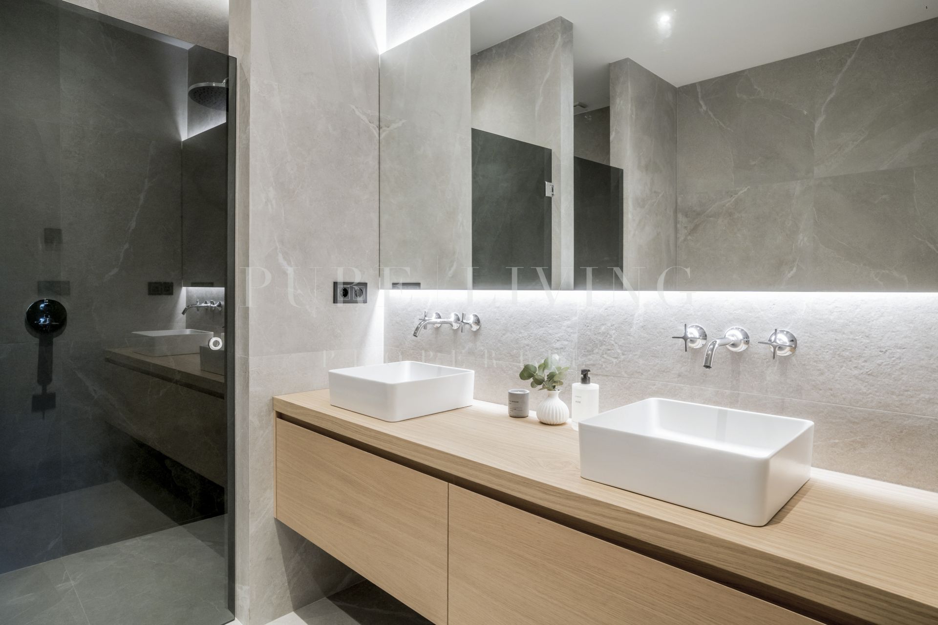 The three bedrooms exude refinement and comfort, featuring elegant wooden details, tailor-made wardrobes, and ambient LED lighting throughout. The bathrooms are tastefully designed, fitted with luxurious Dornbracht showers and fixtures. The master bathroom stands out with its bathtub and double vanity, creating a true spa-like retreat.