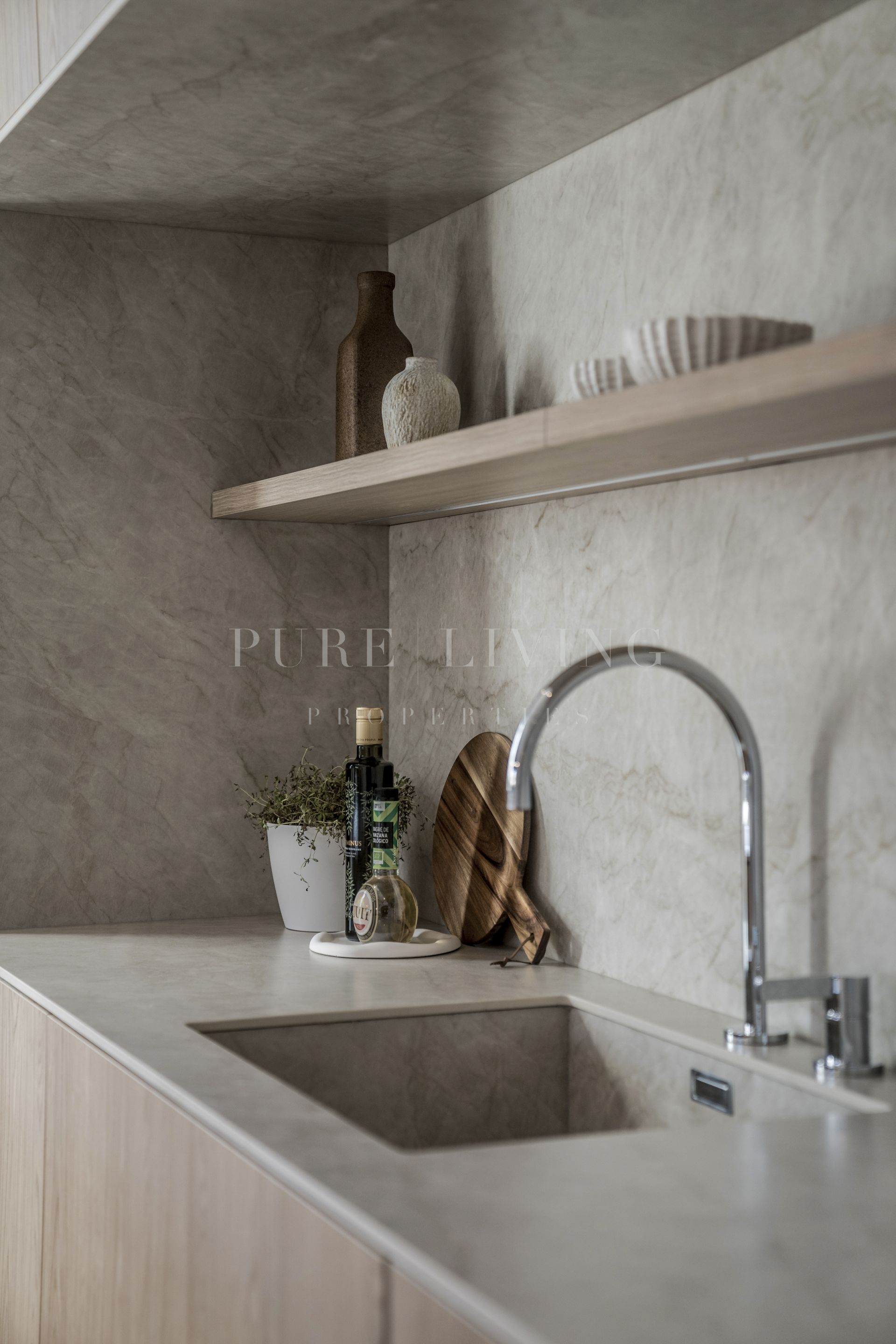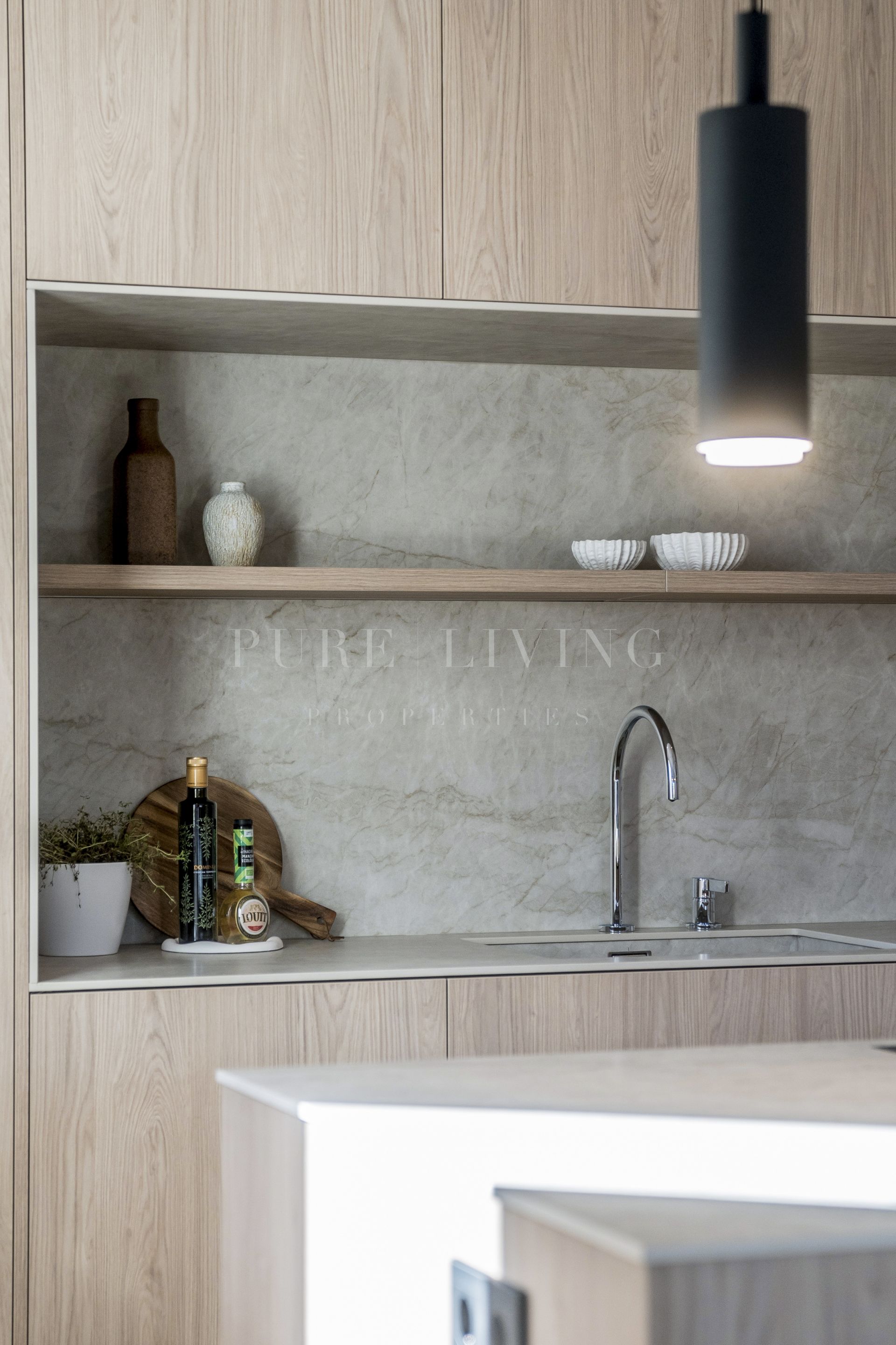 Upon entering the living space, you are immediately welcomed by a custom-designed kitchen that seamlessly blends sophistication with practicality. Rich wooden accents on the island and cabinetry are complemented by a serene ‘Taj Mahal’ marble countertop. With generous storage, expansive work surfaces, and a built-in wine cooler, this kitchen is perfectly suited for both everyday living and entertaining. The living area feels warm and inviting, highlighted by a striking TV feature wall and a spacious bench offering additional storage.