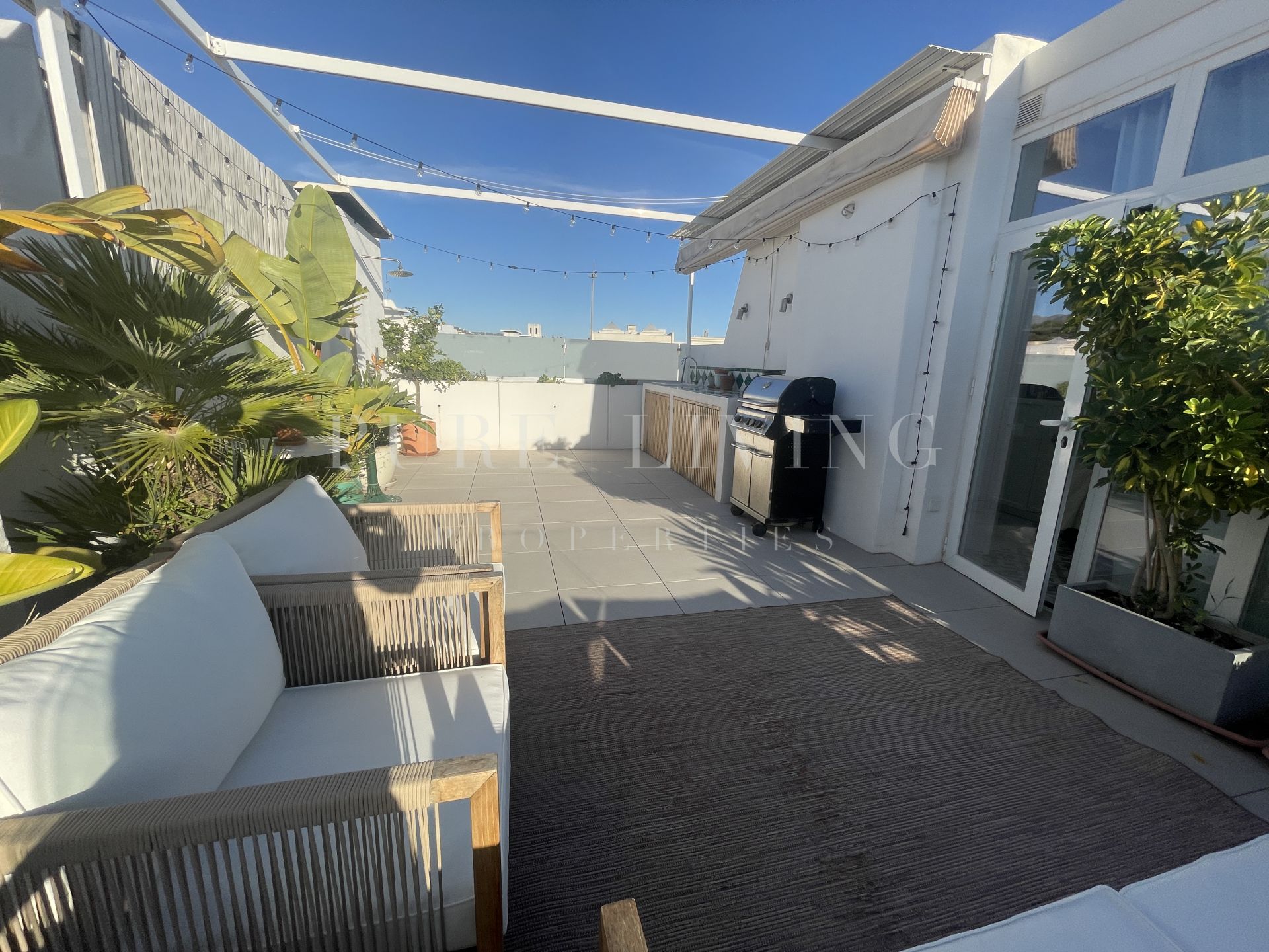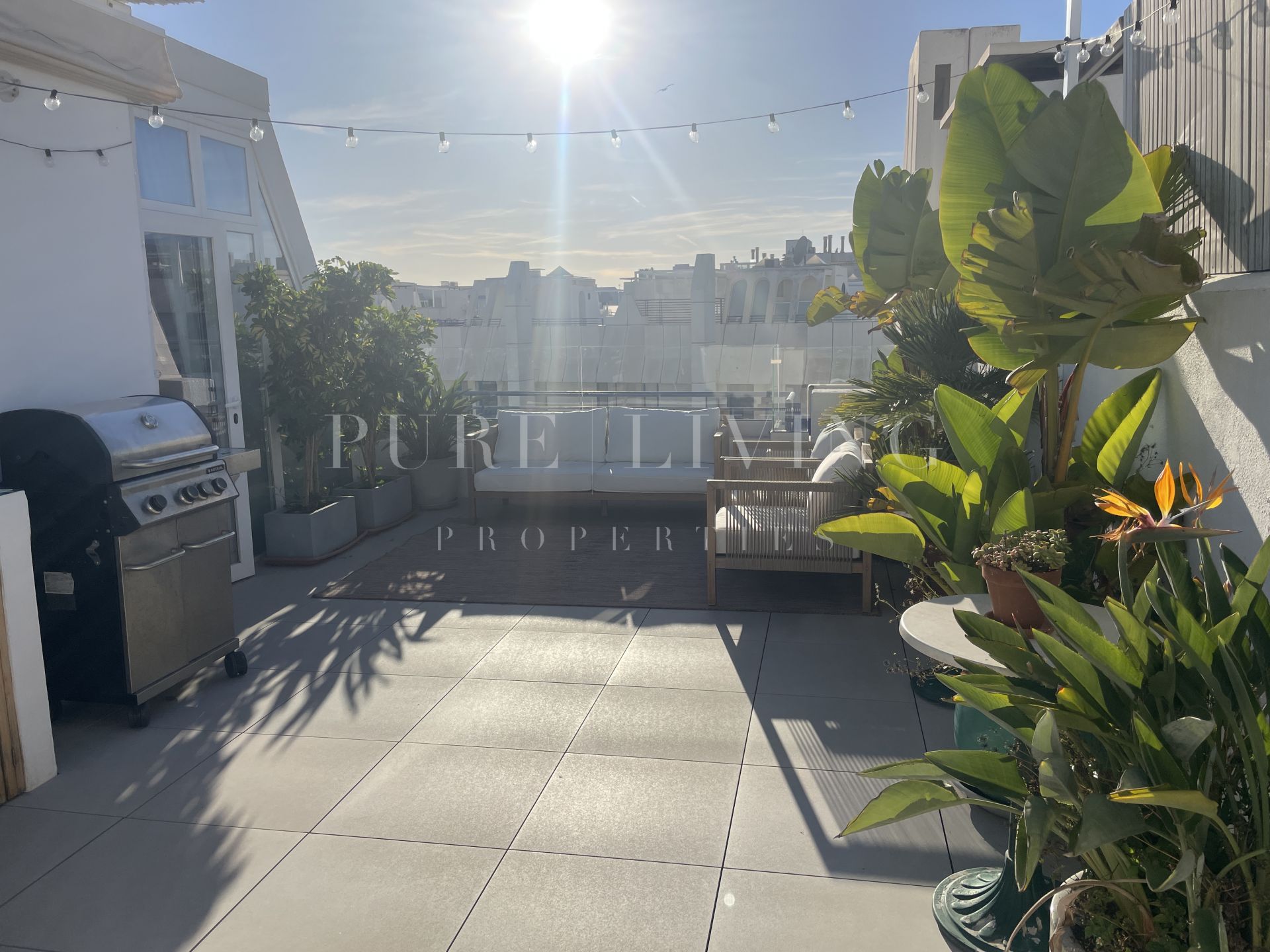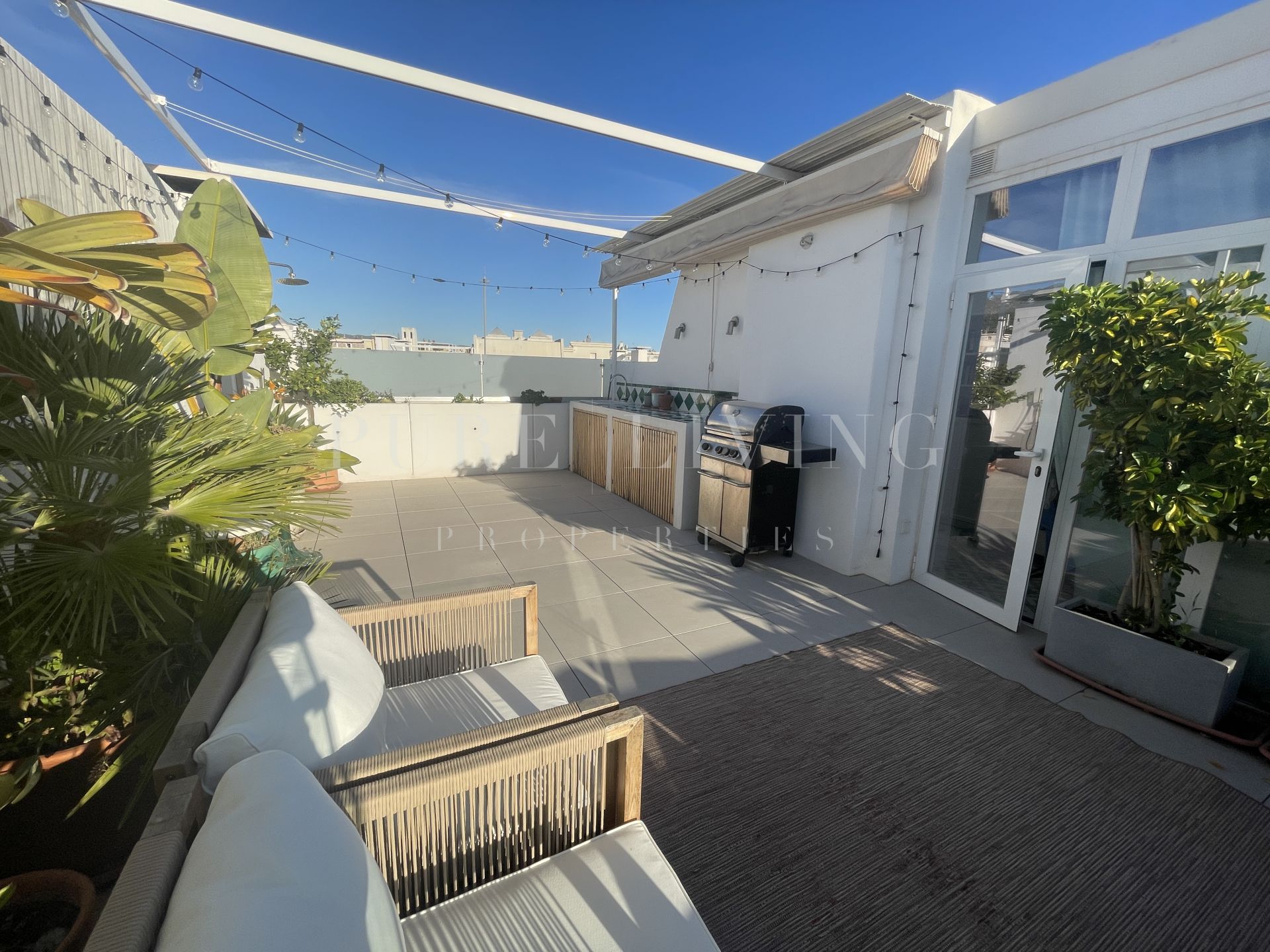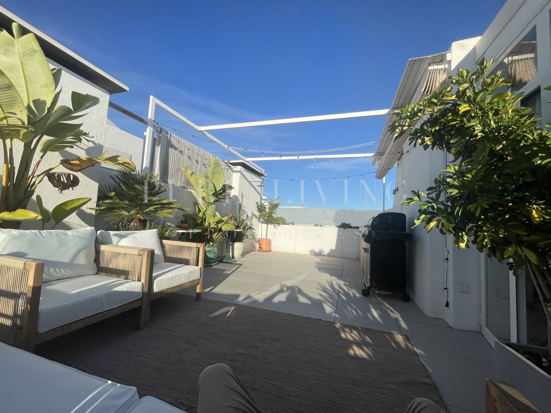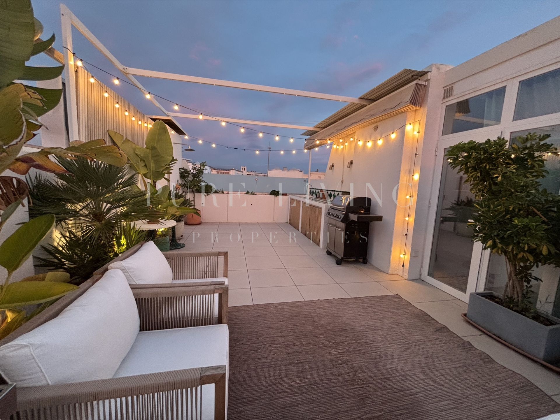Fully renovated with high-quality materials and finishes, the penthouse is spread over three levels designed to maximize natural light and Mediterranean views.