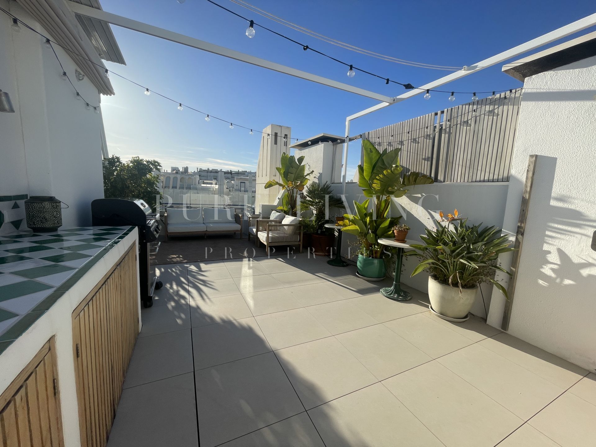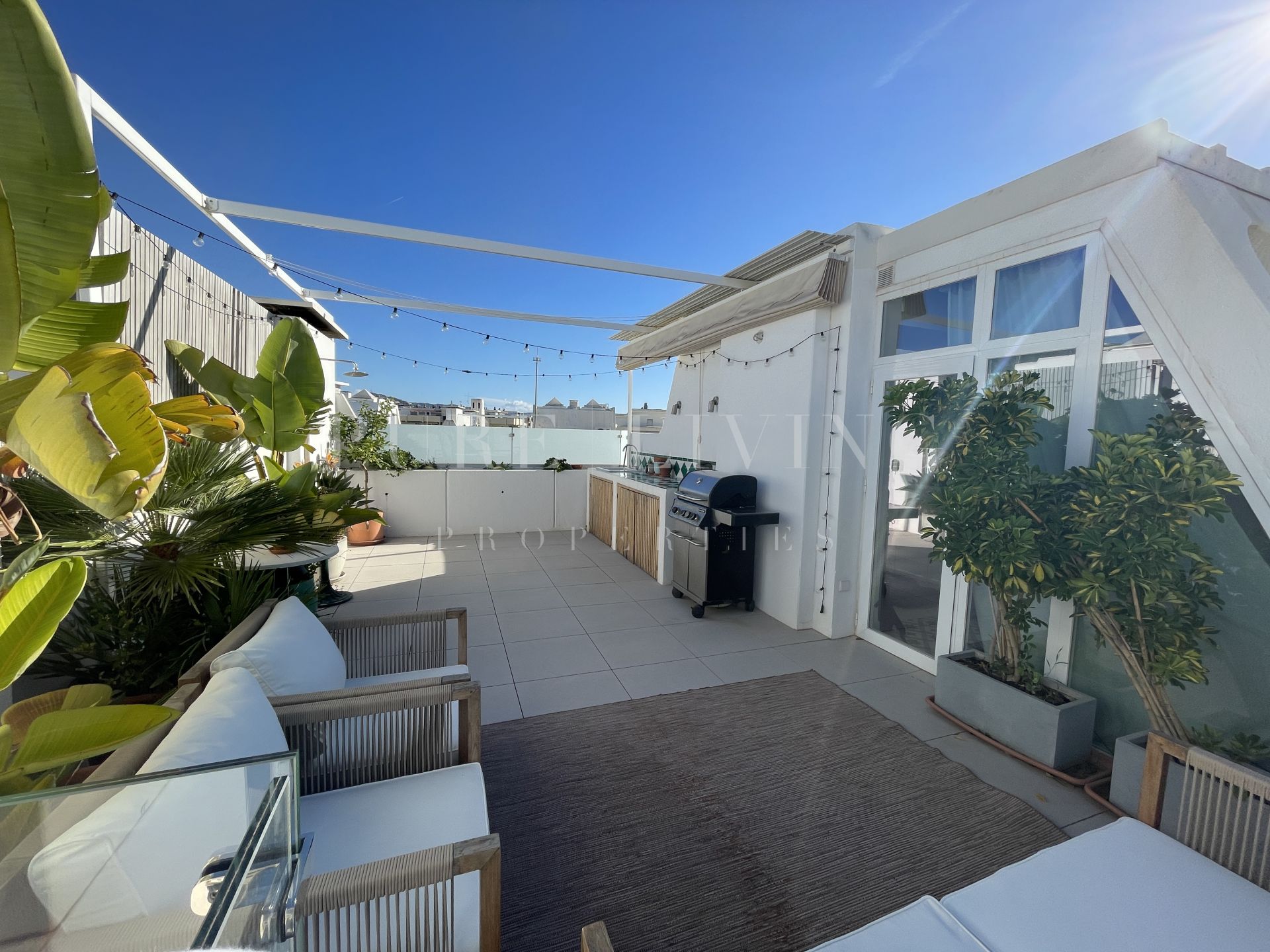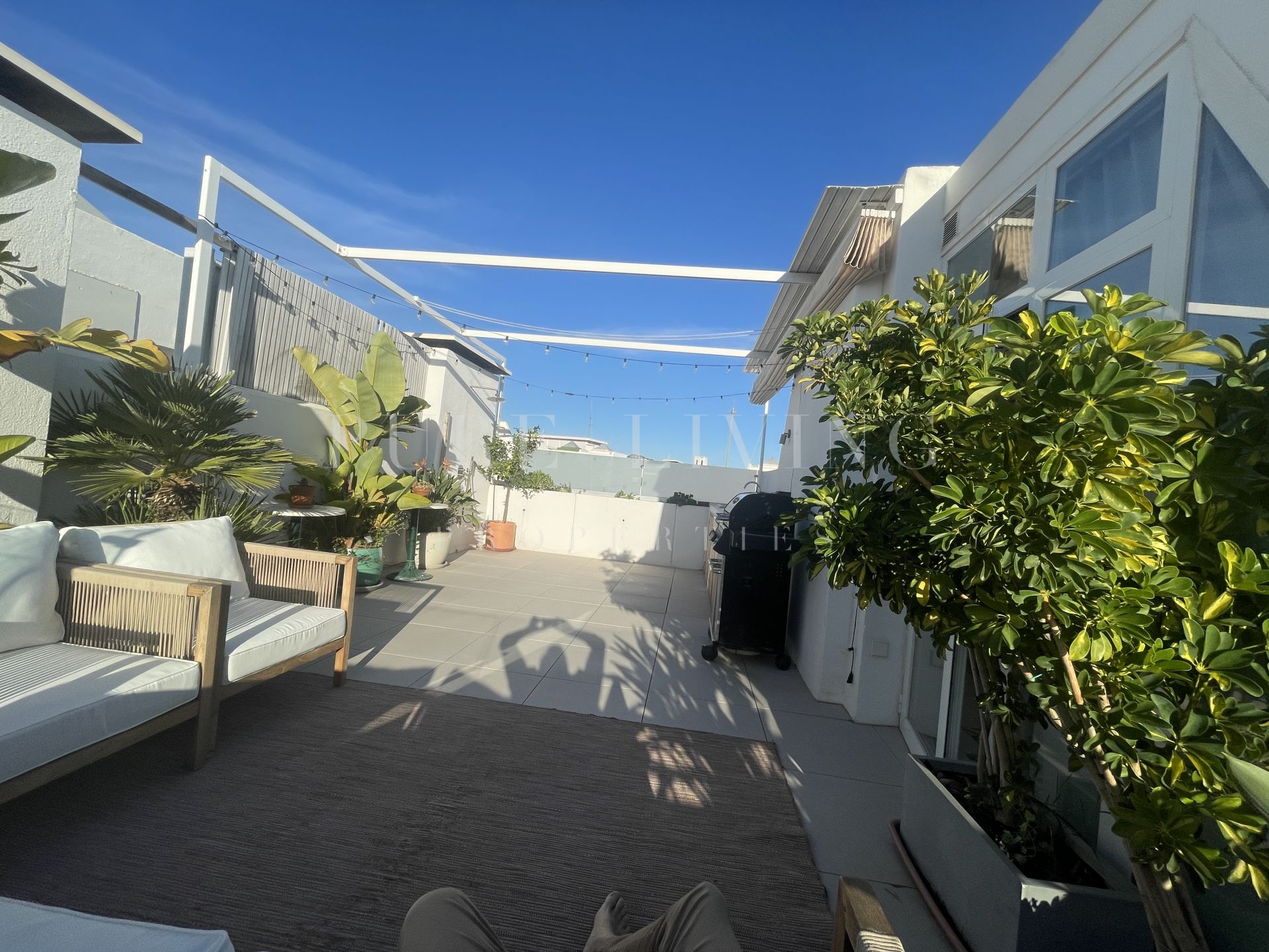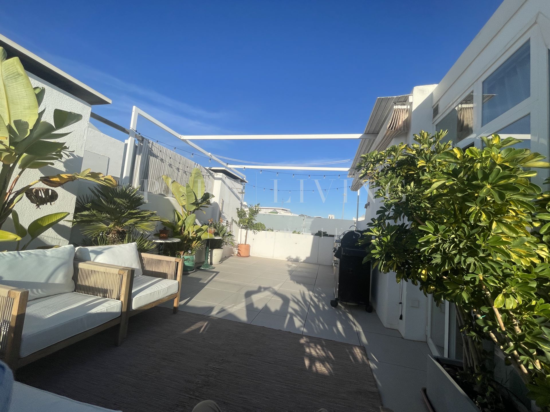 Fully renovated with high-quality materials and finishes, the penthouse is spread over three levels designed to maximize natural light and Mediterranean views.