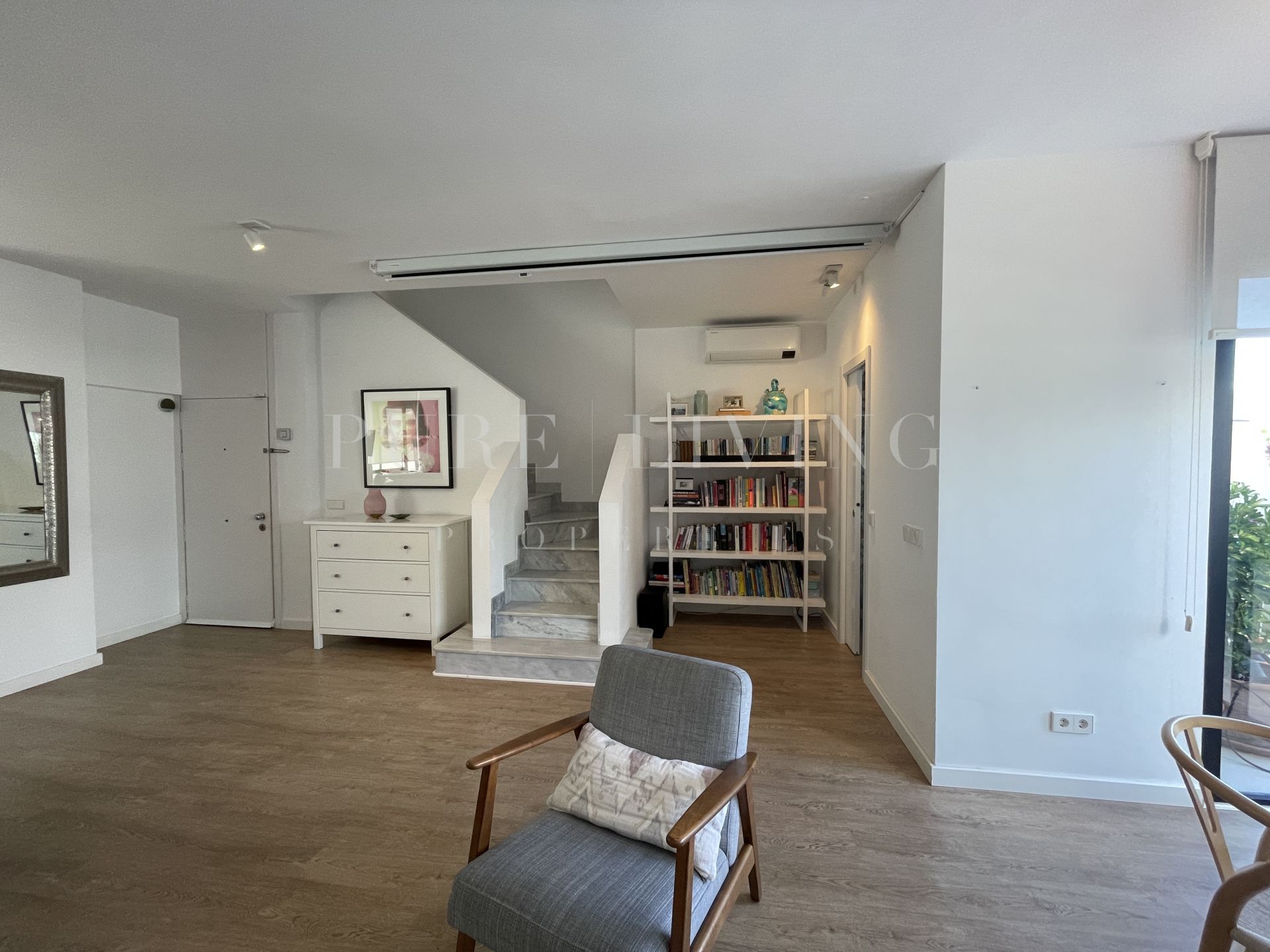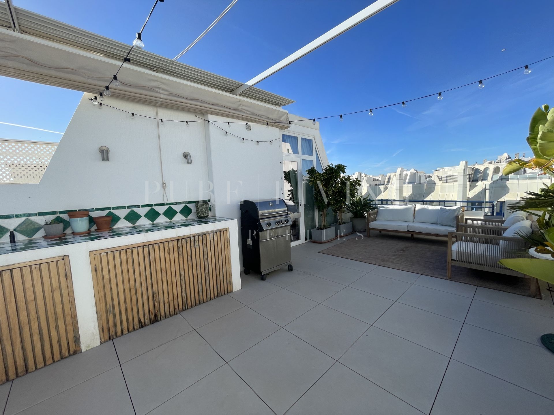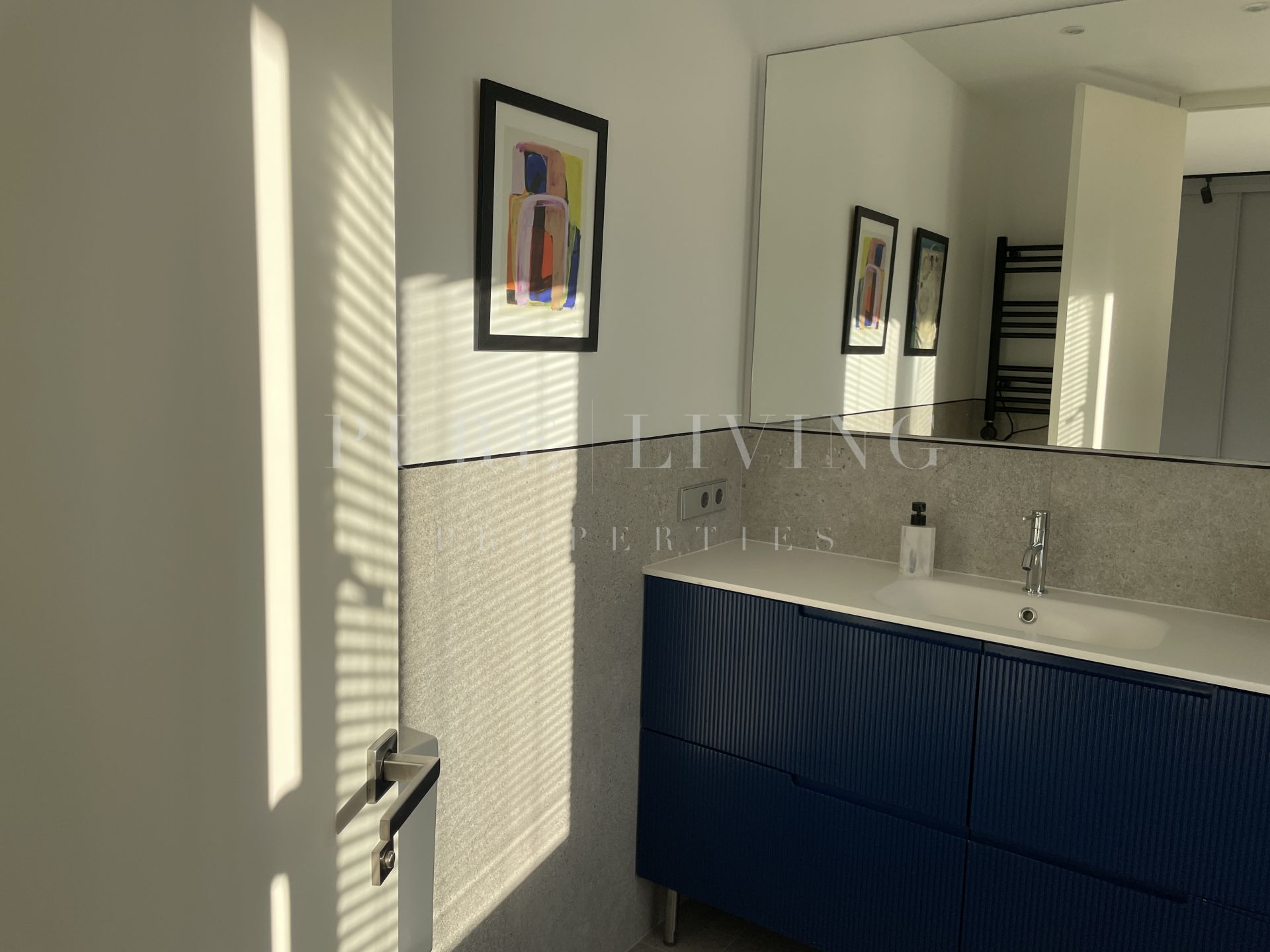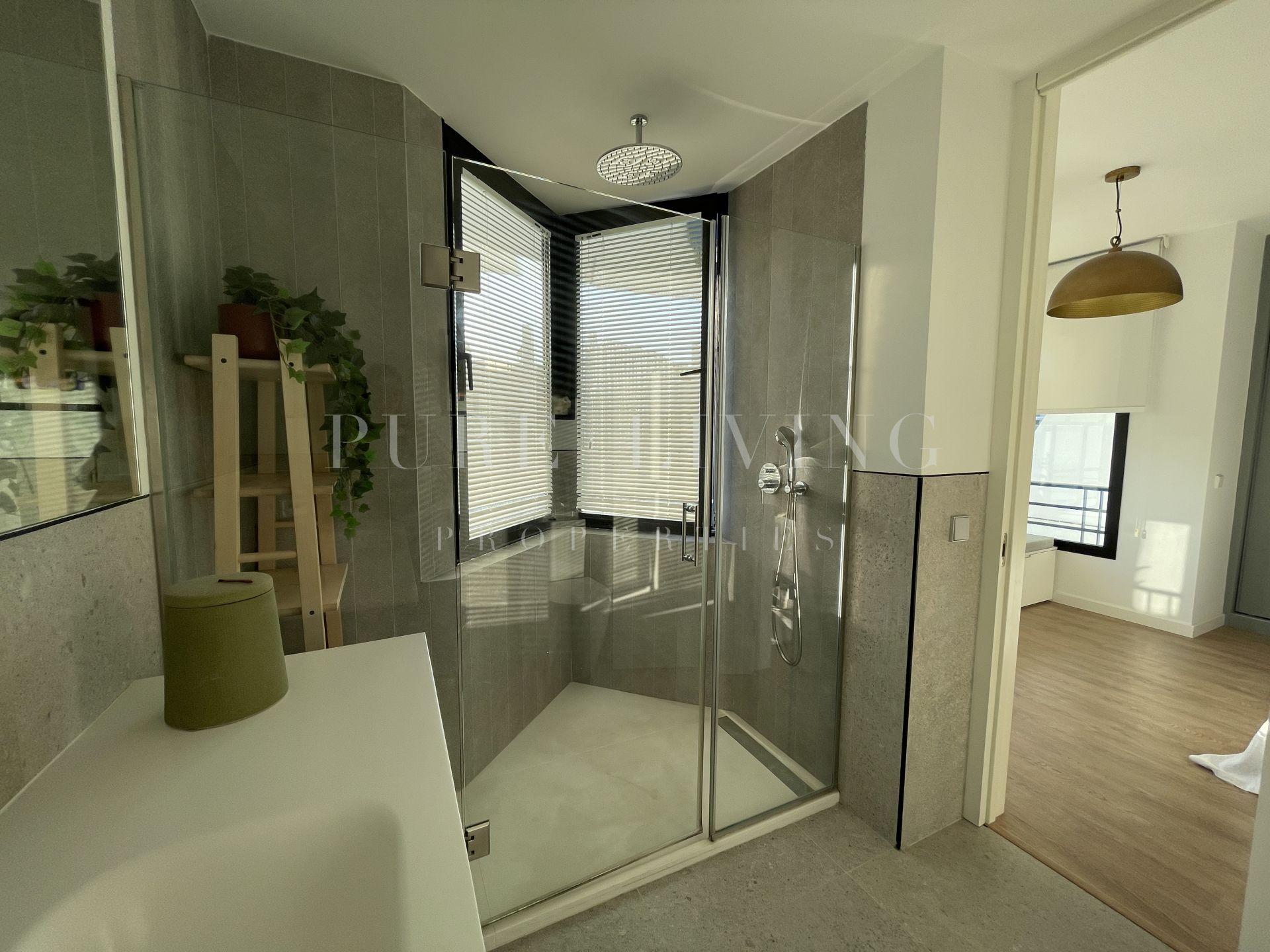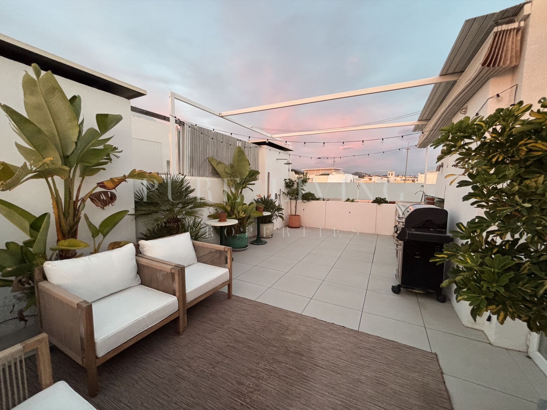 Fully renovated with high-quality materials and finishes, the penthouse is spread over three levels designed to maximize natural light and Mediterranean views.