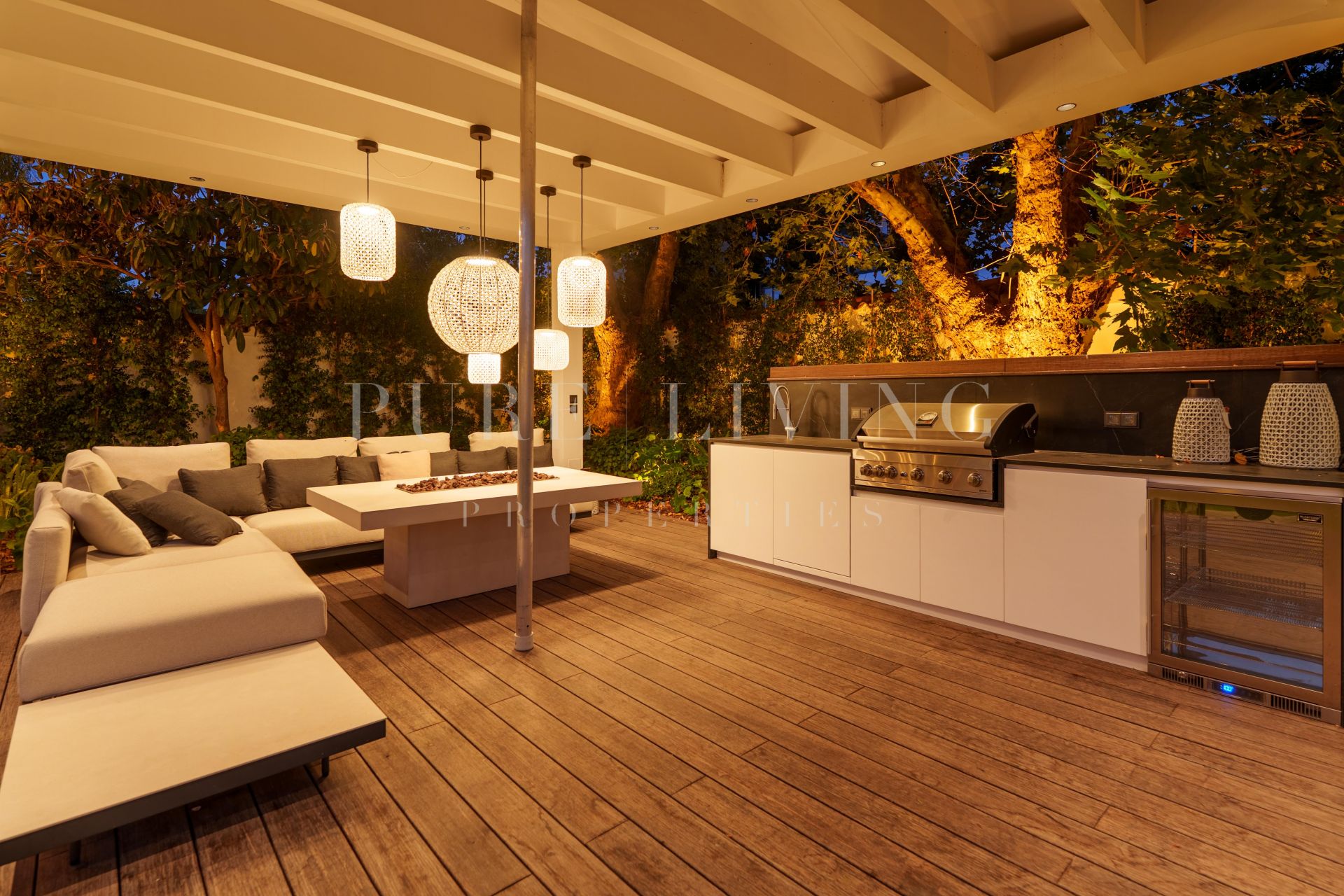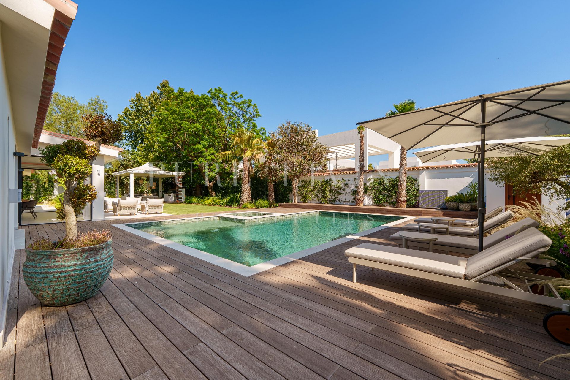 Outdoors, the meticulously landscaped garden has been thoughtfully curated to maximize comfort and leisure. A large private pool sits at the center, bordered by an elegant wooden deck adorned with sun loungers and parasols. Multiple lounging areas, a shaded outdoor kitchenette with built-in BBQ, and a chic pergola lounge make this space perfect for enjoying Marbella’s year-round sunshine in true al fresco style.