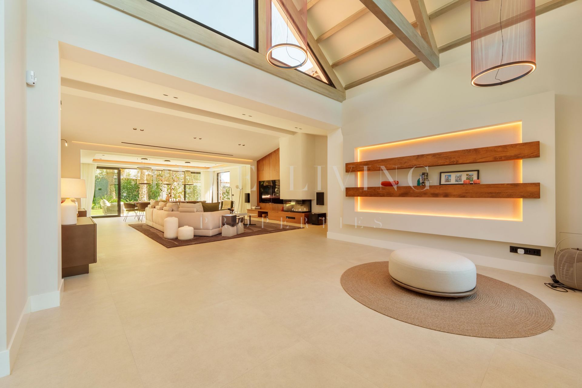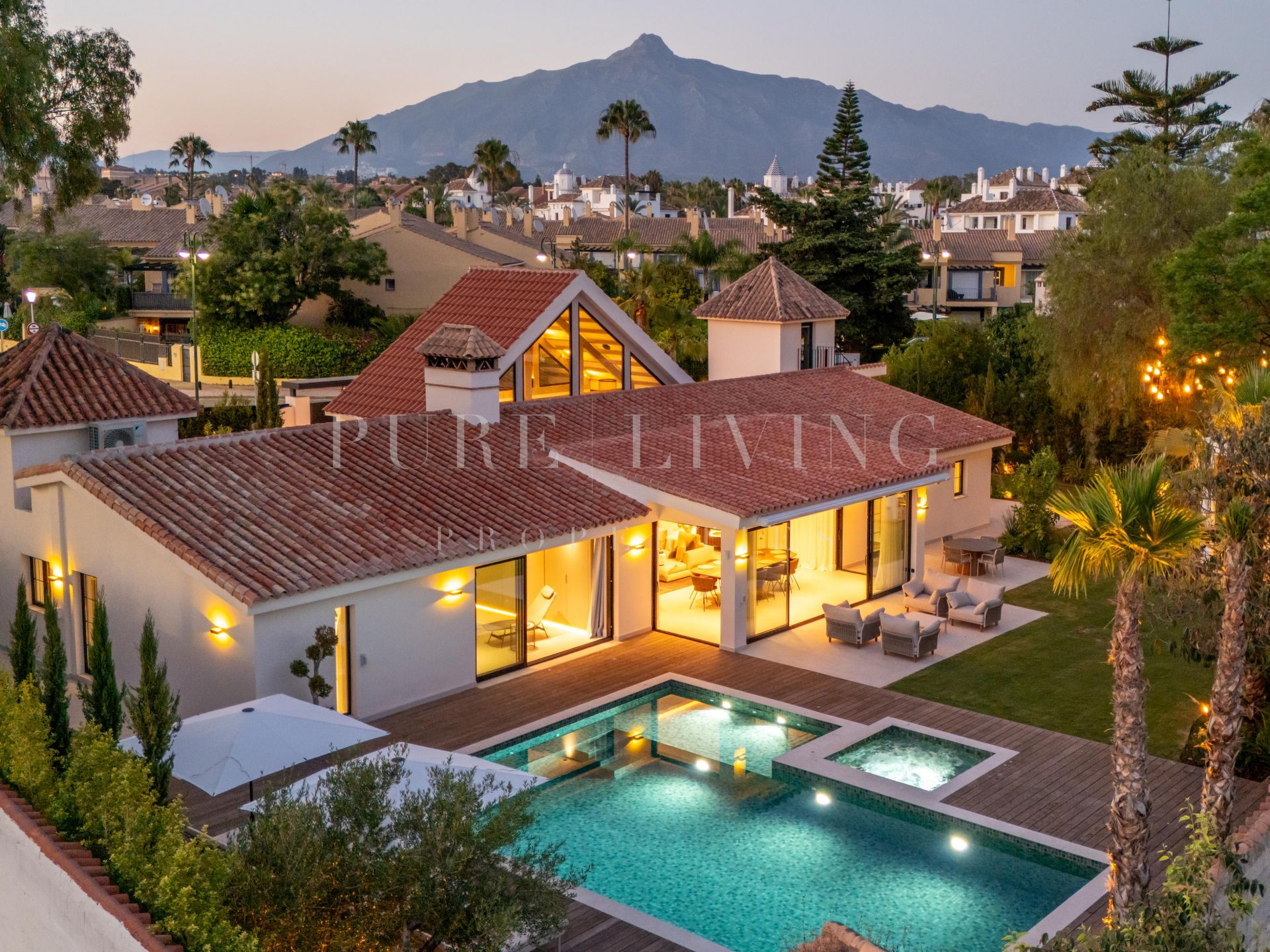 Situated just minutes from the vibrant energy of Puerto Banús, this stunning single-level villa offers a seamless blend of modern luxury and relaxed Mediterranean living. Nestled on a generous, private plot, the home showcases five spacious bedrooms, expansive open-plan interiors, and an eye-catching double-height entrance hall highlighted by a distinctive geometric roofline.