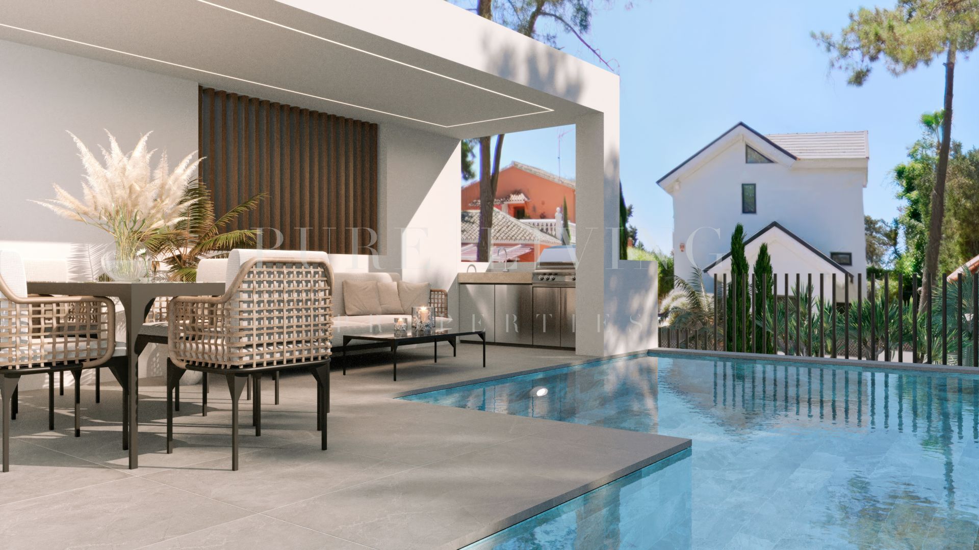 Upon arrival, the property immediately impresses with its thoughtfully designed outdoor areas. A combination of covered and open terraces provides versatile spaces to enjoy Marbella’s year-round climate. The landscaped garden surrounds the villa with lush greenery and features multiple areas for relaxation and entertaining, including an al fresco dining space, a dedicated chill-out zone, and a fully equipped barbecue area with kitchenette. Sun loungers are perfectly positioned around the private swimming pool, which is elegantly finished with Indonesian stone and incorporates a natural purification system. Completing the outdoor amenities are a luxurious jacuzzi and a private sauna, offering a true resort-style experience.