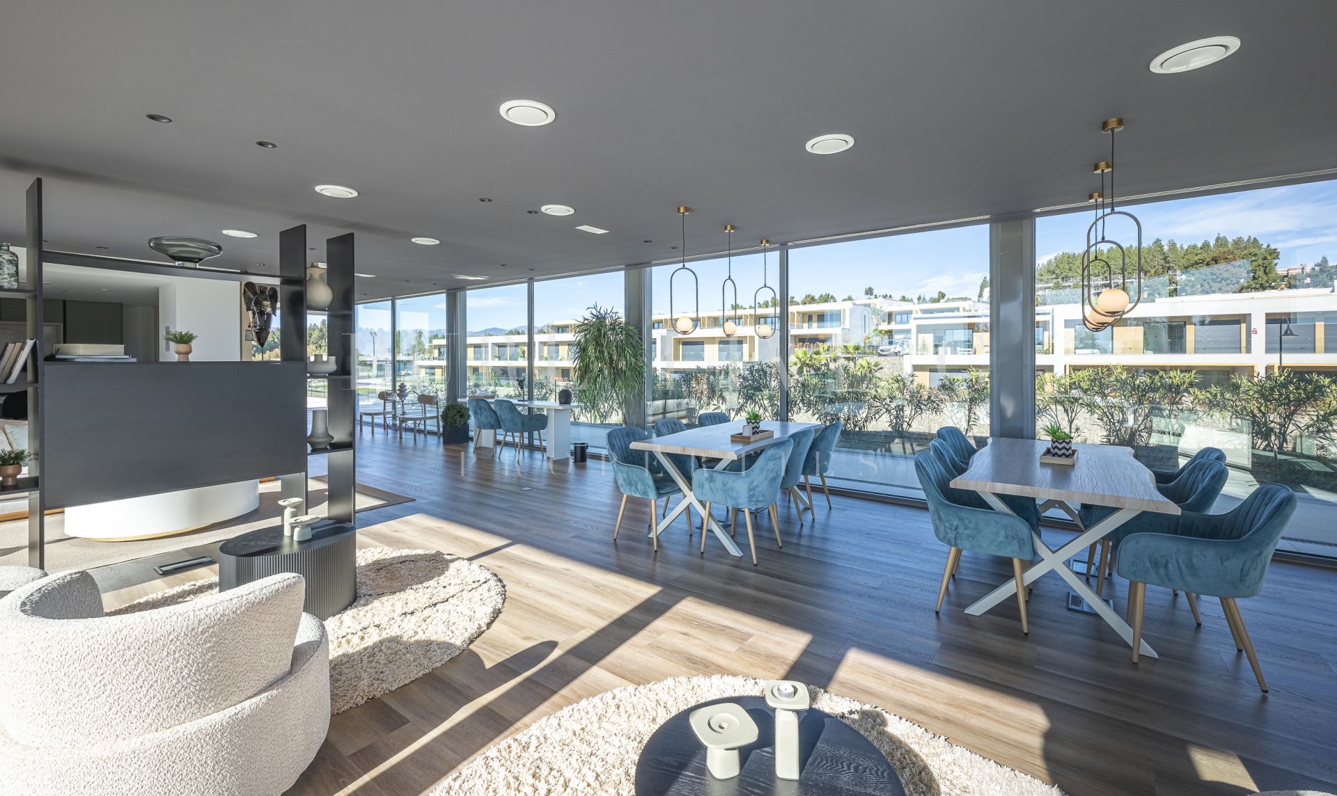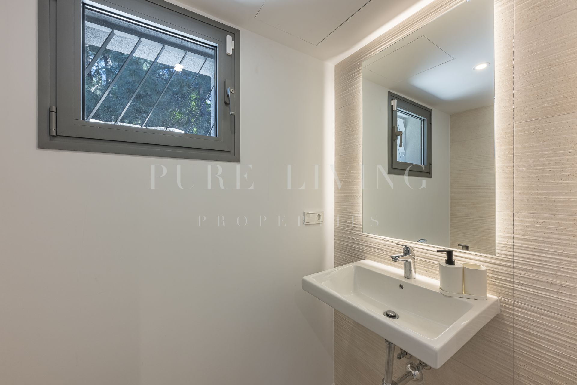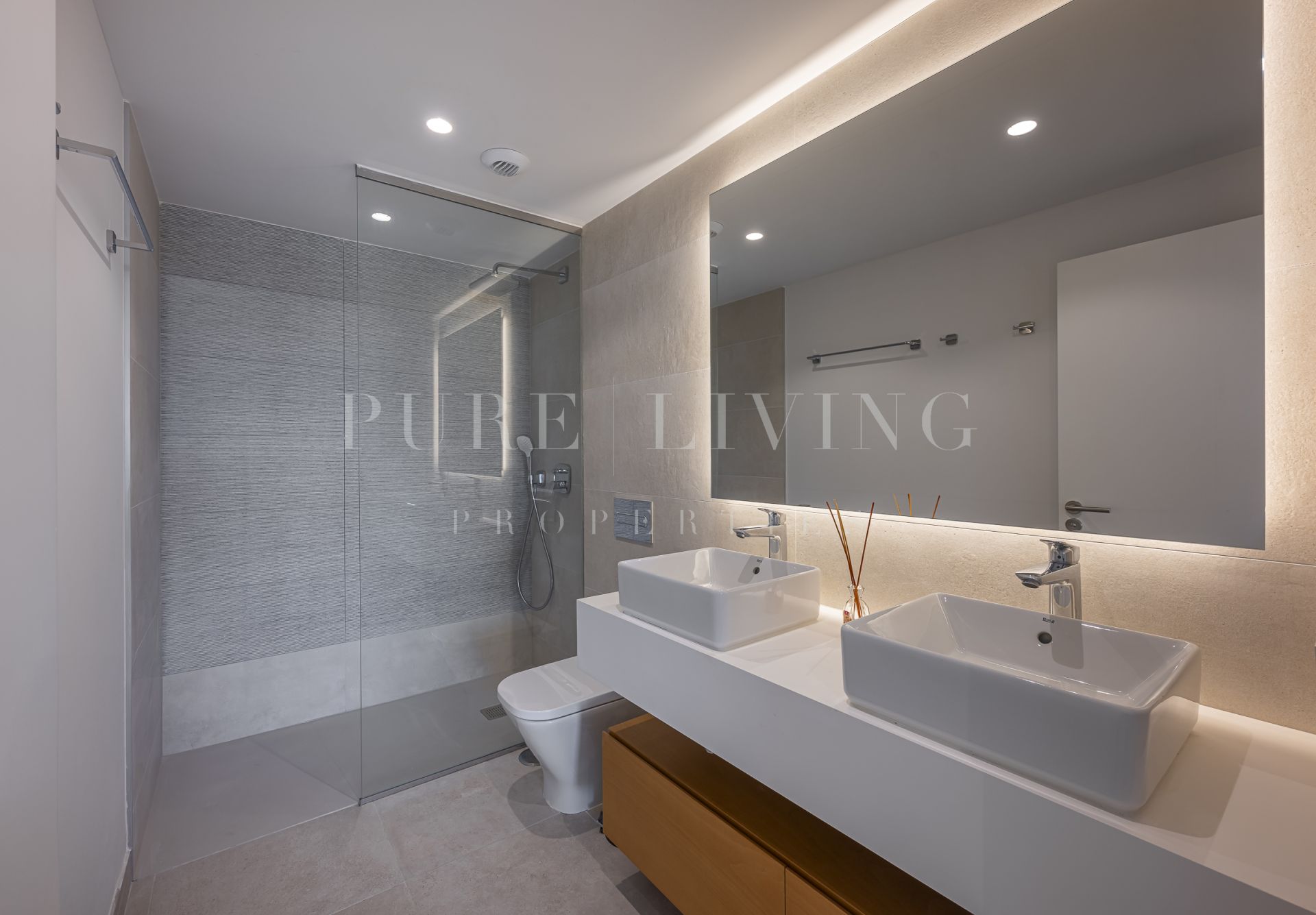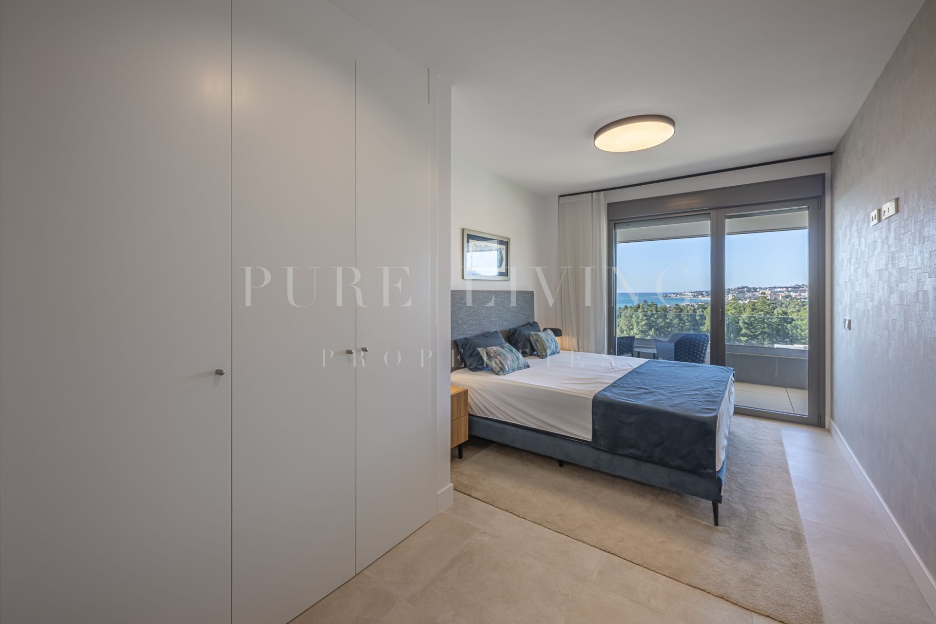 Expansive floor-to-ceiling windows open onto a large terrace, creating a seamless connection to the outdoors and framing magnificent Mediterranean views. A stylish guest toilet completes this level.