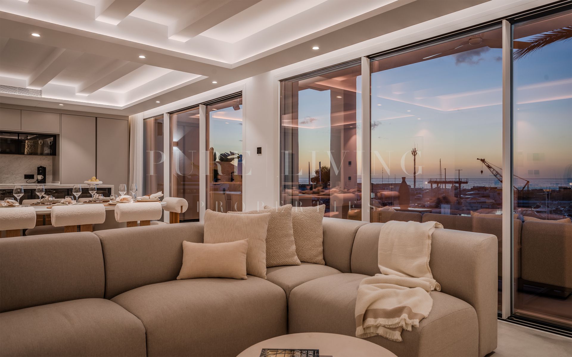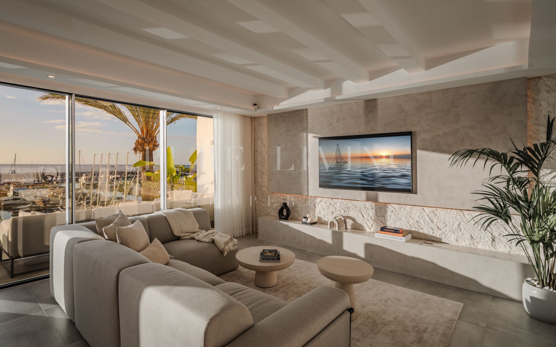 A luminous and expansive duplex penthouse situated on the prestigious frontline in Puerto Banús, meticulously designed and styled by one of Marbella’s foremost architects. This exquisite residence features a grand, light-filled living room adorned with cream marble flooring and bespoke feature lighting, creating an atmosphere of refined elegance.