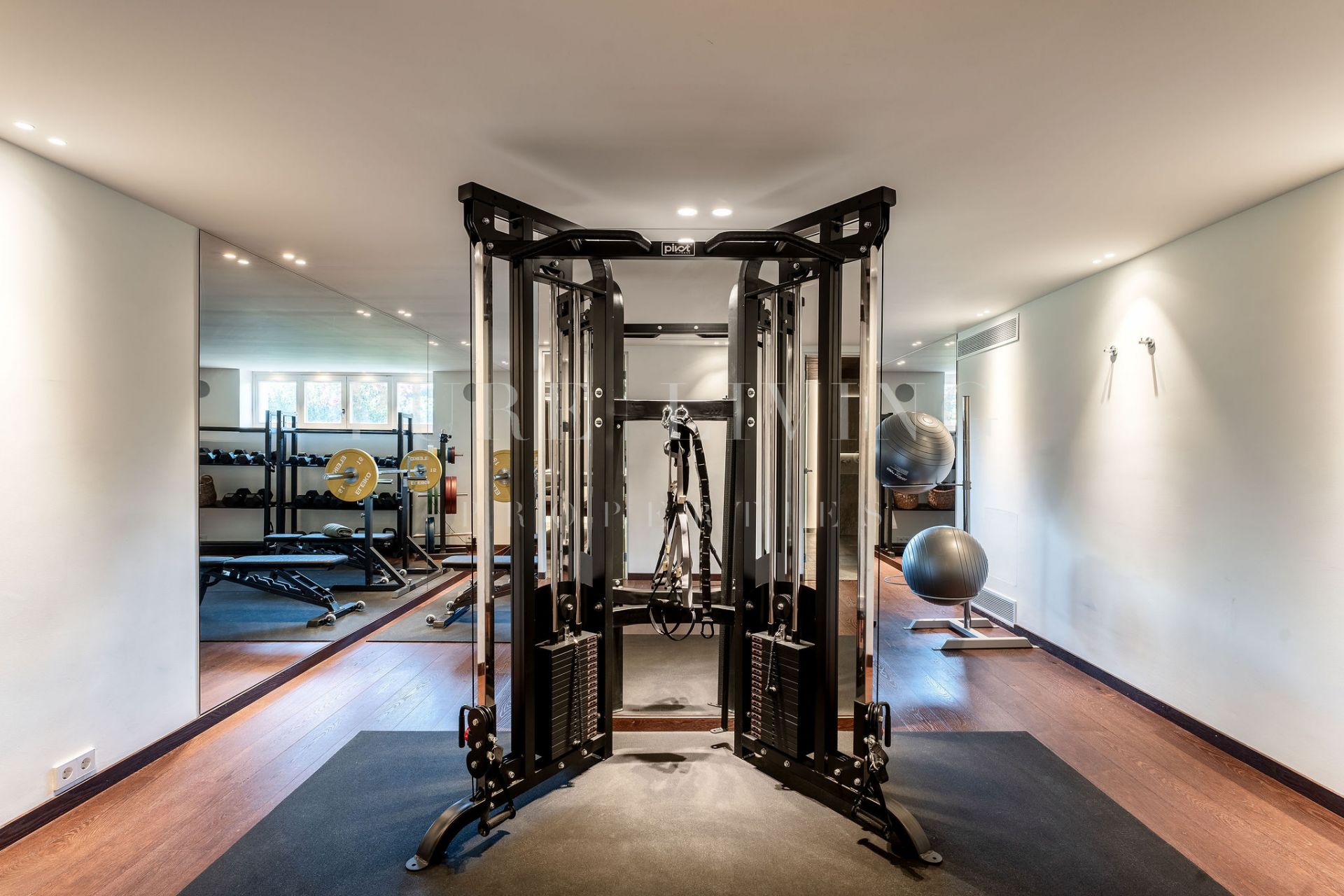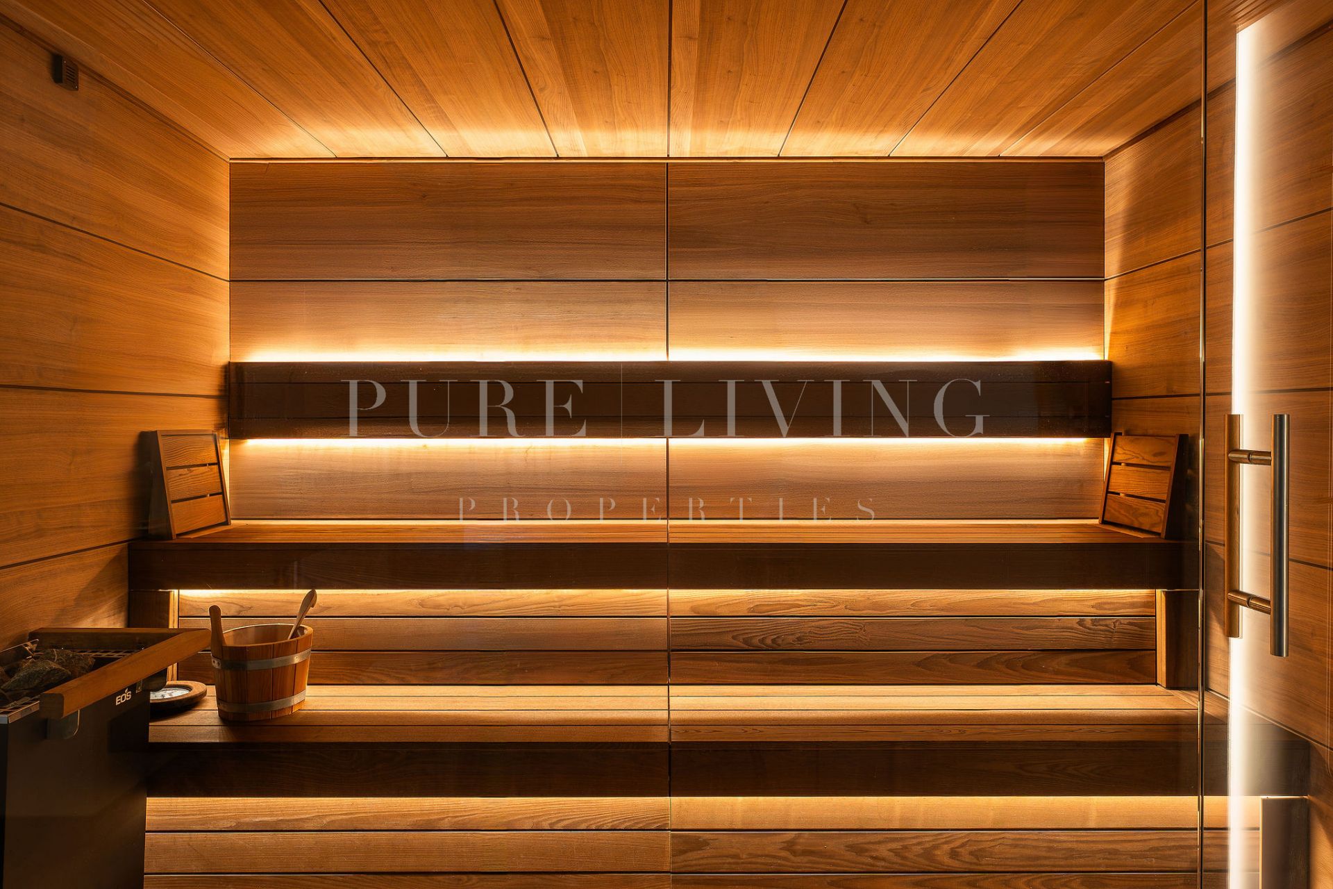 The lower level is designed for relaxation and entertainment, housing a private cinema, gym, massage room, sauna, Turkish bath, laundry area, and a garage for two cars. Two more bedrooms with en-suite bathrooms complete this floor, providing ample accommodation for family or guests.