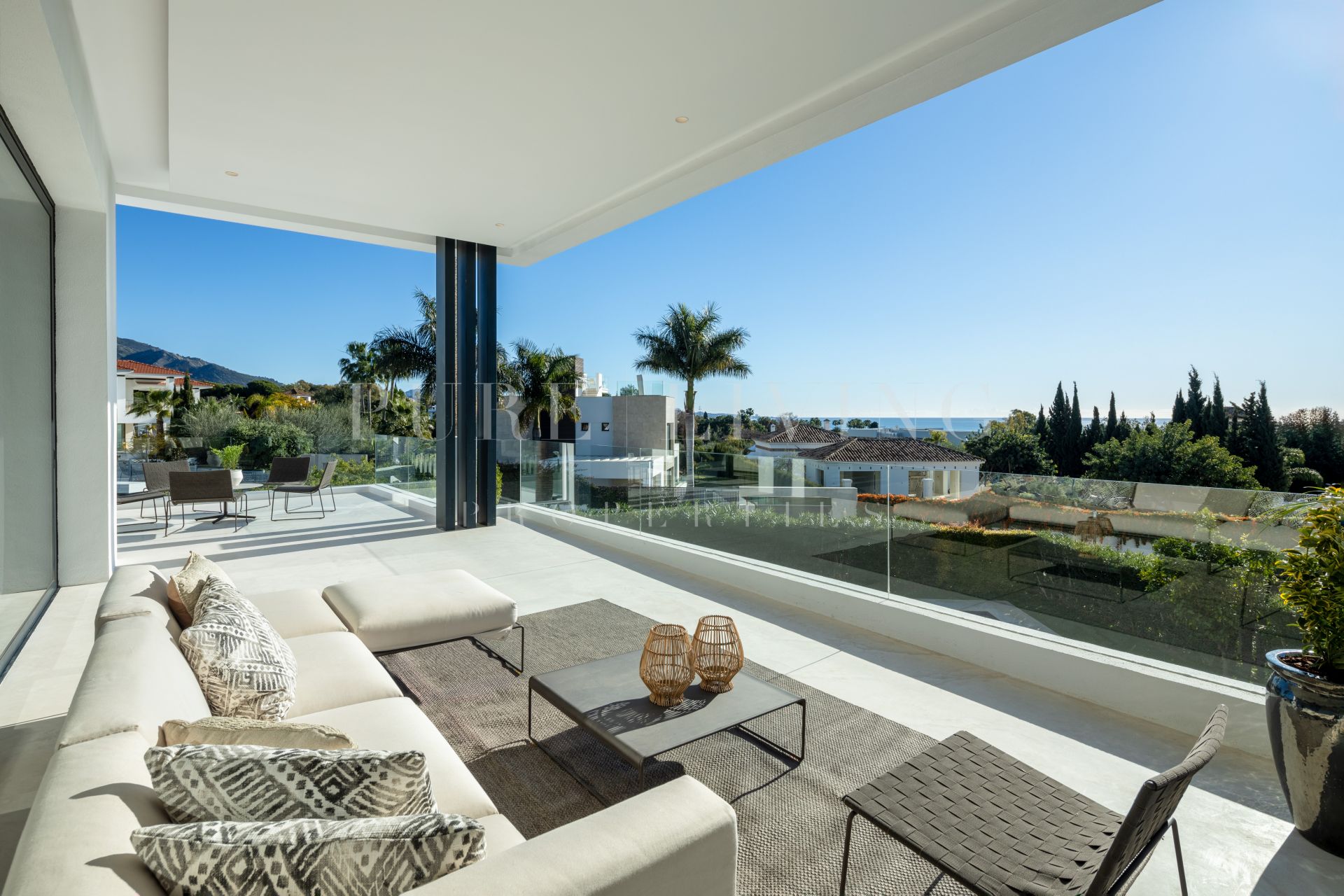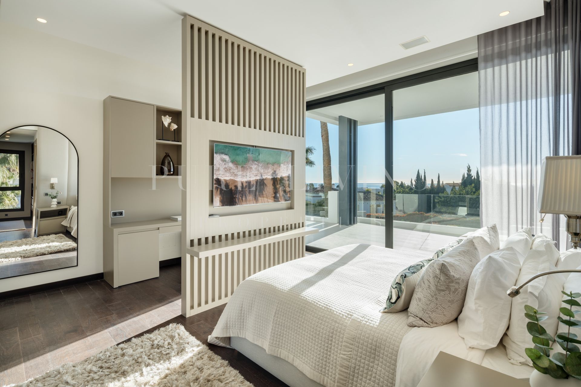En el interior, la villa es luminosa y contemporánea, con luz natural que inunda todos los espacios. El salón, el comedor y la cocina de planta abierta fluyen sin esfuerzo hacia las terrazas, creando una conexión perfecta con el exterior. La cocina es elegante y moderna, equipada con electrodomésticos de última generación y diseñada para ofrecer funcionalidad y estilo. Cada dormitorio está cuidadosamente diseñado para maximizar el confort, destacando la suite principal por su elegancia, sus generosas proporciones y sus excepcionales vistas al mar. El baño principal es un santuario, con ducha a ras de suelo, bañera independiente y tocador doble.