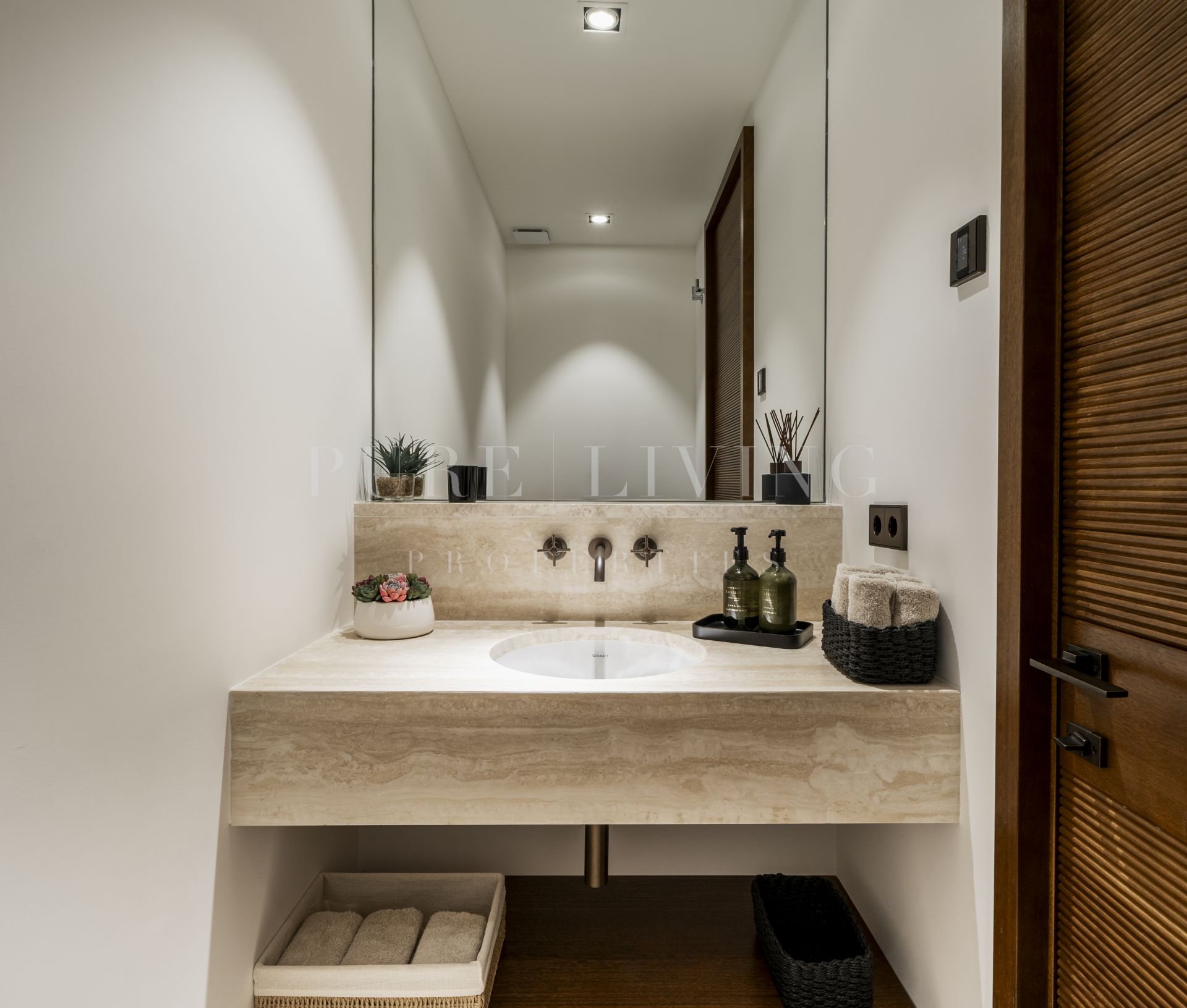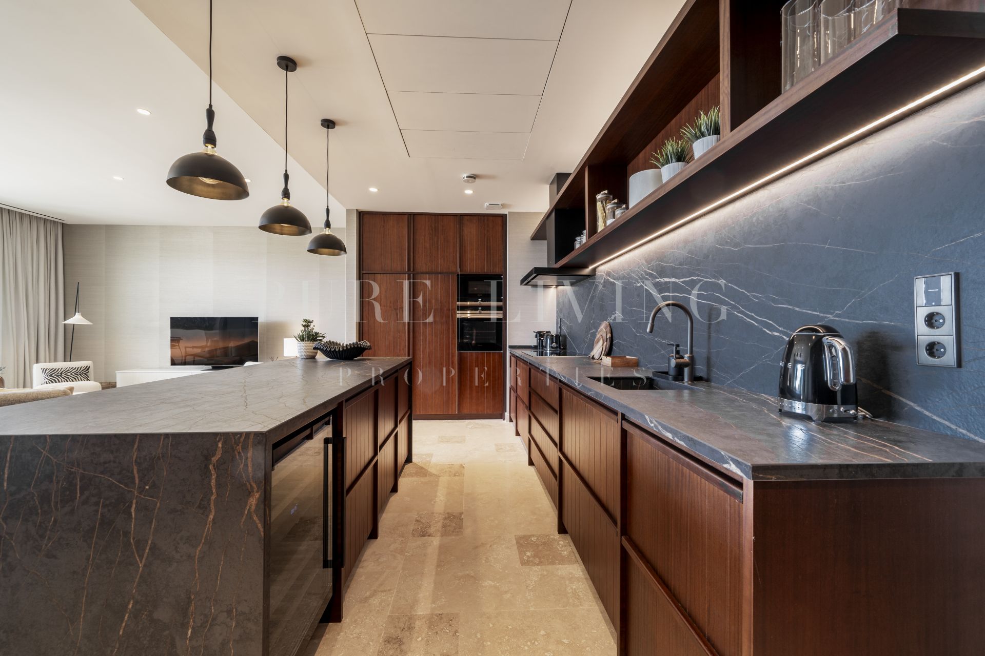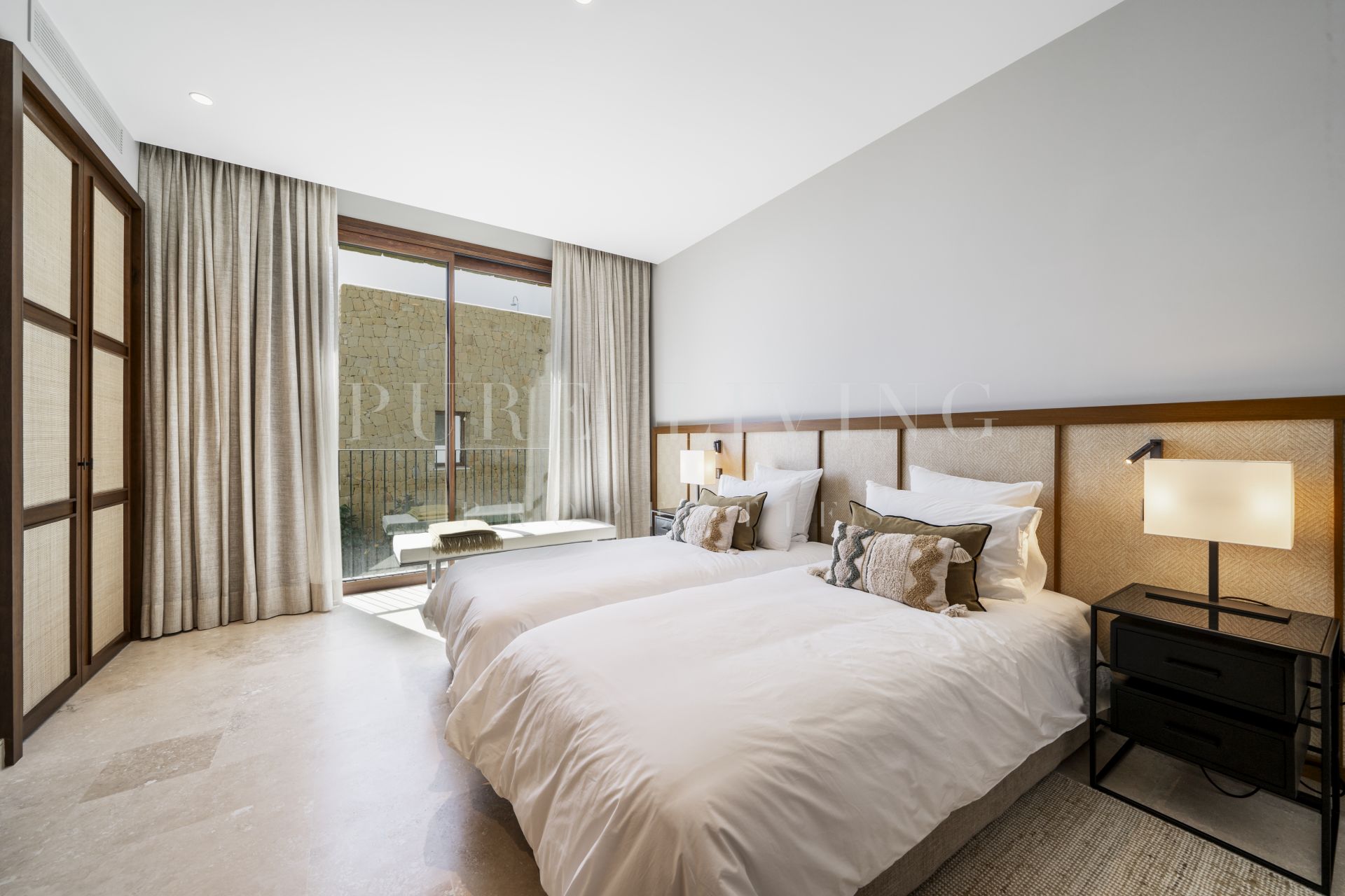 En el interior, el apartamento dispone de tres amplios dormitorios en suite, cada uno con lujosos baños de mármol de Carrara, equipados con doble lavabo y duchas a ras de suelo. La suite principal incluye un vestidor, bañera y grandes ventanales que se abren a la terraza. Los acabados en madera de alta calidad y una suave paleta de tonos arena crean una atmósfera cálida y acogedora, que se integra armoniosamente con el entorno natural.