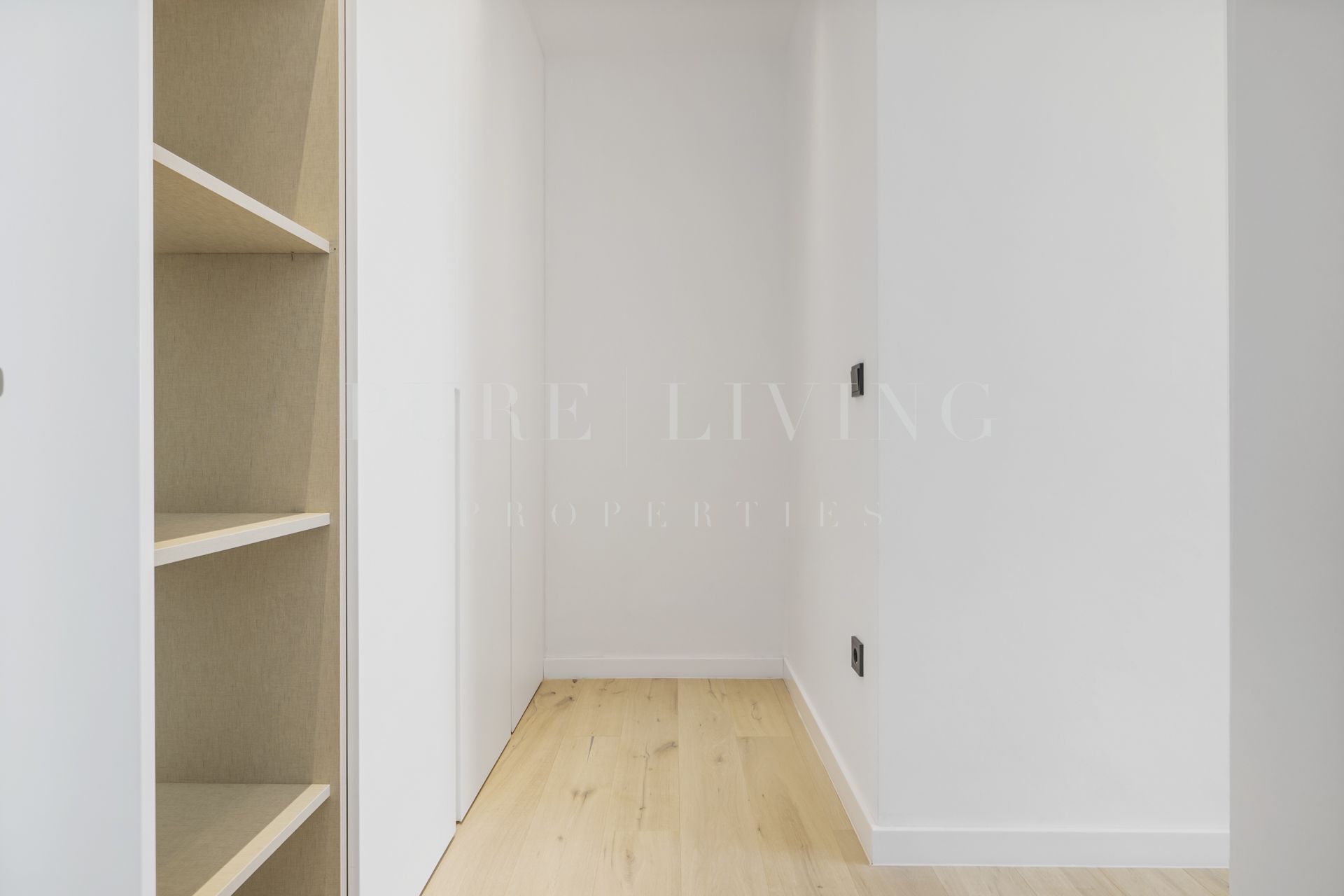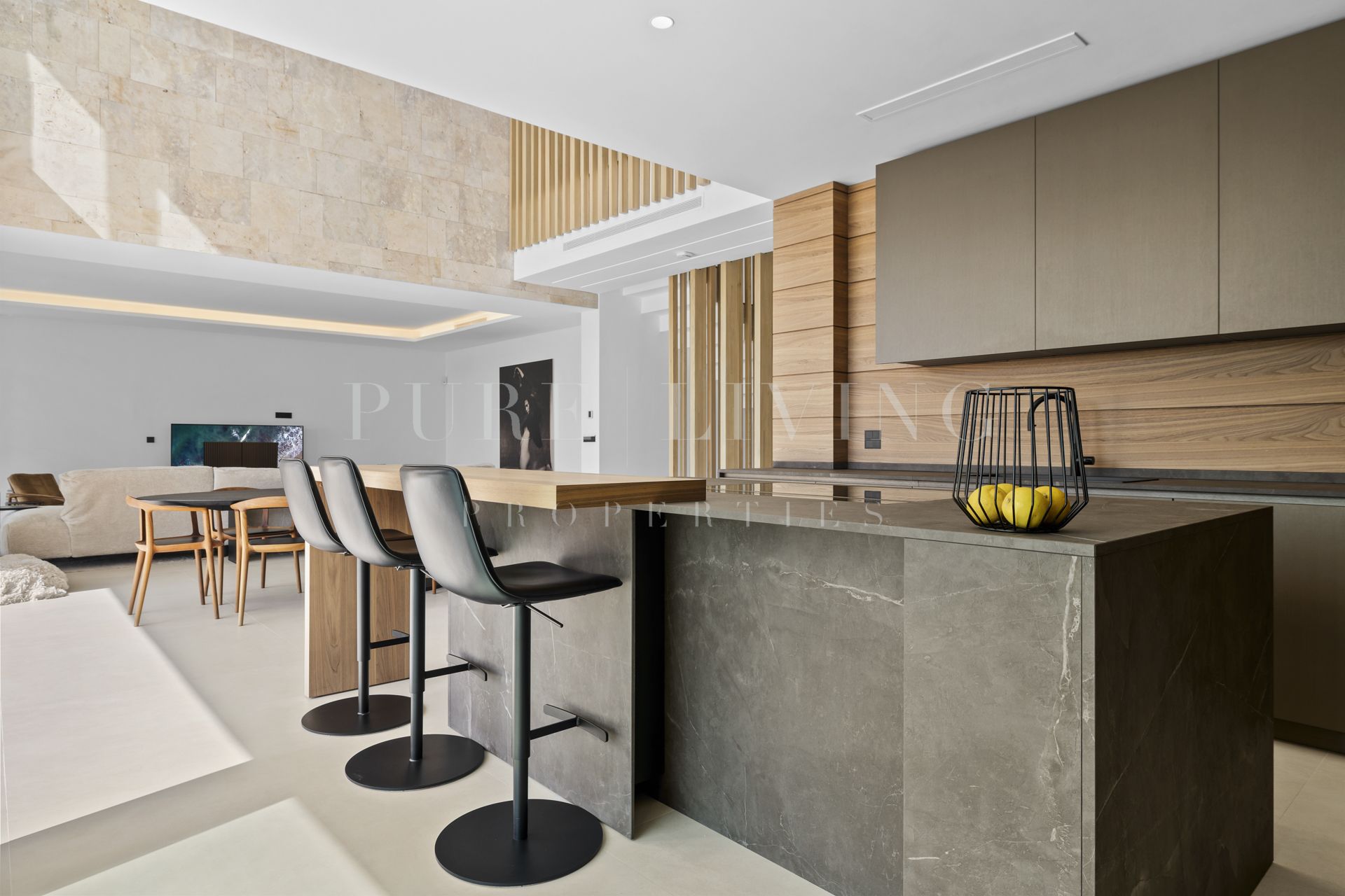 El acceso principal abre paso a un recibidor que conduce a un amplio espacio de salón y comedor, caracterizado por techos altos y ventanales que crean una sensación de amplitud y conexión con el exterior. La cocina de estilo abierto, de la prestigiosa firma Modul Nova y equipada con electrodomésticos Miele, se complementa con un lavadero independiente. En esta planta se dispone también de un aseo de cortesía y un dormitorio de invitados con baño privado. Desde las zonas de estar se accede directamente a terrazas cubiertas y soleadas, al jardín y a la piscina climatizada de agua salada.