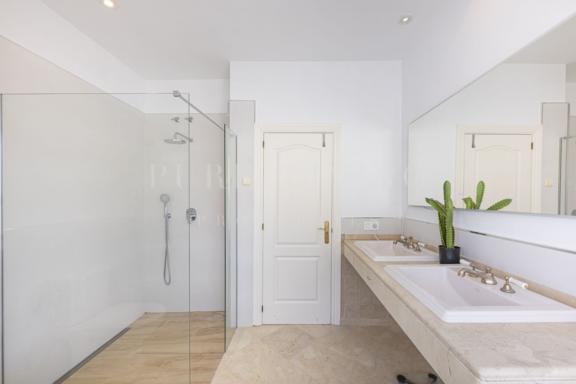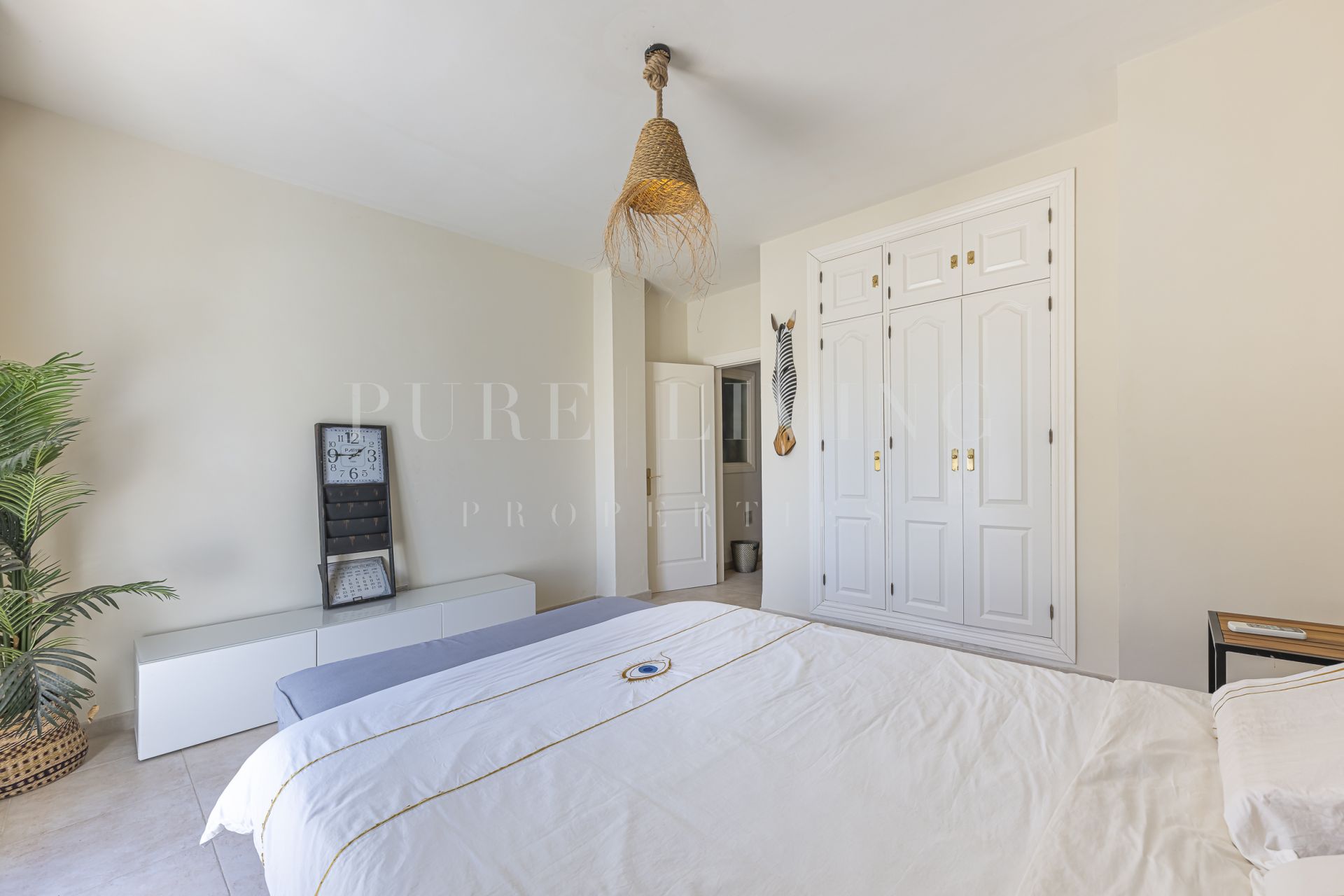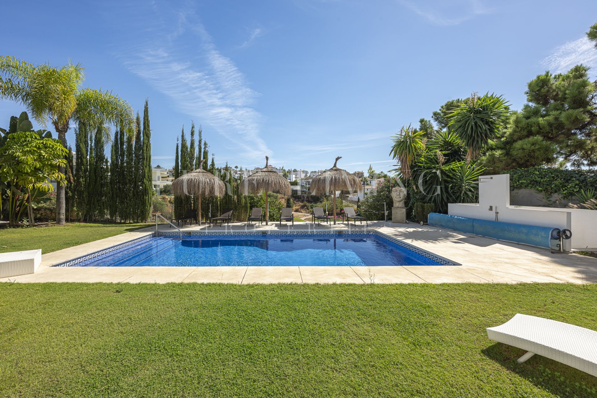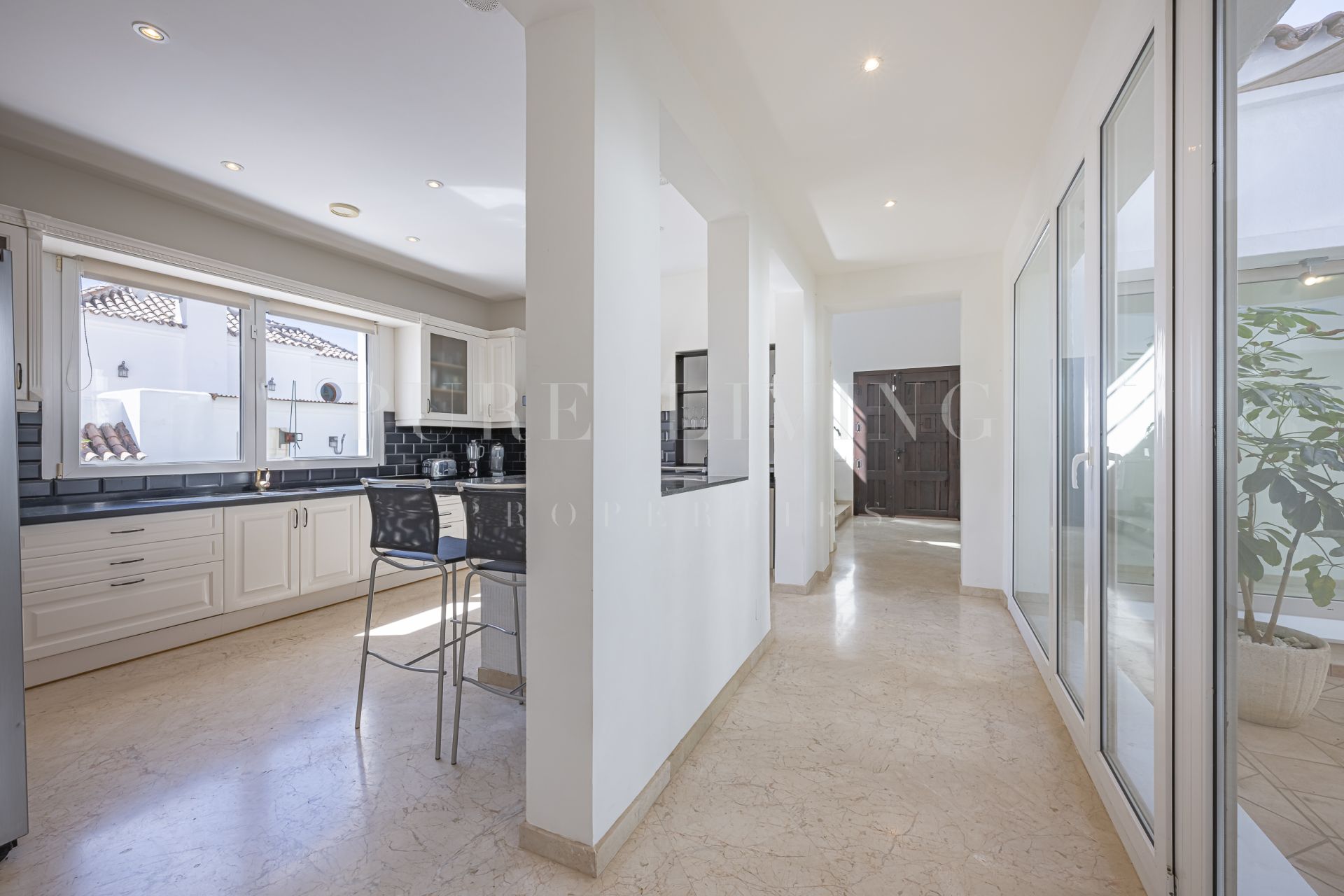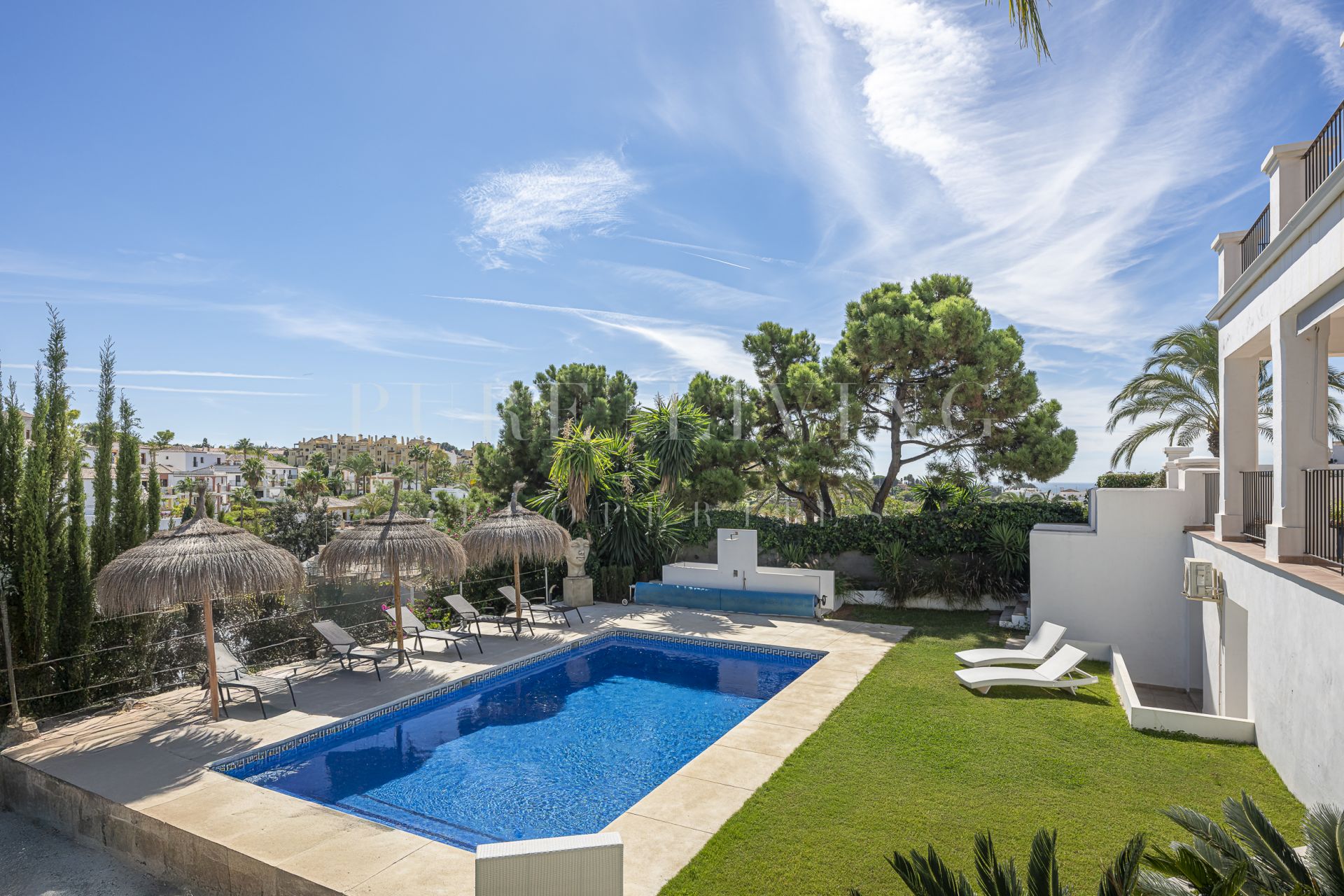 Rodeada de un exuberante jardín, esta villa cuenta con una piscina climatizada de agua salada y dos amplias terrazas, creando un entorno idílico para tomar el sol y relajarse con total privacidad.Idealmente situada entre Estepona y San Pedro de Alcántara, esta villa se encuentra a sólo 10 minutos a pie o a un corto trayecto en coche de la playa.Disfrute de un fácil acceso al vibrante centro de Estepona, al lujoso Puerto Banús y al aeropuerto de Málaga, todos a un corto trayecto en coche. Con una gran variedad de servicios cerca, incluyendo restaurantes, supermercados y un club de paddle, esta propiedad ofrece la mezcla perfecta de tranquilidad y comodidad.