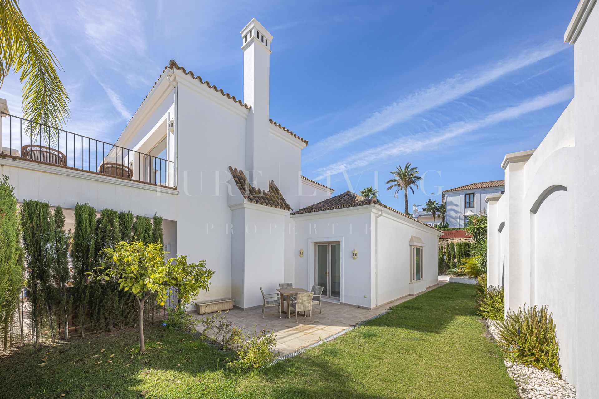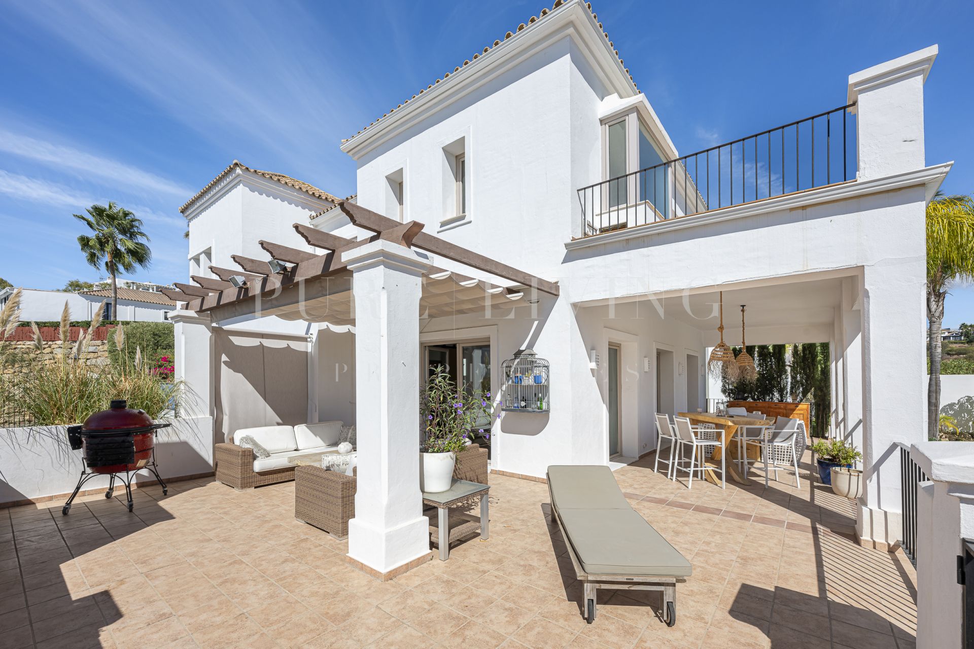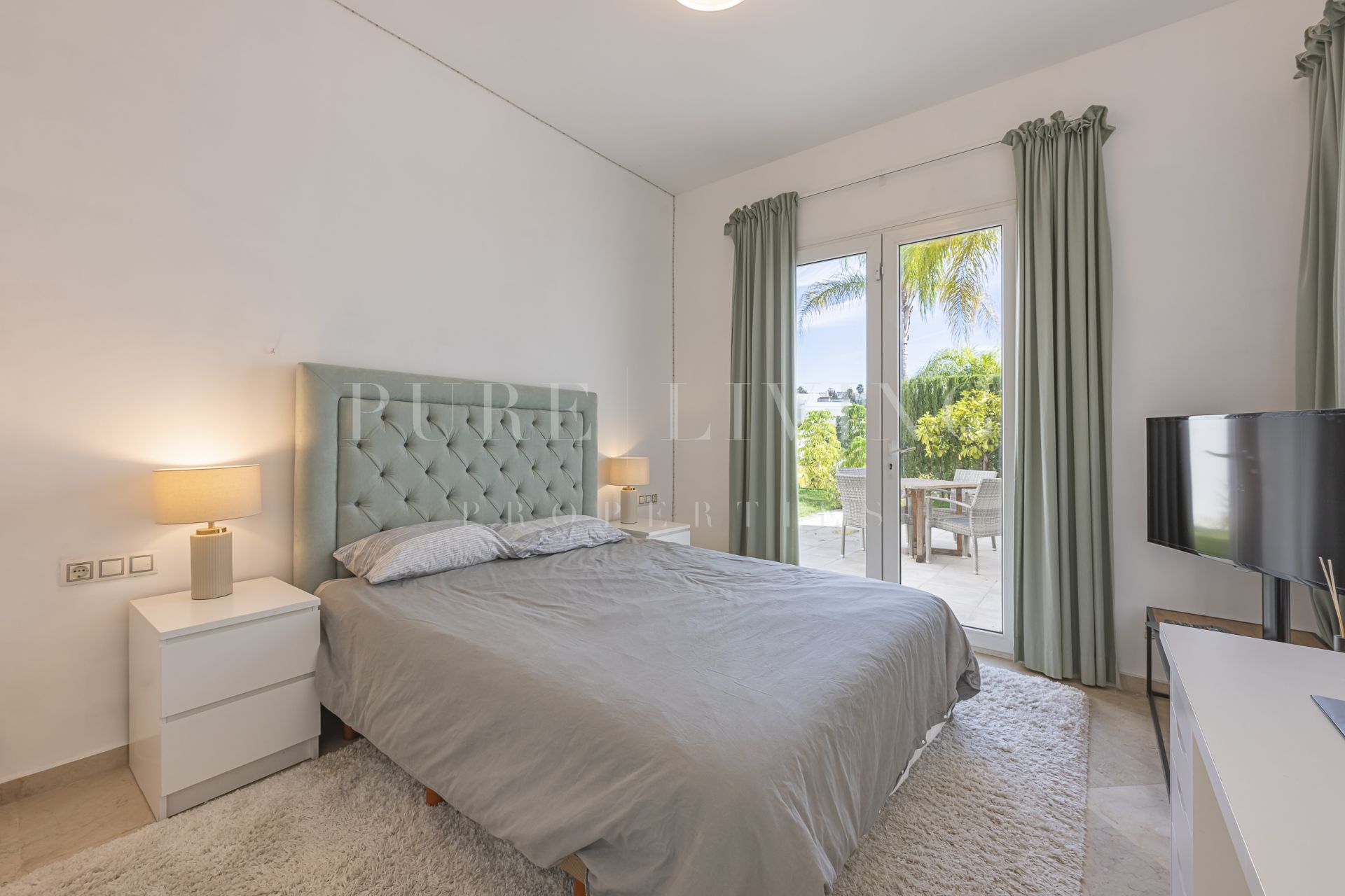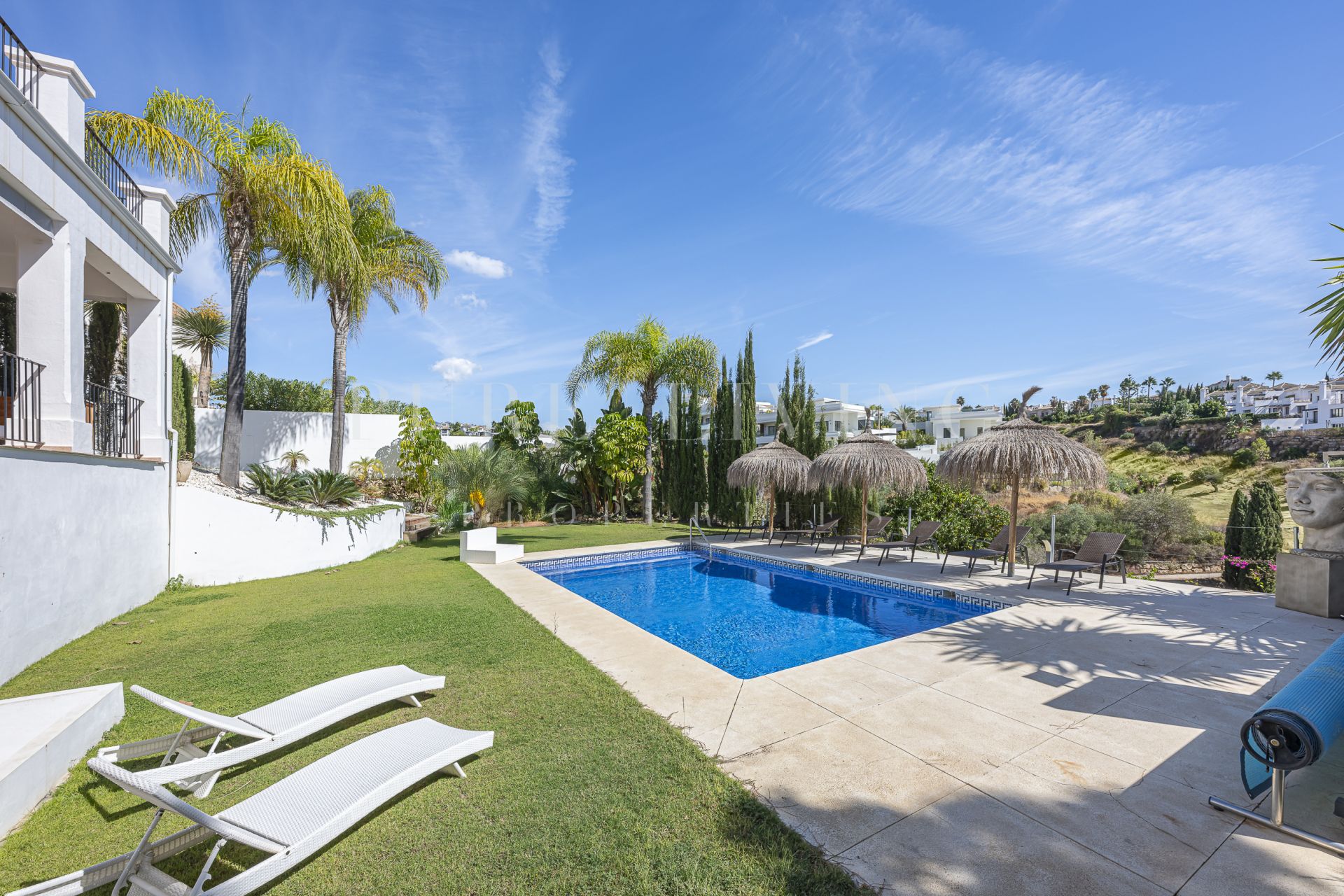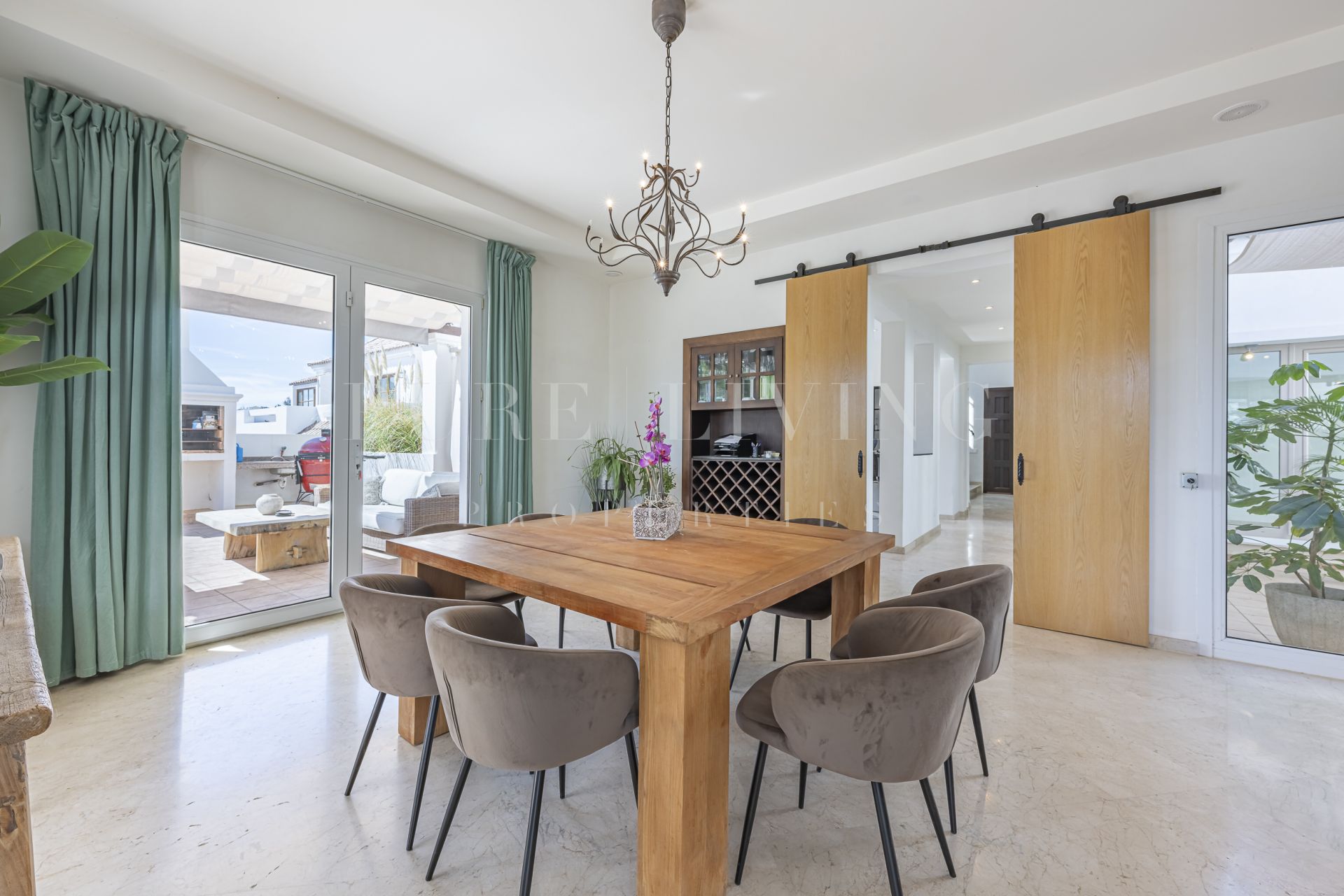 Rodeada de un exuberante jardín, esta villa cuenta con una piscina climatizada de agua salada y dos amplias terrazas, creando un entorno idílico para tomar el sol y relajarse con total privacidad.Idealmente situada entre Estepona y San Pedro de Alcántara, esta villa se encuentra a sólo 10 minutos a pie o a un corto trayecto en coche de la playa.Disfrute de un fácil acceso al vibrante centro de Estepona, al lujoso Puerto Banús y al aeropuerto de Málaga, todos a un corto trayecto en coche. Con una gran variedad de servicios cerca, incluyendo restaurantes, supermercados y un club de paddle, esta propiedad ofrece la mezcla perfecta de tranquilidad y comodidad.