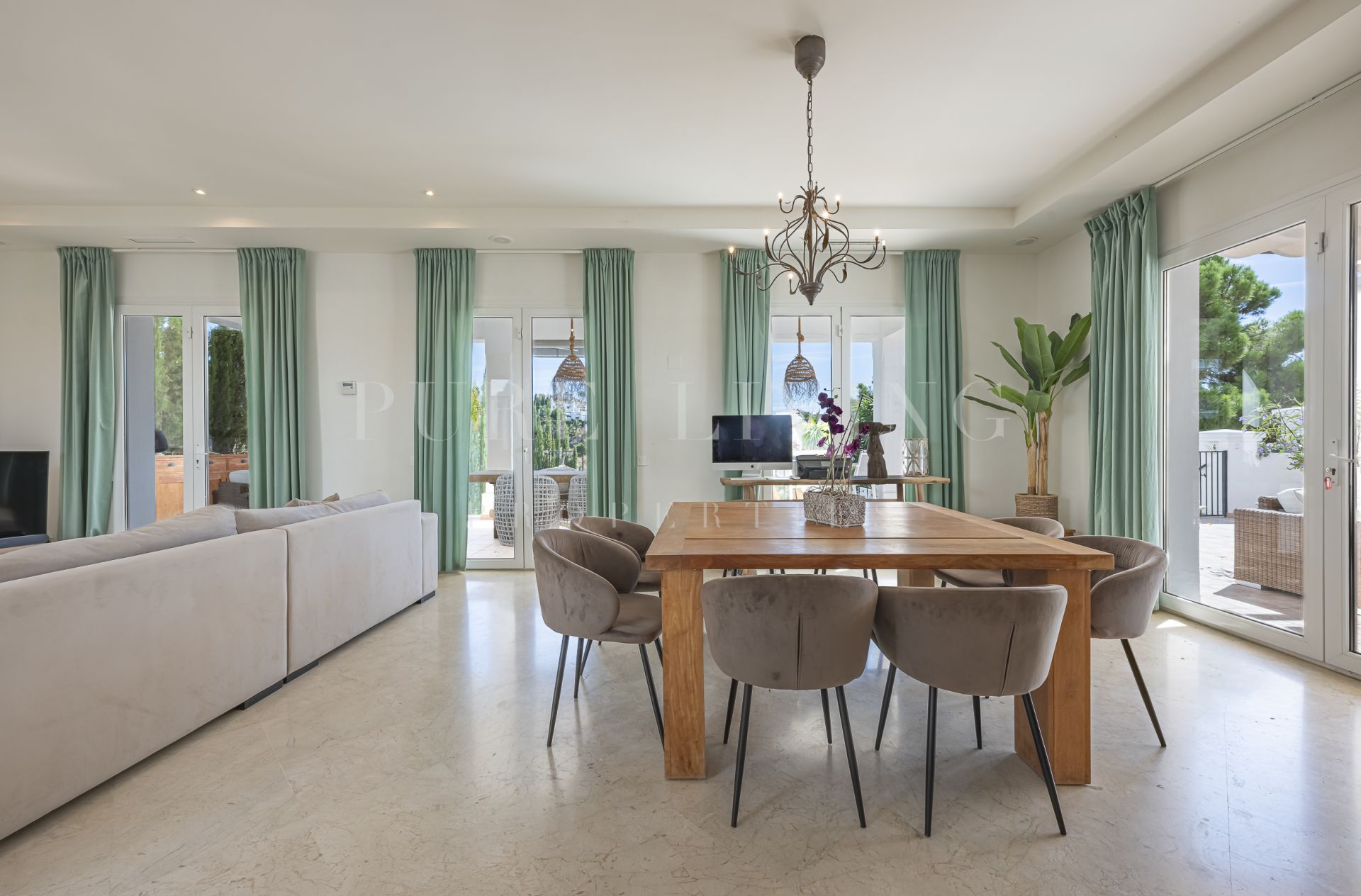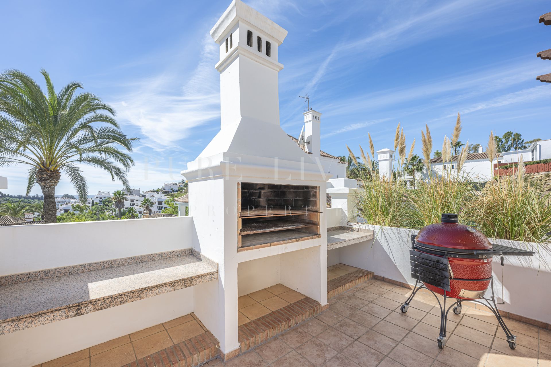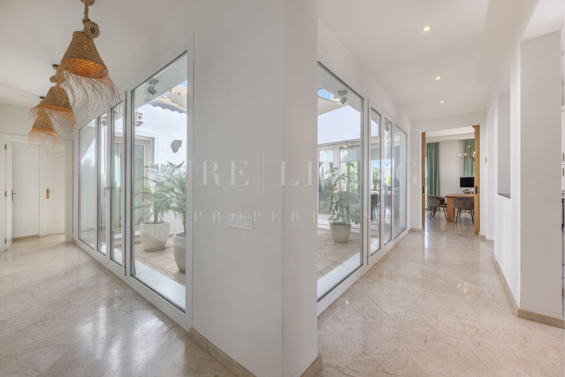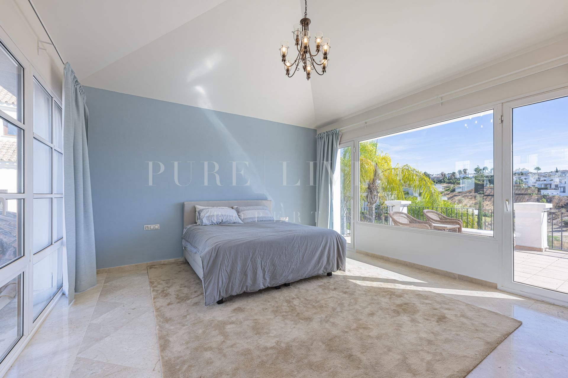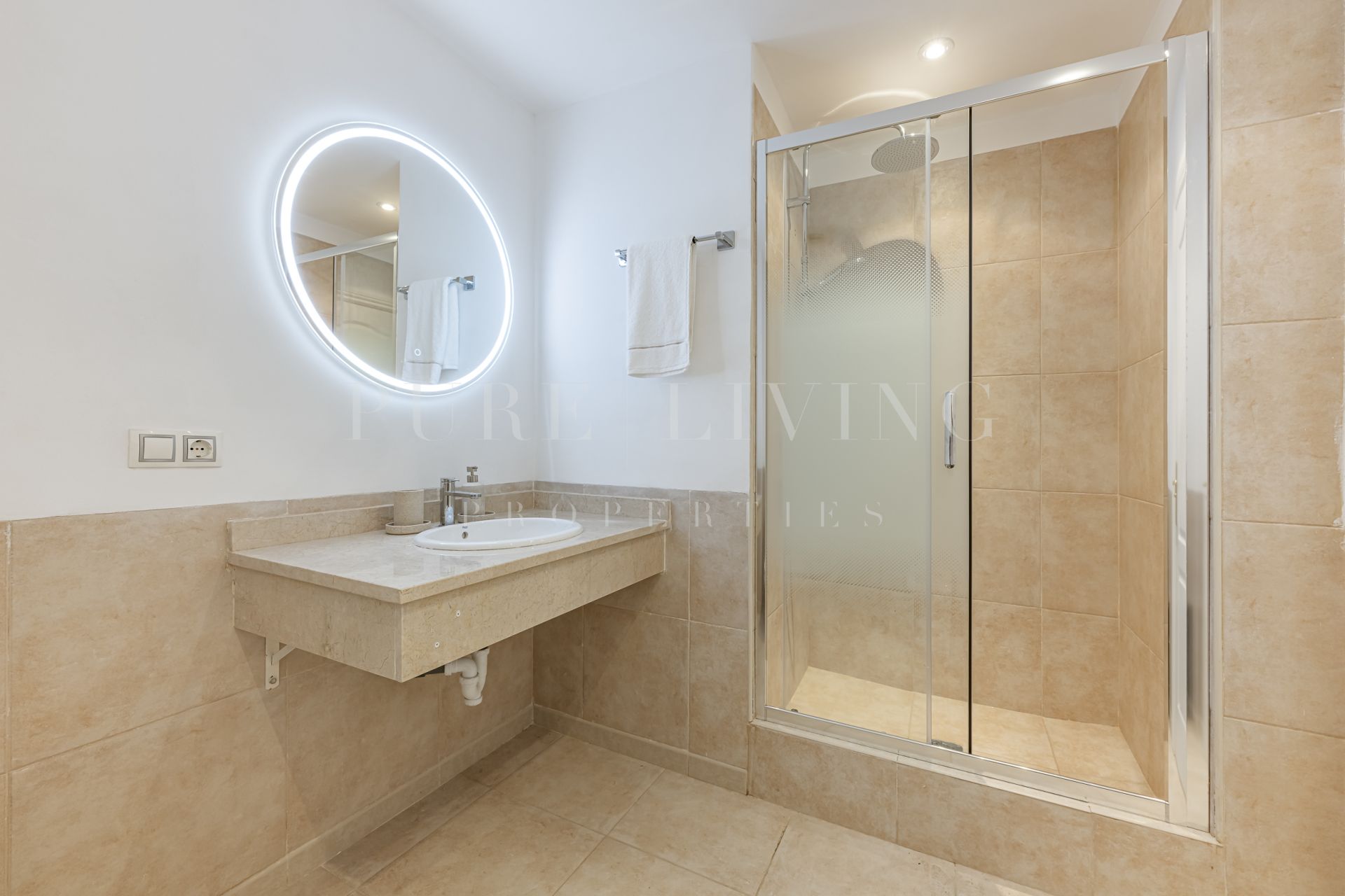 Rodeada de un exuberante jardín, esta villa cuenta con una piscina climatizada de agua salada y dos amplias terrazas, creando un entorno idílico para tomar el sol y relajarse con total privacidad.Idealmente situada entre Estepona y San Pedro de Alcántara, esta villa se encuentra a sólo 10 minutos a pie o a un corto trayecto en coche de la playa.Disfrute de un fácil acceso al vibrante centro de Estepona, al lujoso Puerto Banús y al aeropuerto de Málaga, todos a un corto trayecto en coche. Con una gran variedad de servicios cerca, incluyendo restaurantes, supermercados y un club de paddle, esta propiedad ofrece la mezcla perfecta de tranquilidad y comodidad.