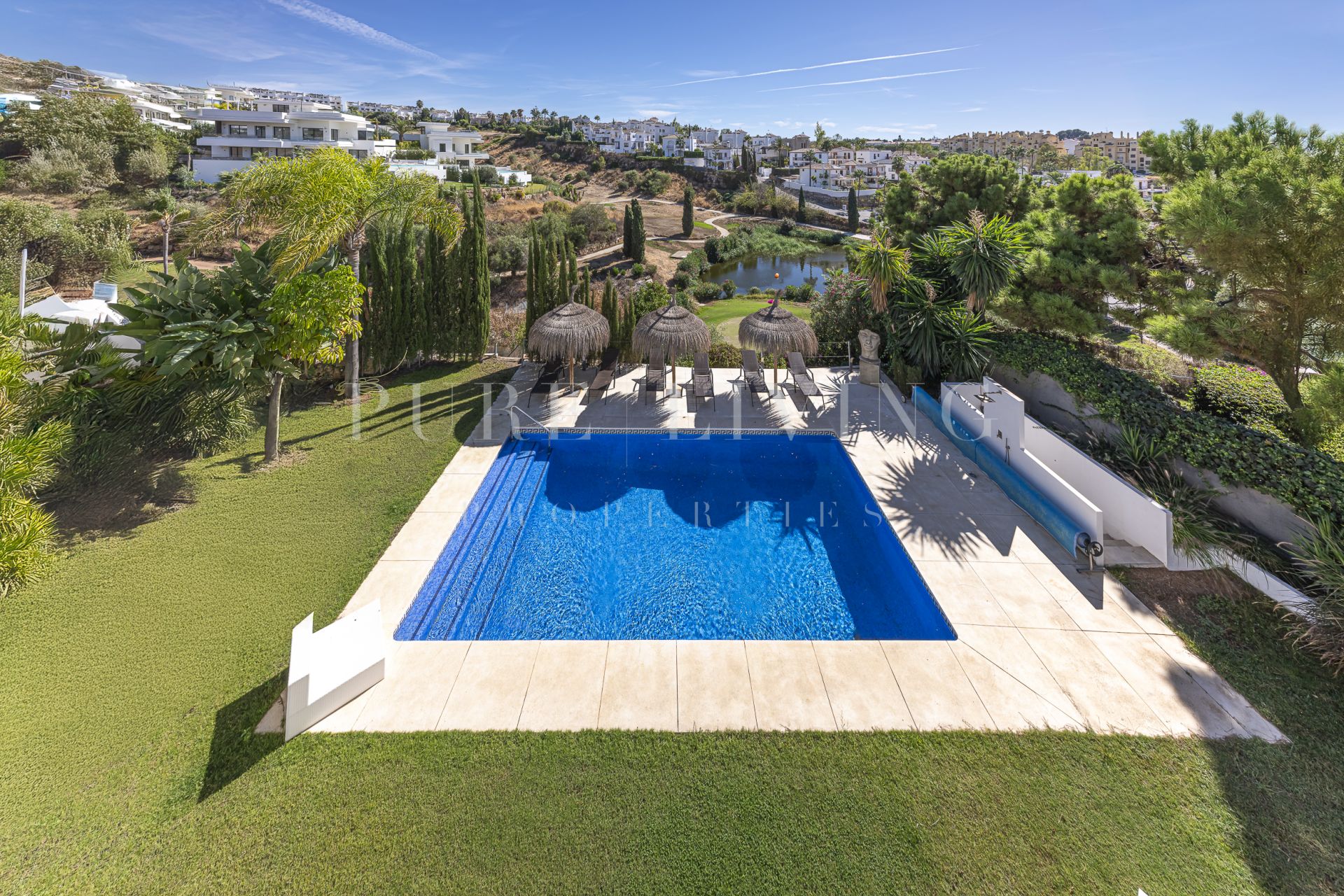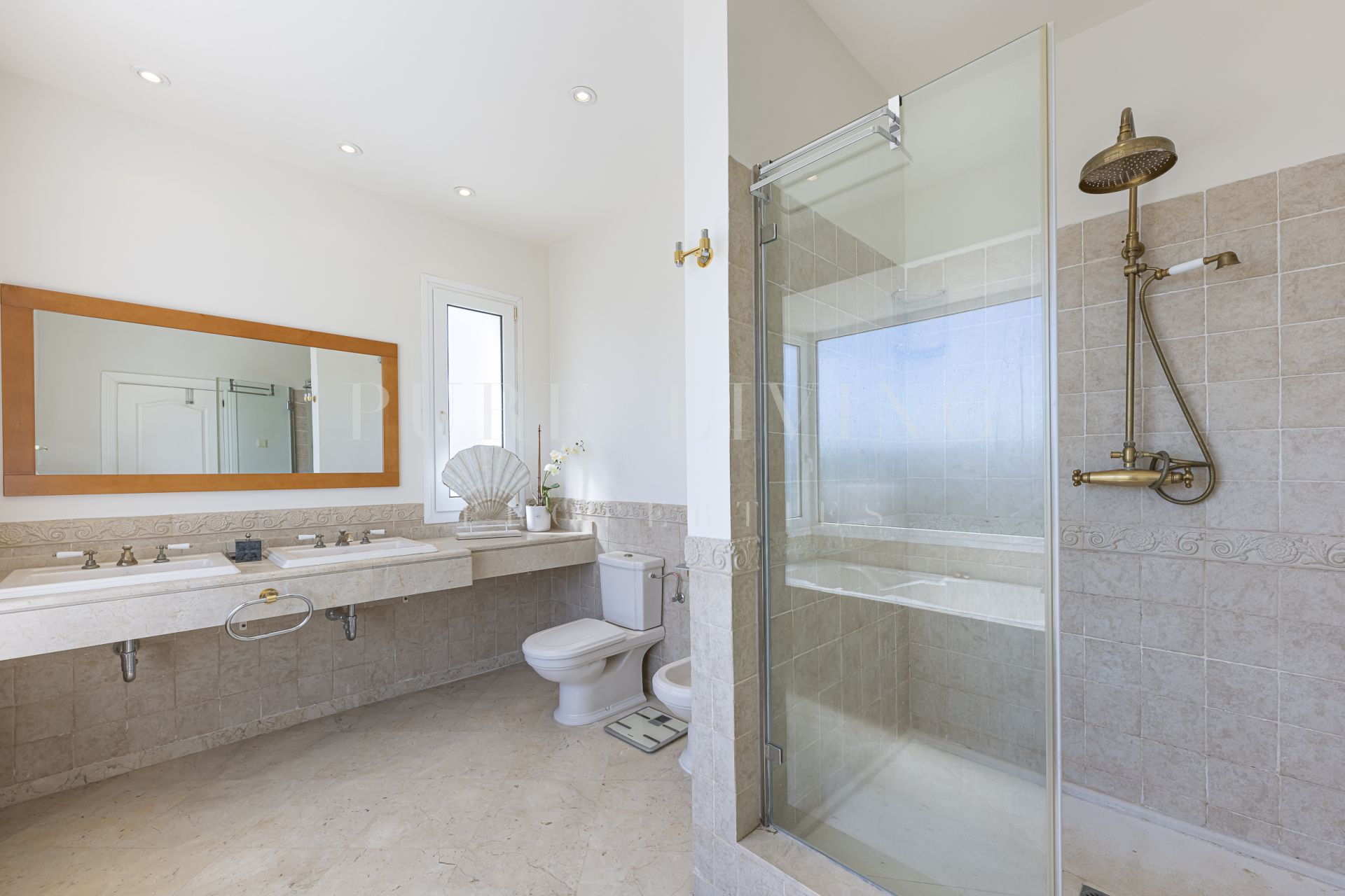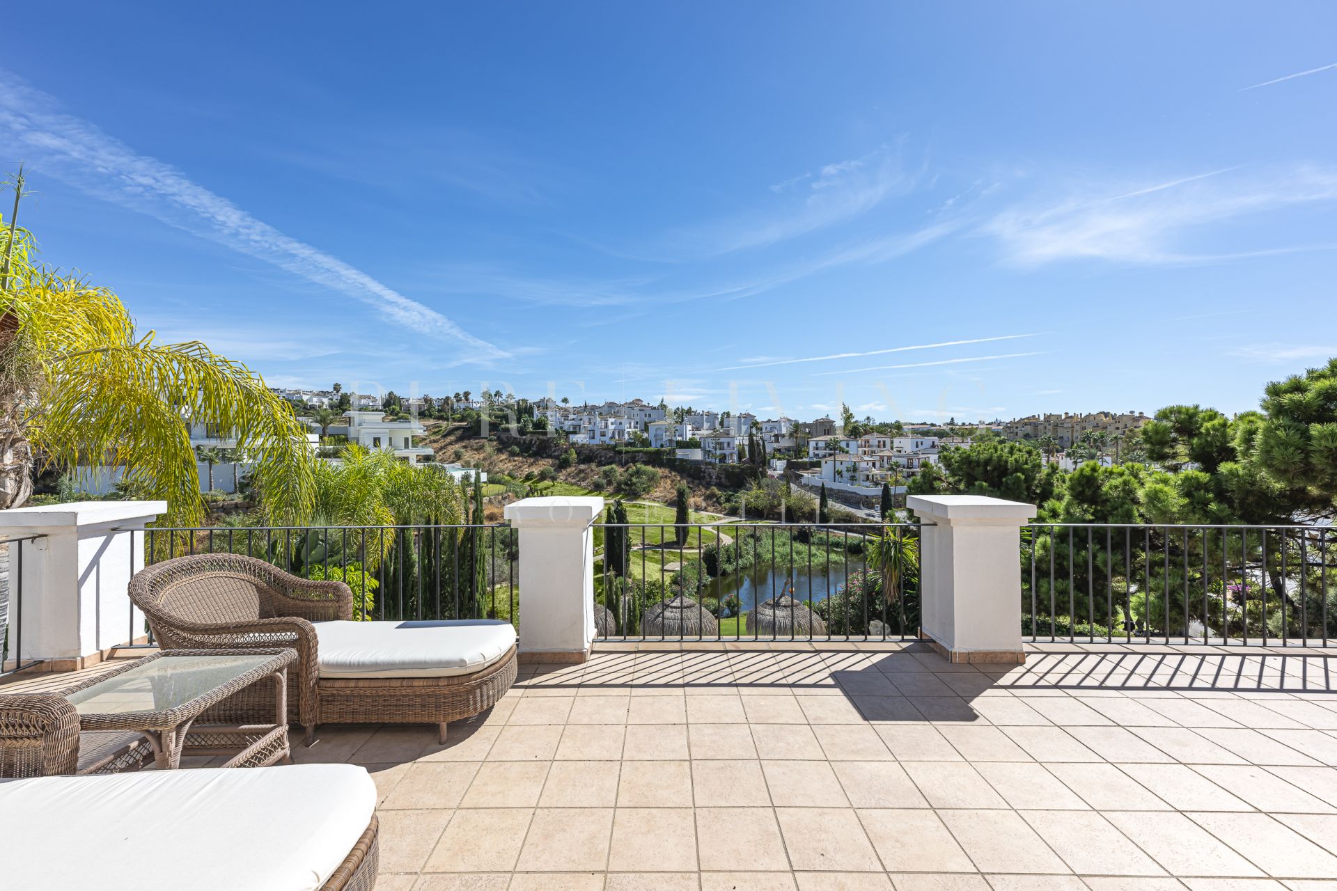 Terraza privada, Salón, Piscina de agua salada, Vistas al golf, Piscina climatizada, Riego automático, Lavadero, Terraza cubierta, Armarios empotrados, Vistas al jardín, Vistas a la piscina, Vistas panorámicas, Primera linea de golf, Aire acondicionado, Suelo radiante (baños), Cocina totalmente equipada, Chimenea, Suelos de mármol, Cerca del golf, Terraza descubierta, Sótano, Sala de invitados, Almacén, Alarma, Cristal doble, Comedor, Buen estado, Barbacoa, Aseo para invitados.