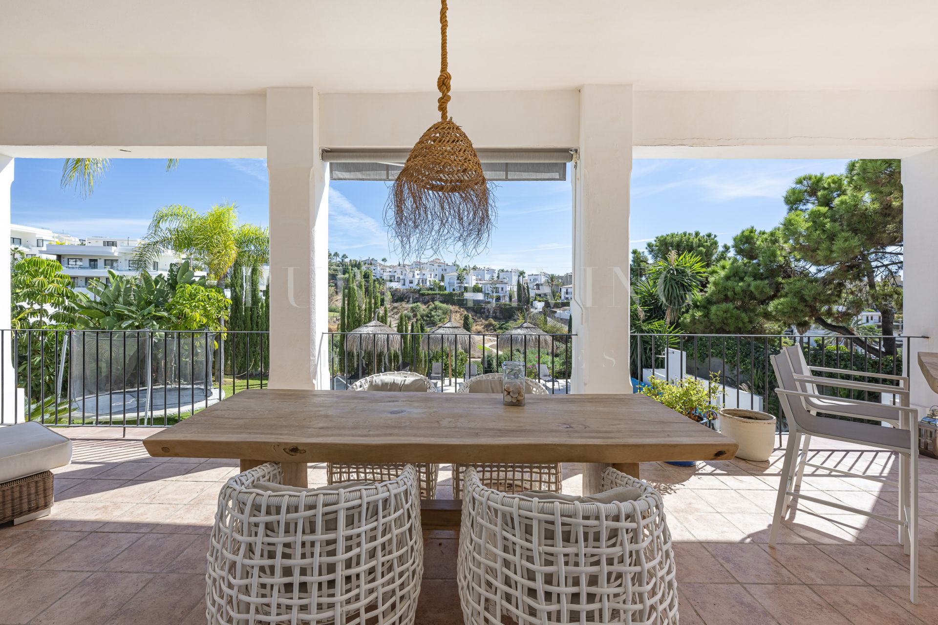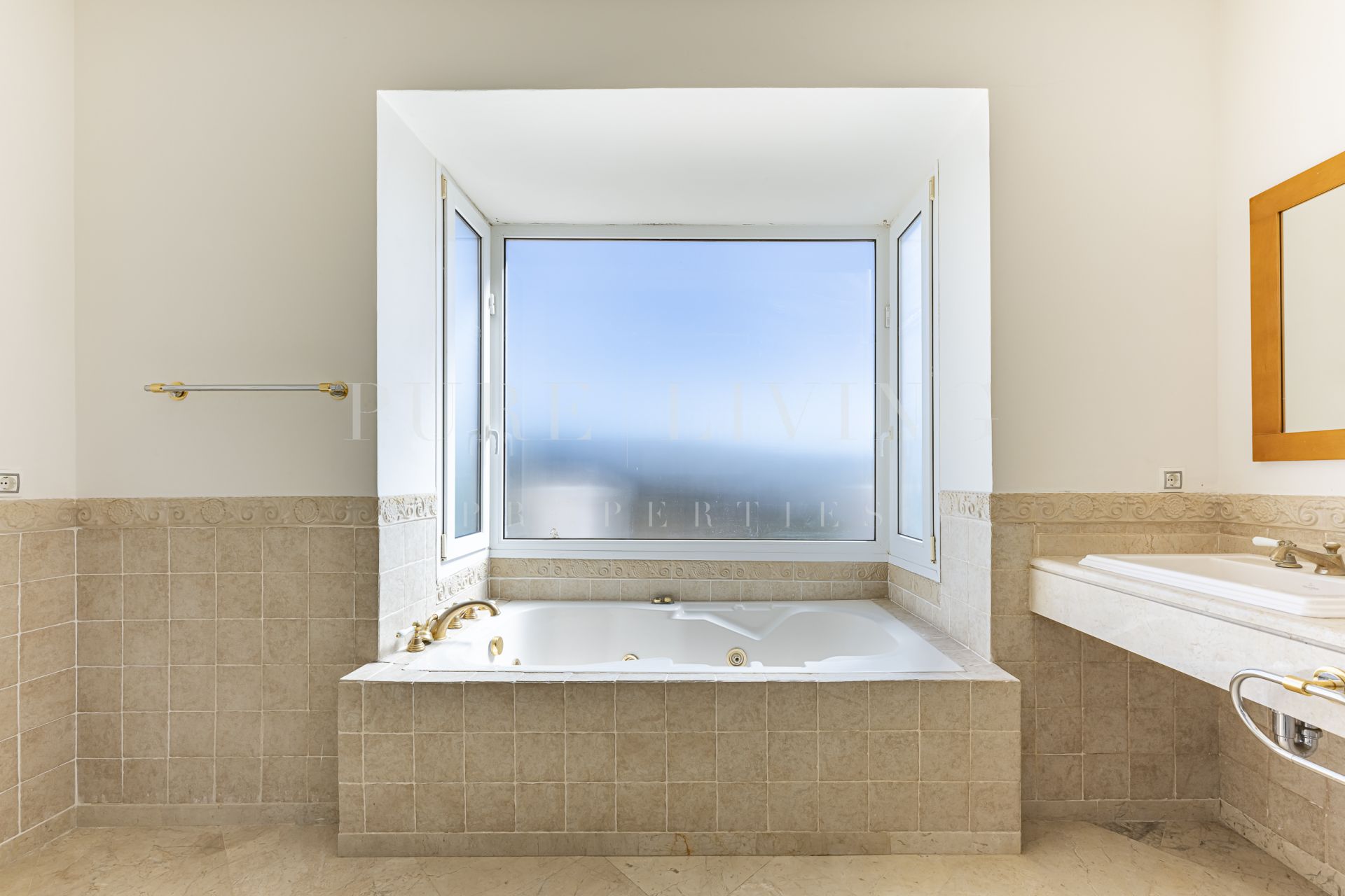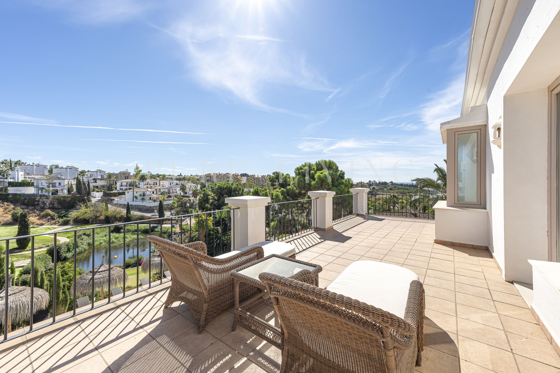 Terraza privada, Salón, Piscina de agua salada, Vistas al golf, Piscina climatizada, Riego automático, Lavadero, Terraza cubierta, Armarios empotrados, Vistas al jardín, Vistas a la piscina, Vistas panorámicas, Primera linea de golf, Aire acondicionado, Suelo radiante (baños), Cocina totalmente equipada, Chimenea, Suelos de mármol, Cerca del golf, Terraza descubierta, Sótano, Sala de invitados, Almacén, Alarma, Cristal doble, Comedor, Buen estado, Barbacoa, Aseo para invitados.