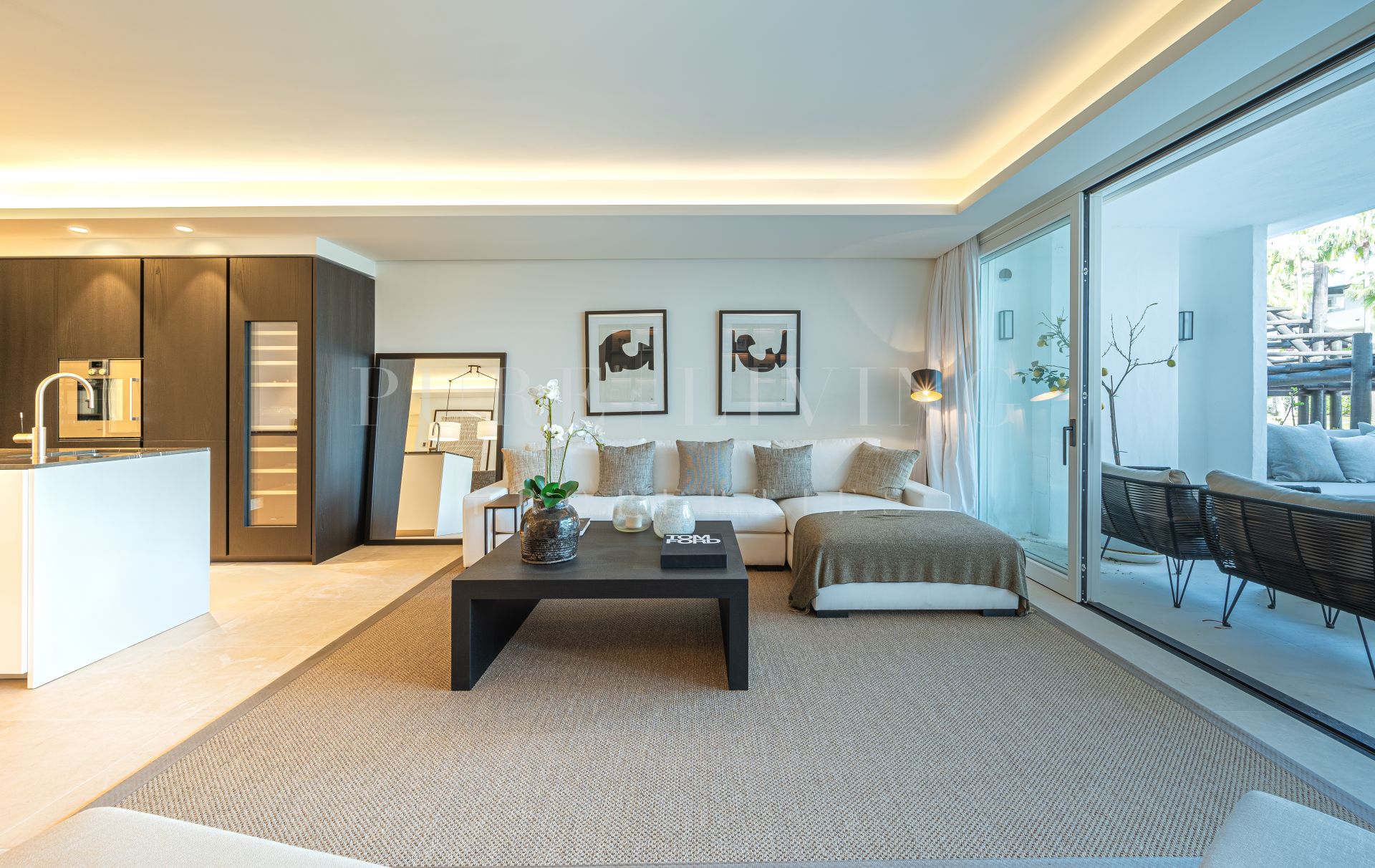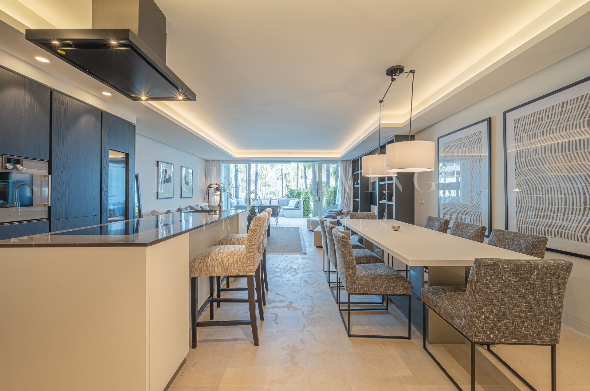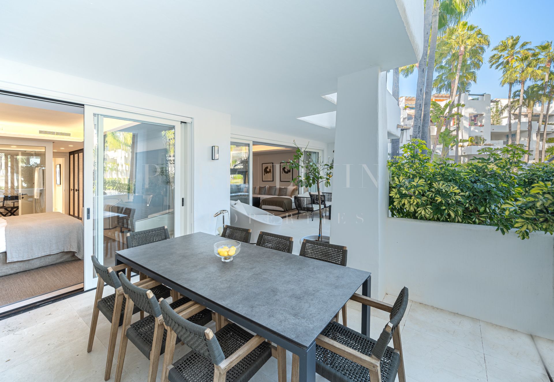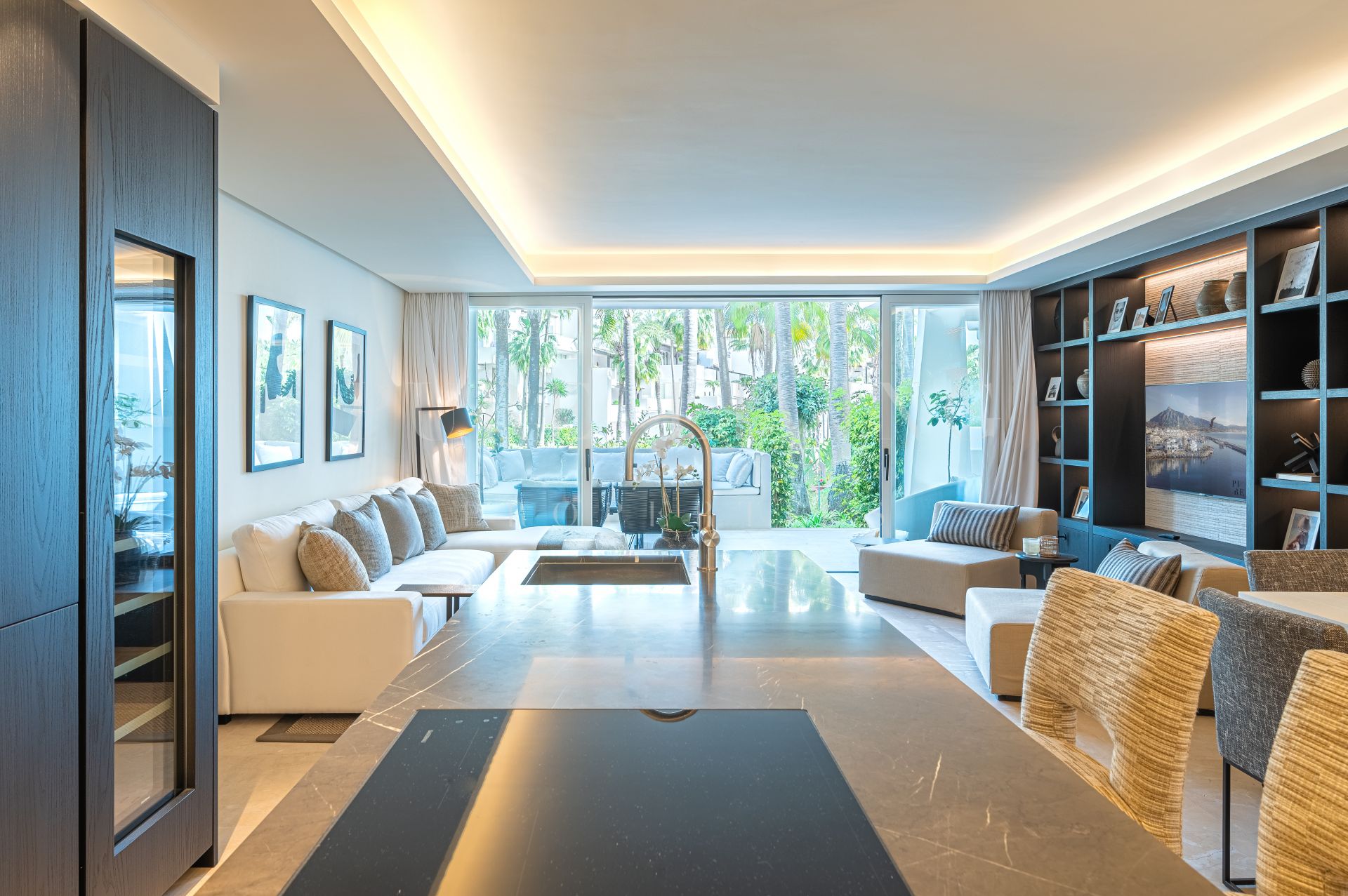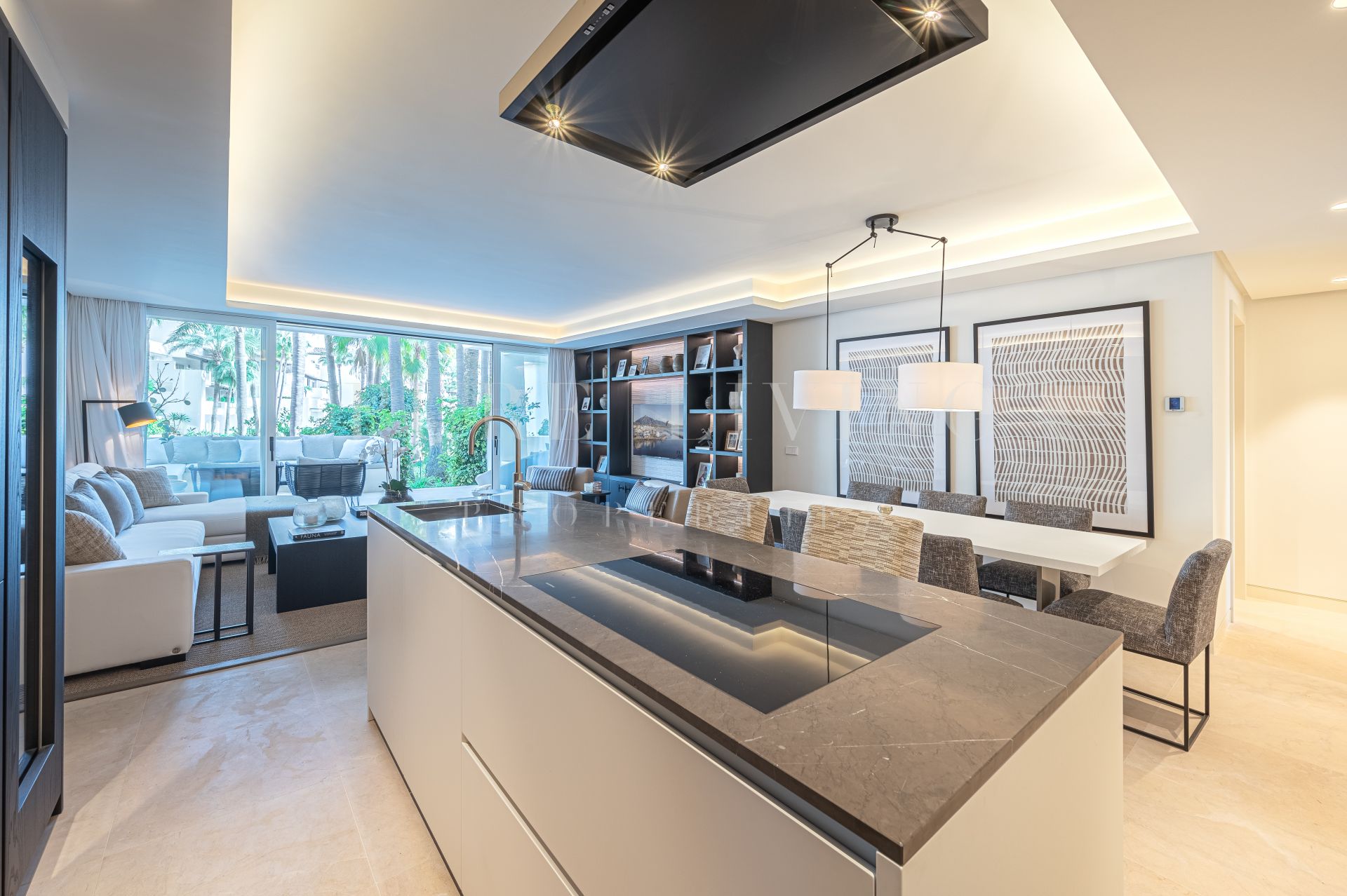 Situado en la planta baja, el apartamento cuenta con una gran entrada que conduce a una cocina de diseño moderno y elegante equipada con los últimos electrodomésticos Gaggenau. La cocina abierta, el comedor y el salón están diseñados para aprovechar al máximo la luz natural y conducen a una amplia terraza semicubierta con zonas de estar, chill y comedor al aire libre. La terraza tiene acceso directo a los exuberantes jardines y la piscina, proporcionando un escenario perfecto para la relajación y el entretenimiento.
