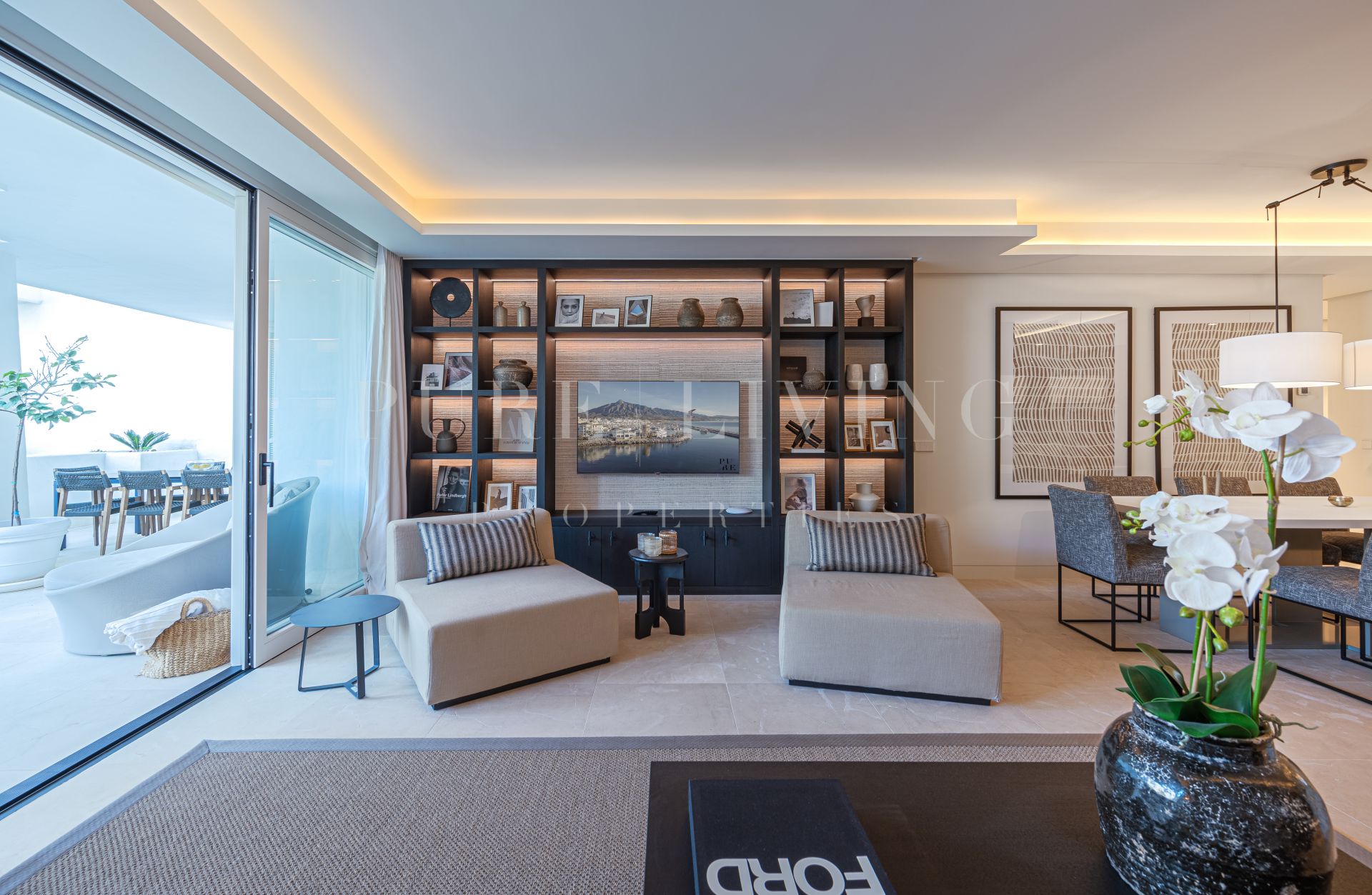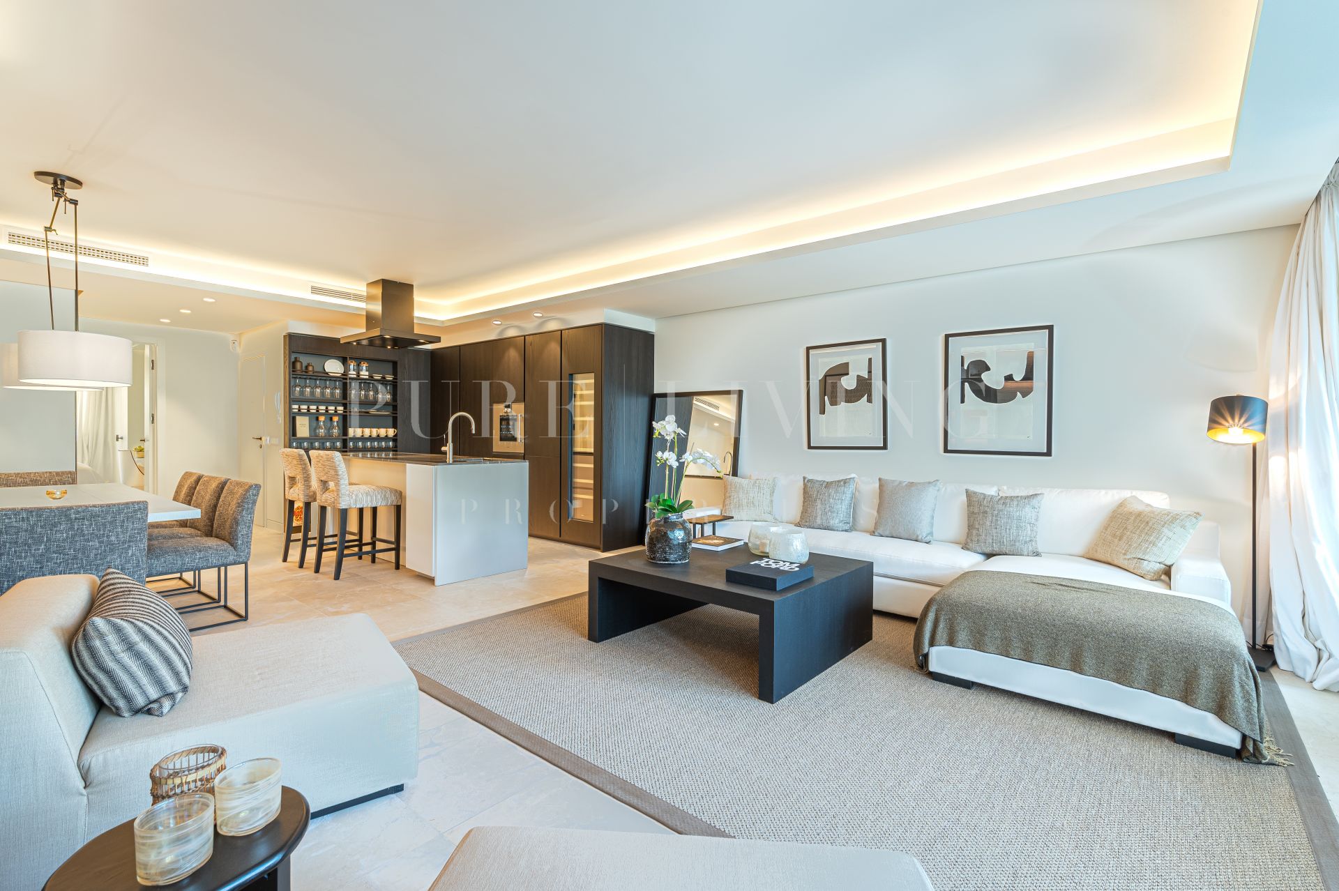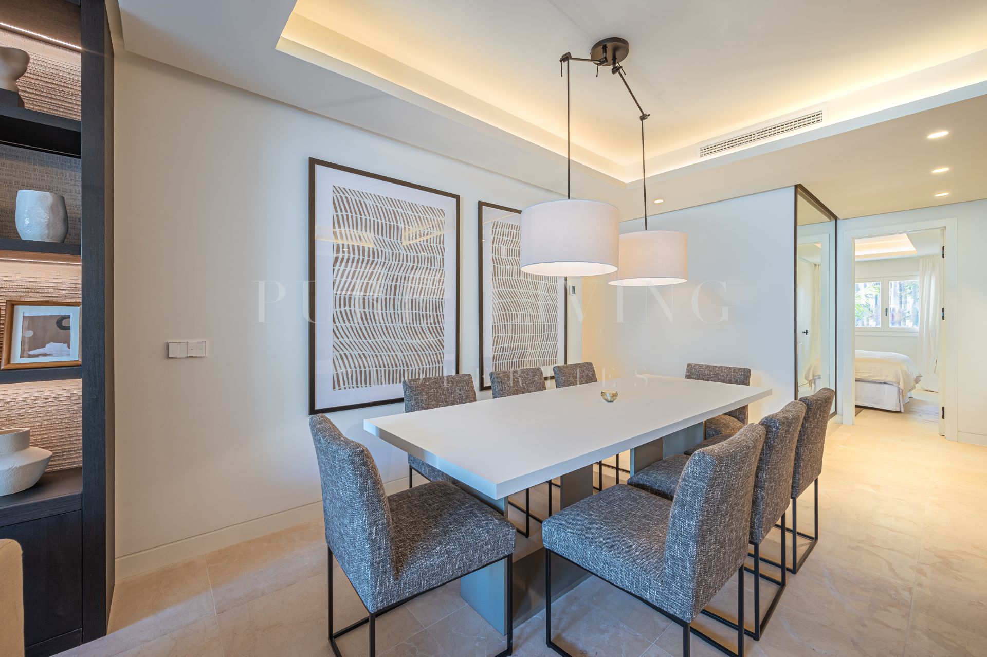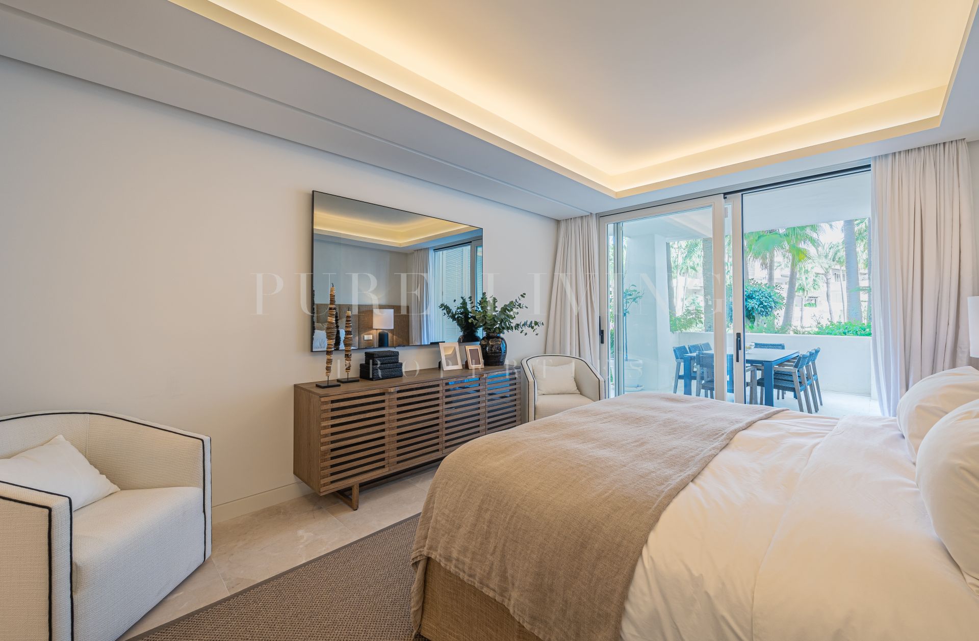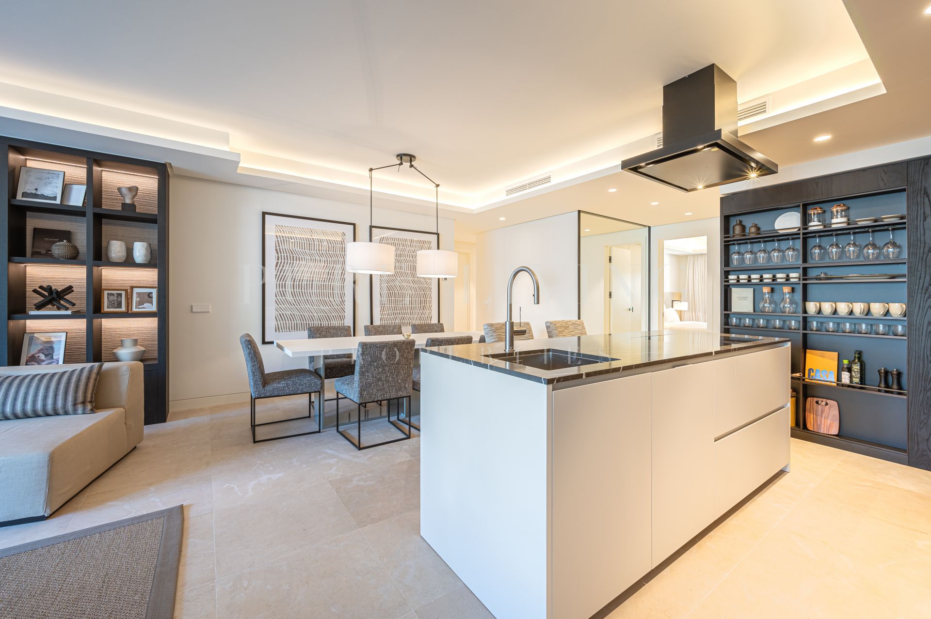 Situado en la planta baja, el apartamento cuenta con una gran entrada que conduce a una cocina de diseño moderno y elegante equipada con los últimos electrodomésticos Gaggenau. La cocina abierta, el comedor y el salón están diseñados para aprovechar al máximo la luz natural y conducen a una amplia terraza semicubierta con zonas de estar, chill y comedor al aire libre. La terraza tiene acceso directo a los exuberantes jardines y la piscina, proporcionando un escenario perfecto para la relajación y el entretenimiento.