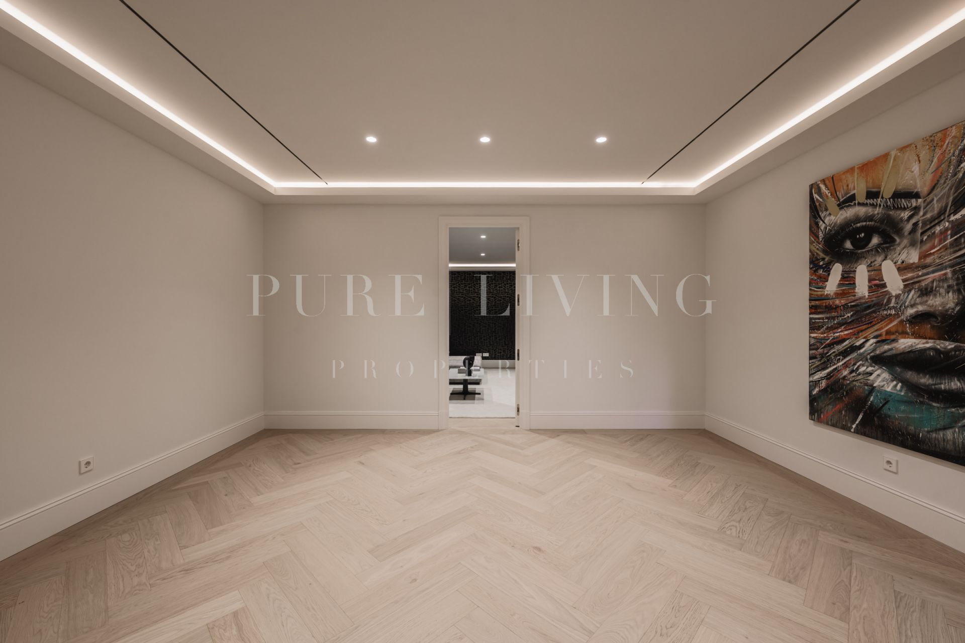 La planta baja se despliega como un espectáculo de entretenimiento y vida de lujo. Una sala de ocio de generosas proporciones cuenta con una elegante zona de bar, un home cinema con un sistema de sonido de última generación y un gimnasio climatizado, que garantizan el máximo disfrute a sus exigentes residentes.